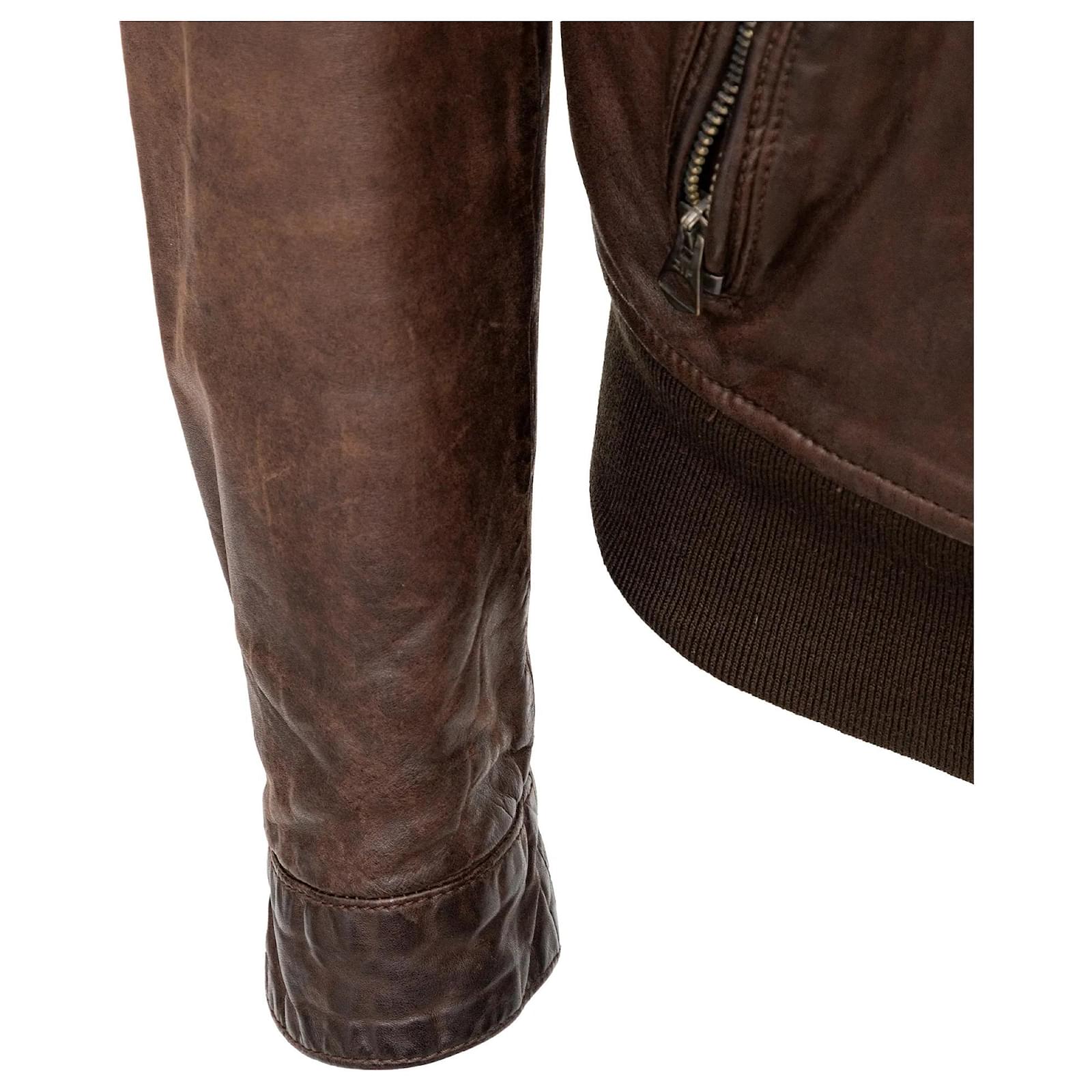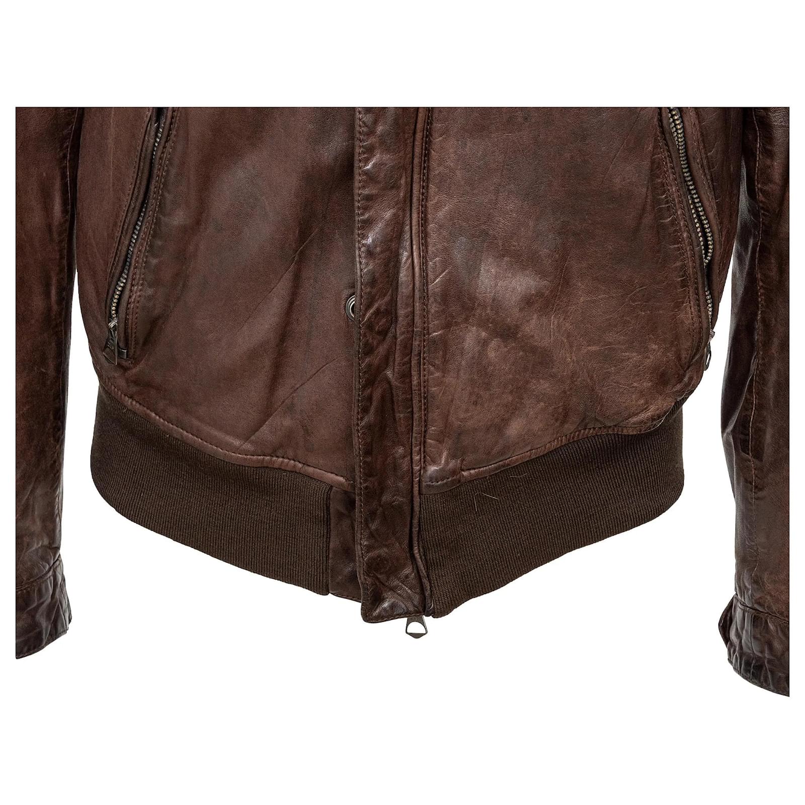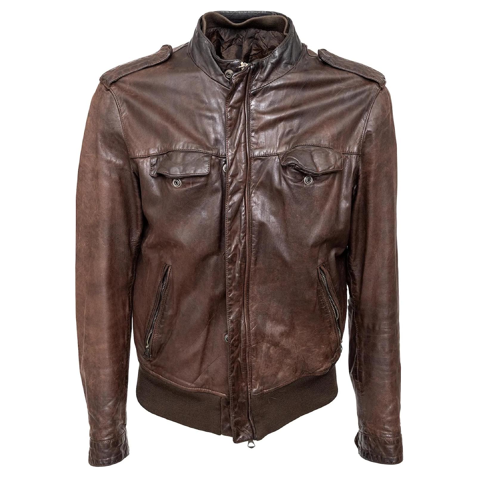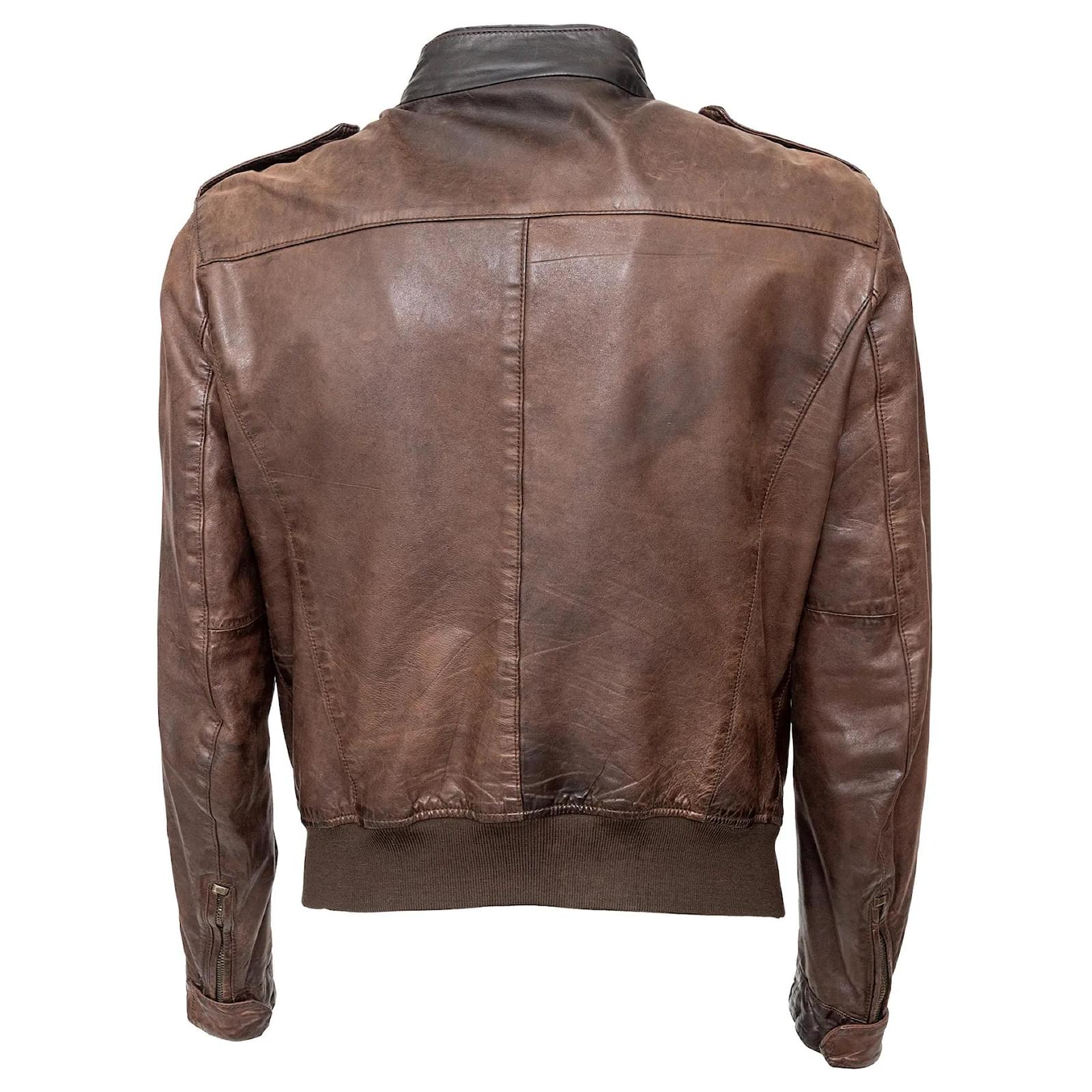 Vintage brown leather jacket, perfect for mid-season daily wear. Features zipper closure, snap buttons, multiple pockets, and ribbed hem for a sleek fit.