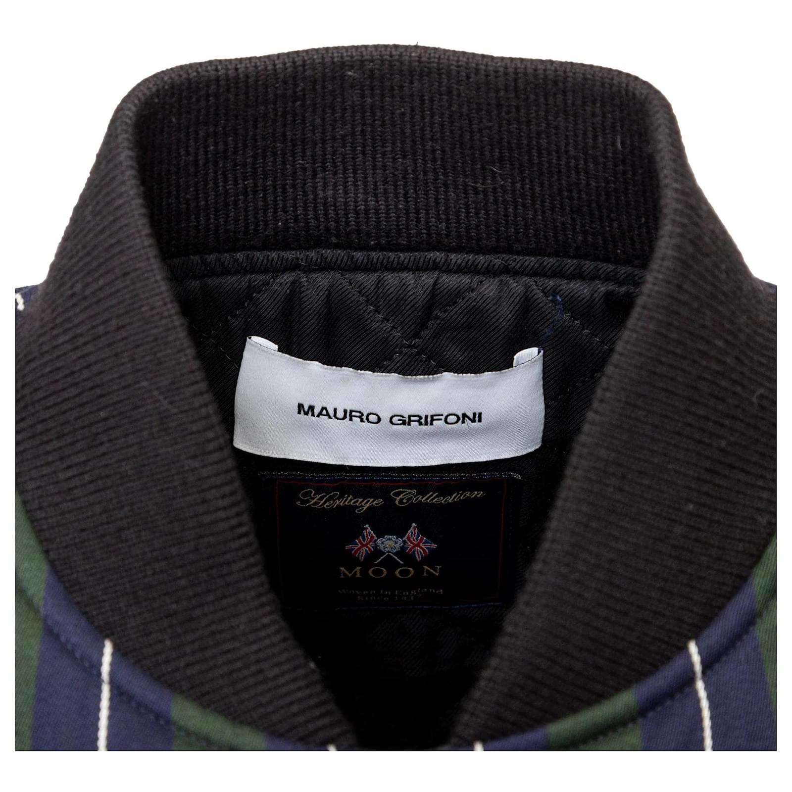 Multicolor stripe bomber jacket by Mauro Grifoni from the Moon Heritage collection. Wool-cotton blend with quilted lining, snap buttons, and ribbed black trims.