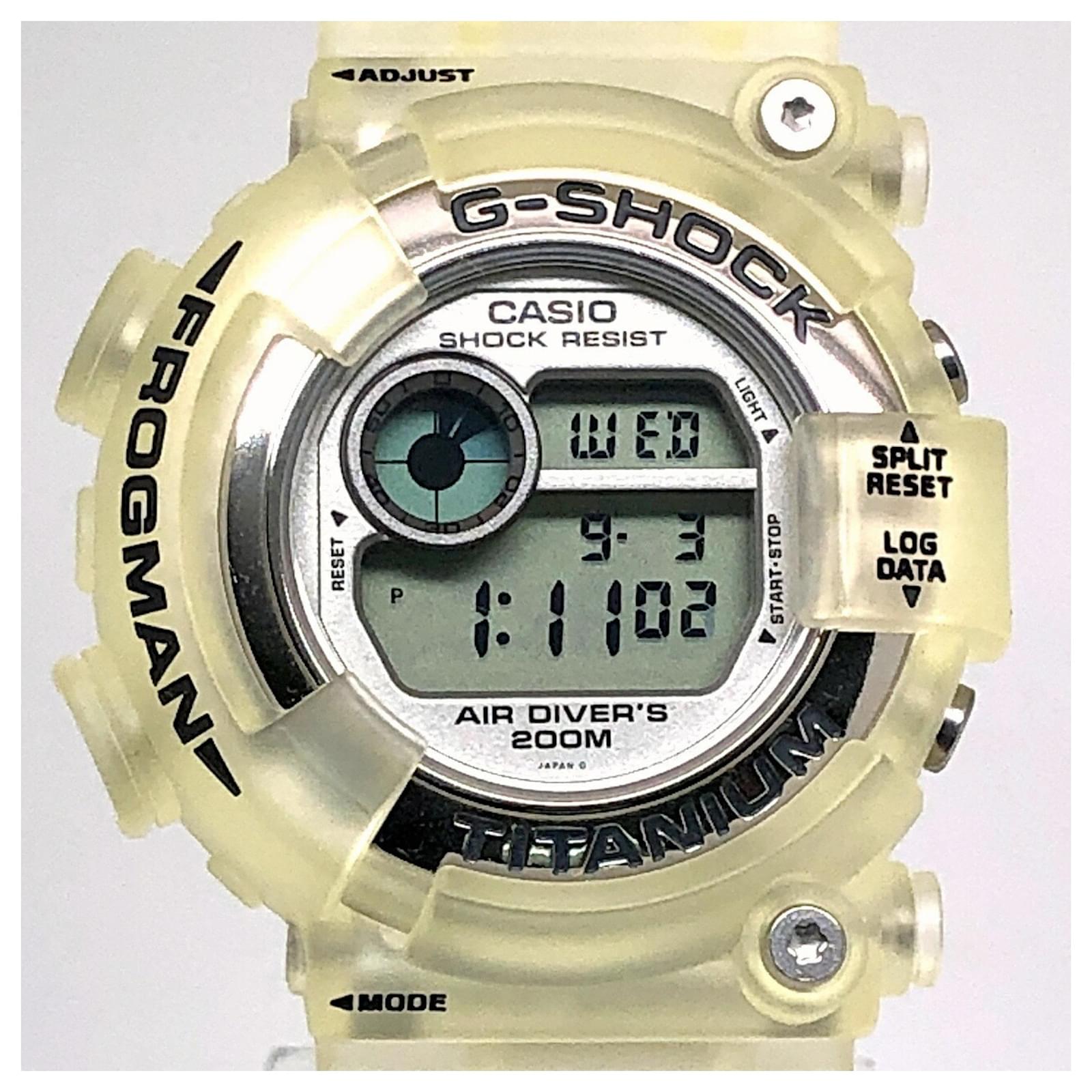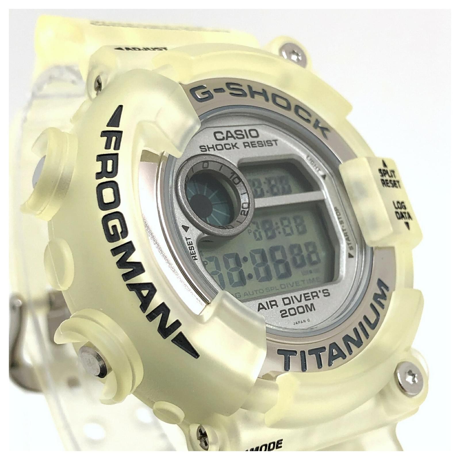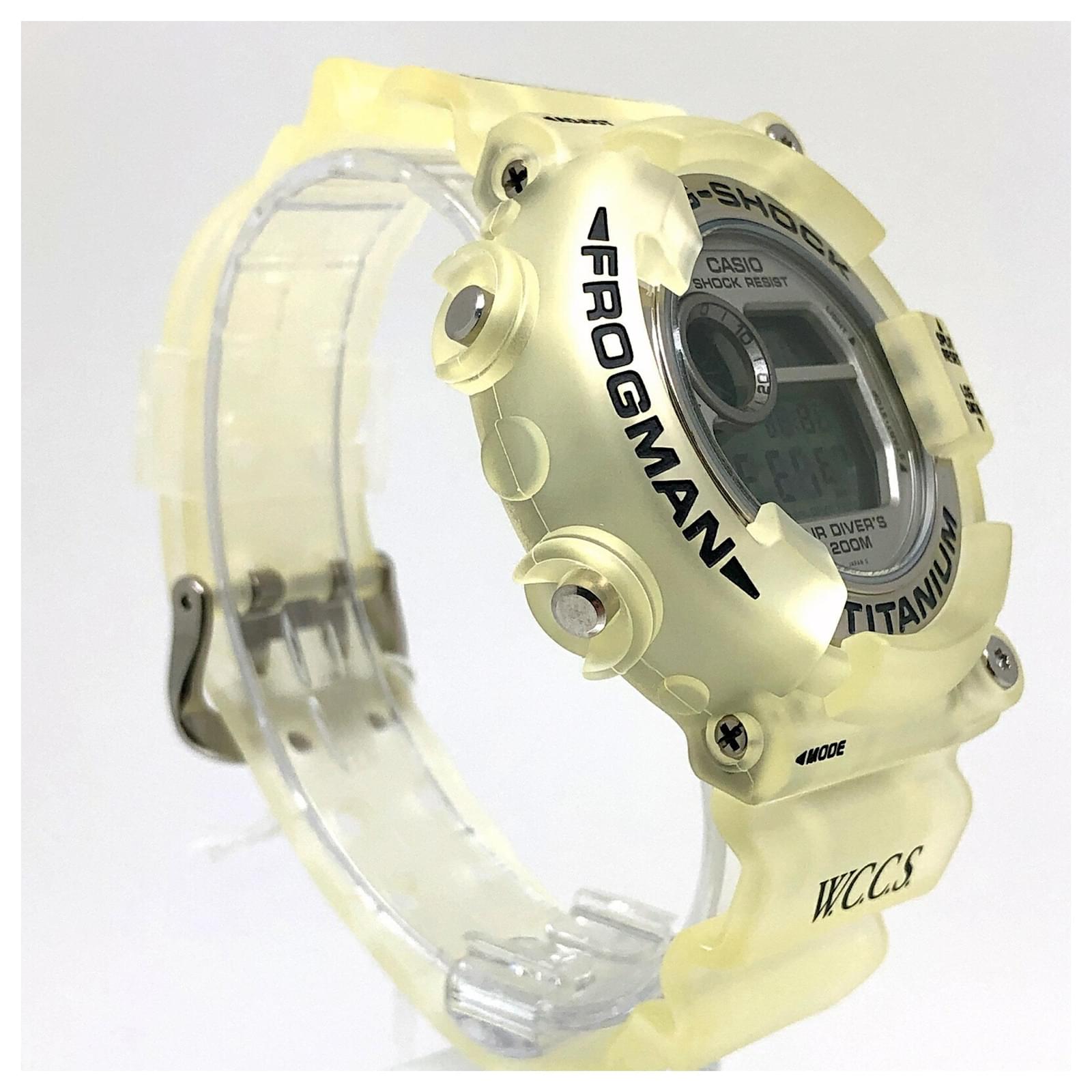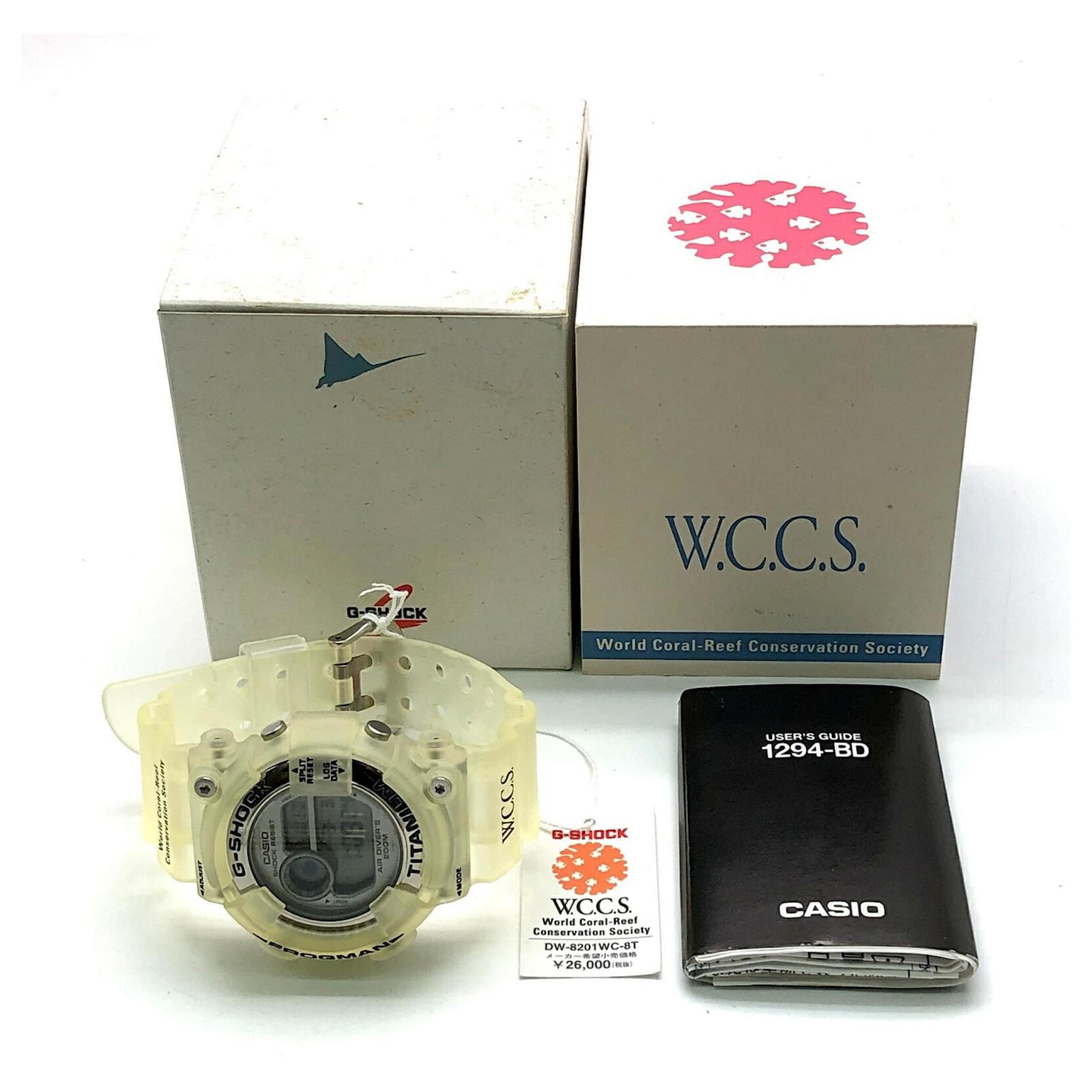 The Casio G-Shock DW-8201WC-8T Frogman is a digital wristwatch made from titanium with a clear display. It features a white skeleton design accented by a black case. Released in June 1998 and associated with the World Coral Reef Conservation Society, this model exemplifies durable and stylish craftsmanship. The watch is sold in used but like new condition, classified as Rank S, indicating it has insignificant bezel and bracelet scratches, while overall discoloration is present. Included with the watch are its inner box, manual, and outer box. Buyers are encouraged to refer to images for a precise understanding of the item’s condition.