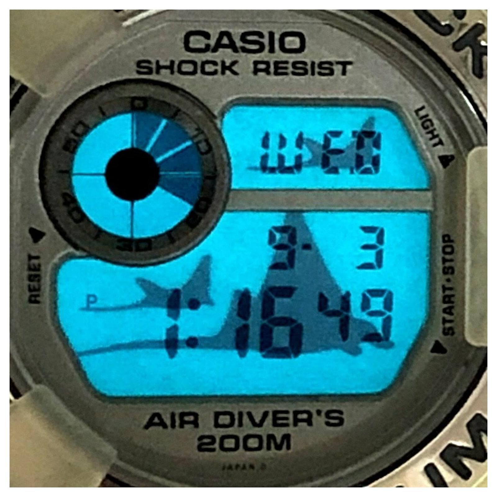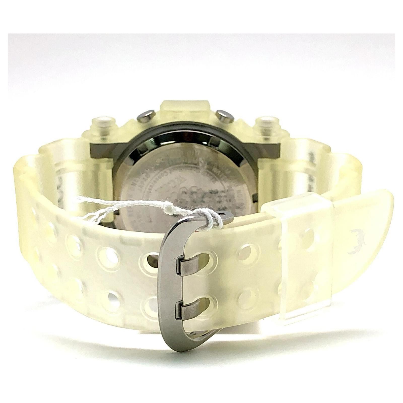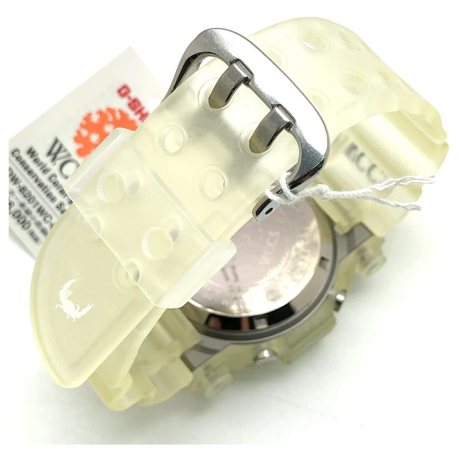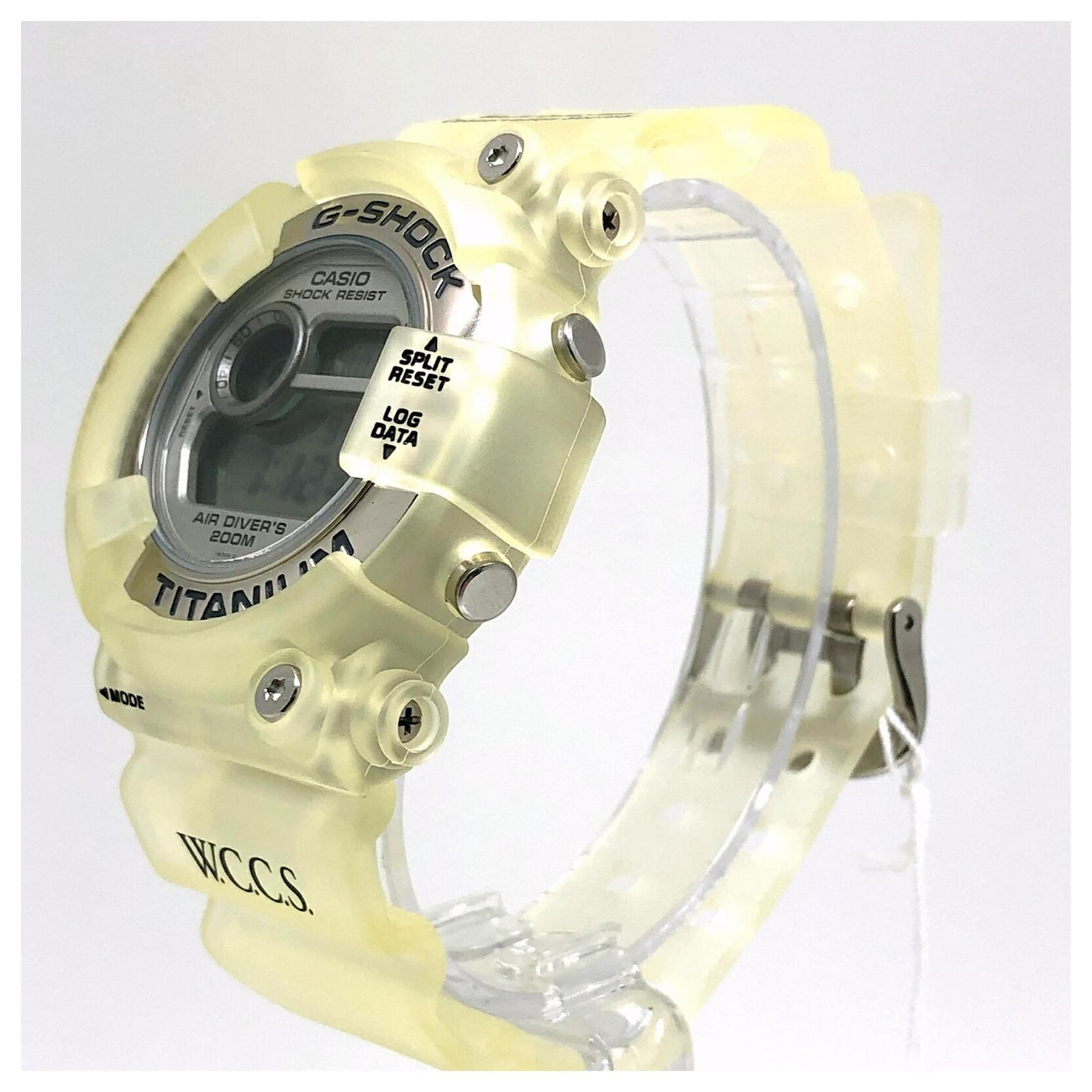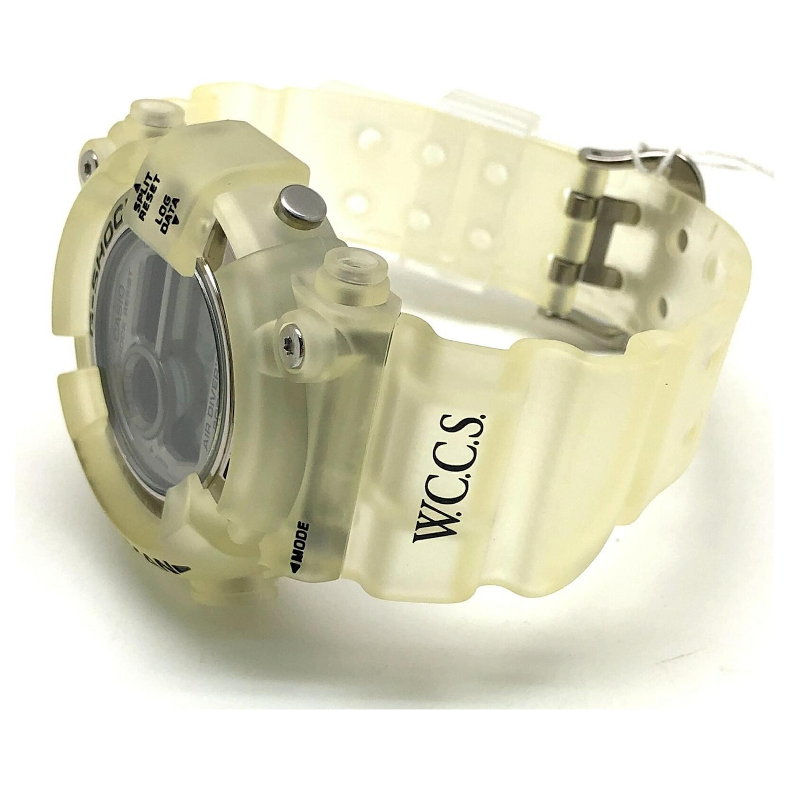 The Casio G-Shock DW-8201WC-8T Frogman is a digital wristwatch made from titanium with a clear display. It features a white skeleton design accented by a black case. Released in June 1998 and associated with the World Coral Reef Conservation Society, this model exemplifies durable and stylish craftsmanship. The watch is sold in used but like new condition, classified as Rank S, indicating it has insignificant bezel and bracelet scratches, while overall discoloration is present. Included with the watch are its inner box, manual, and outer box. Buyers are encouraged to refer to images for a precise understanding of the item’s condition.