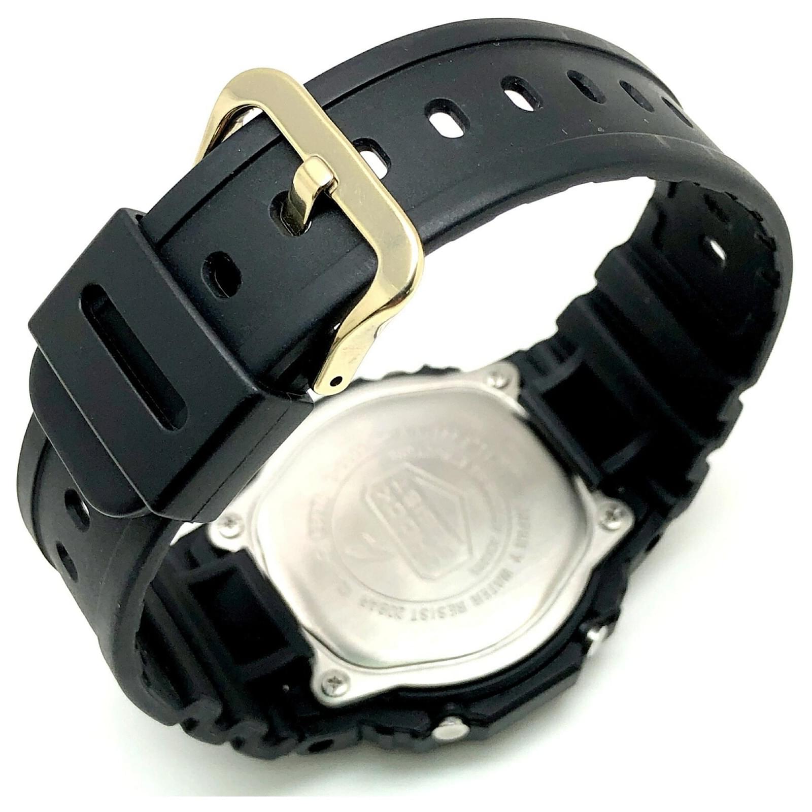 The Casio G-Shock G-5600-9 is a solar-powered wristwatch featuring a durable square design in black, with a gold version that was first released in September 2002. This used watch is in good condition, showing insignificant traces of usage and minor scratches on both the bezel and bracelet. It comes with the original inner box and is classified as Rank AB, indicating that while there are signs of wear, it remains generally in good condition. Buyers are advised to check the images to ensure satisfaction with the item's condition and included accessories.