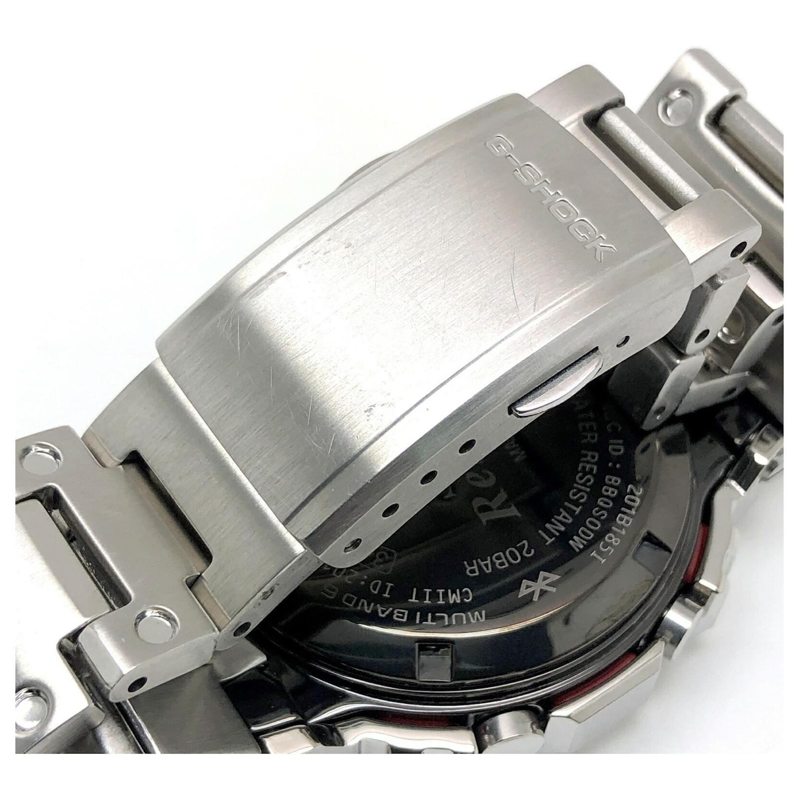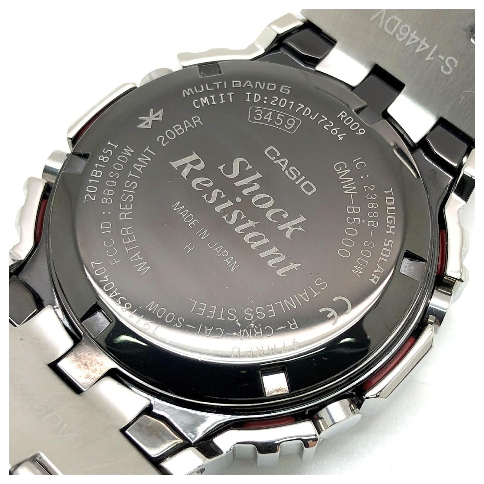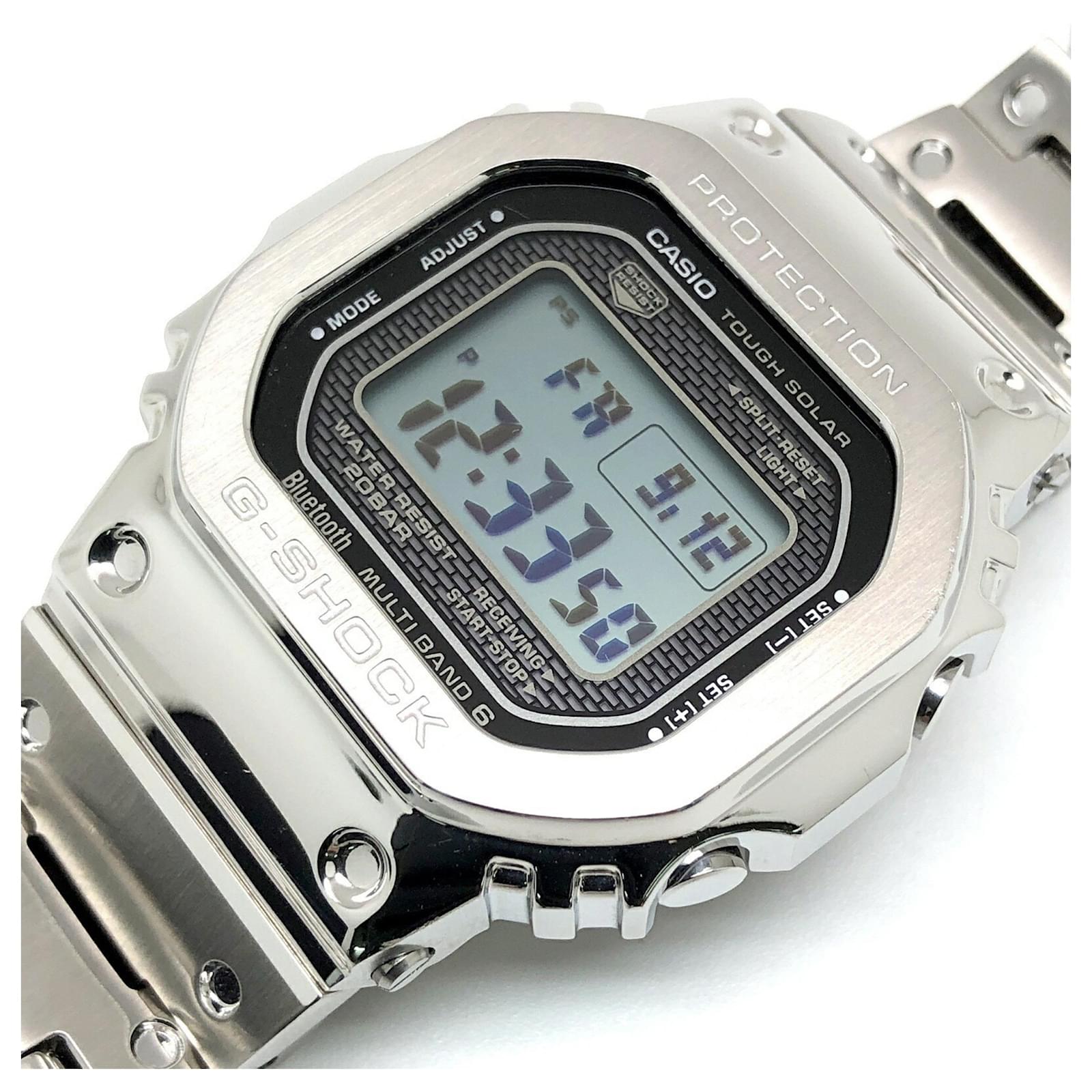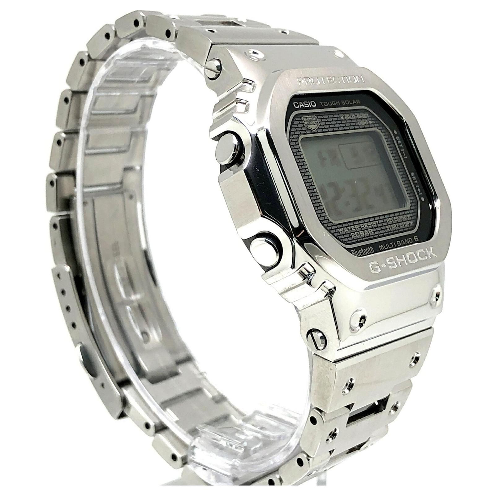 The Casio G-SHOCK GMW-B5000D-1 is a robust wristwatch featuring a full metal silver design. Built with a stainless steel case and band, this model boasts a digital display complemented by a backlight for easy readability. It operates on radio wave control solar movement and includes Bluetooth connectivity for mobile link capabilities.