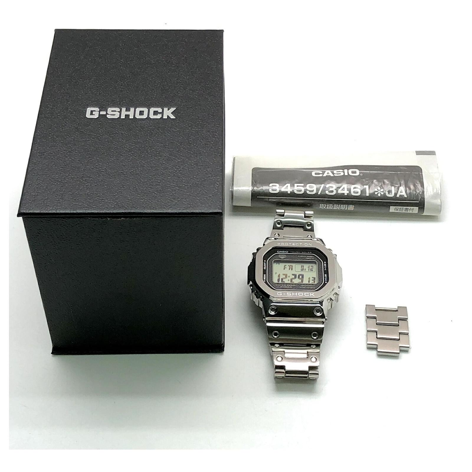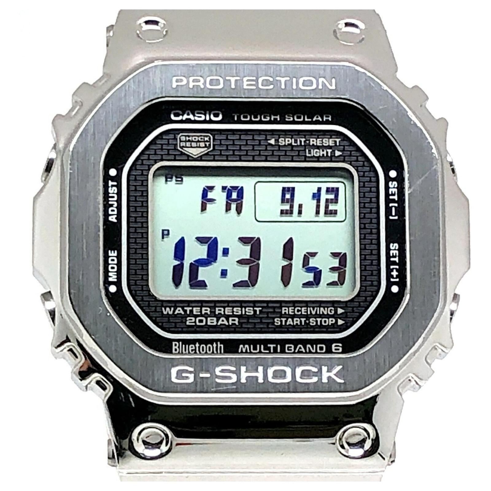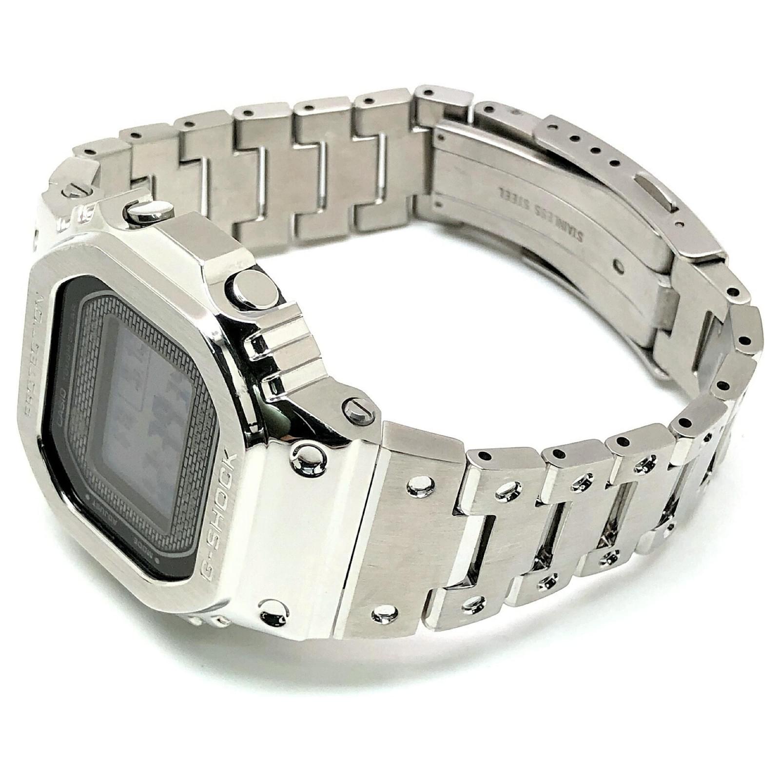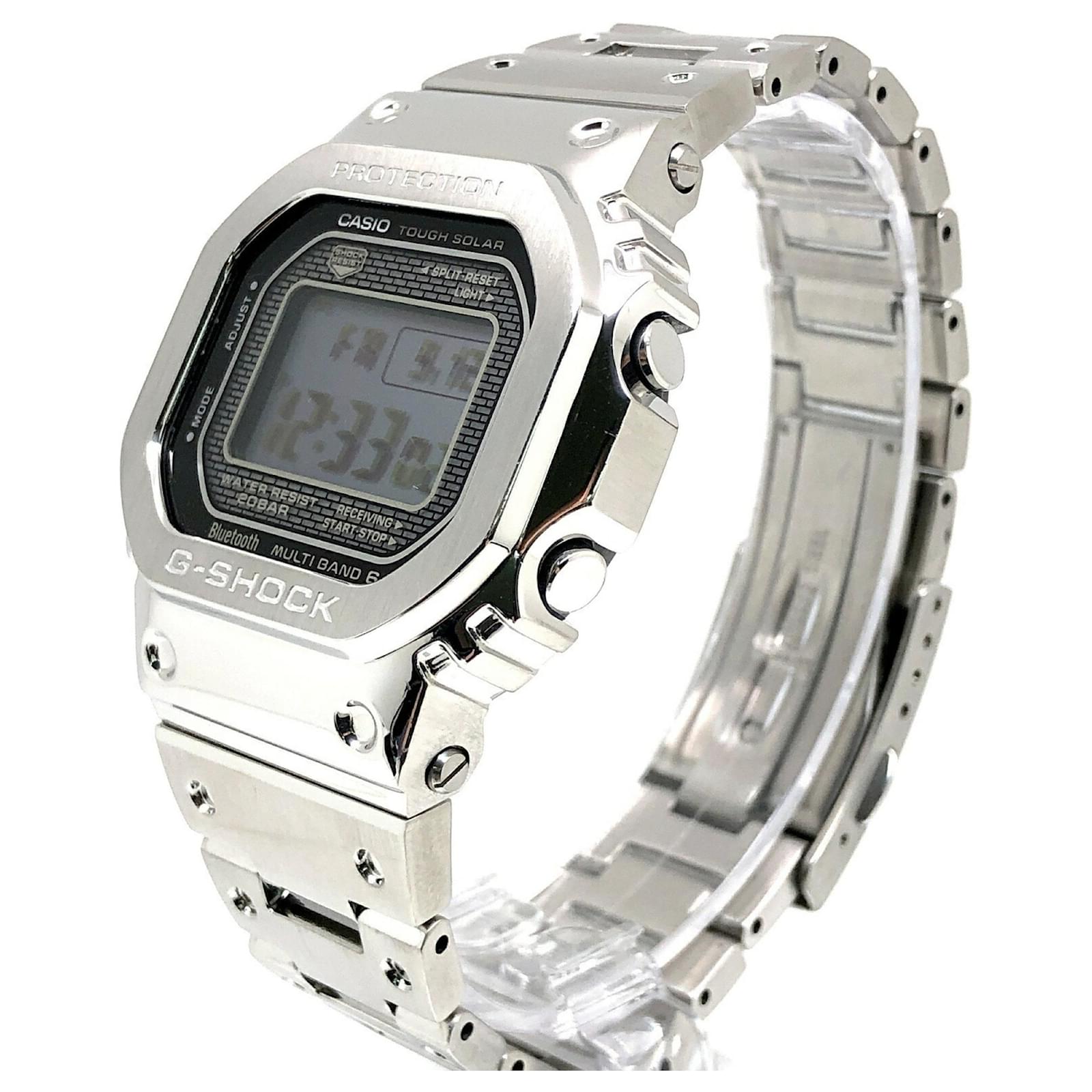 The Casio G-SHOCK GMW-B5000D-1 is a robust wristwatch featuring a full metal silver design. Built with a stainless steel case and band, this model boasts a digital display complemented by a backlight for easy readability. It operates on radio wave control solar movement and includes Bluetooth connectivity for mobile link capabilities.