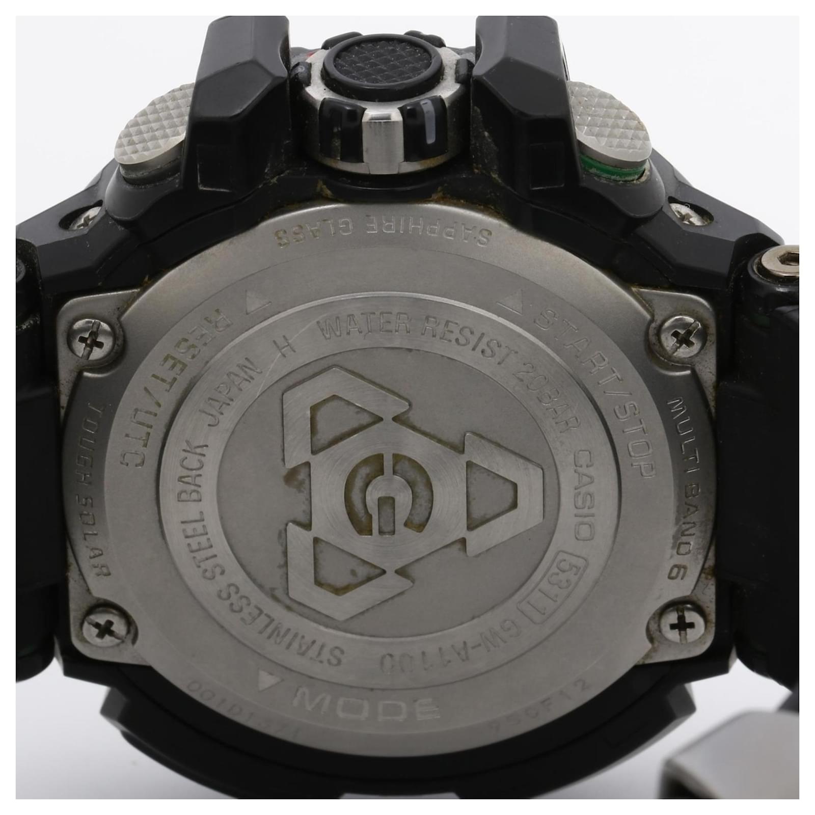 The Casio G-Shock Gravitymaster GWA11001A3JF is a men's wristwatch featuring a black resin case and band with an analog display. This watch is powered by solar movement and has a case diameter of 53.8mm, suitable for wrist sizes up to 20cm (7.87 inches). It is used and in good condition, showing slight traces of wear such as minor scratches on the bezel, case, and band. The dial remains largely unblemished. Please review the images for detailed views of the item's condition. Manufactured in Japan, this timepiece comes without additional accessories.