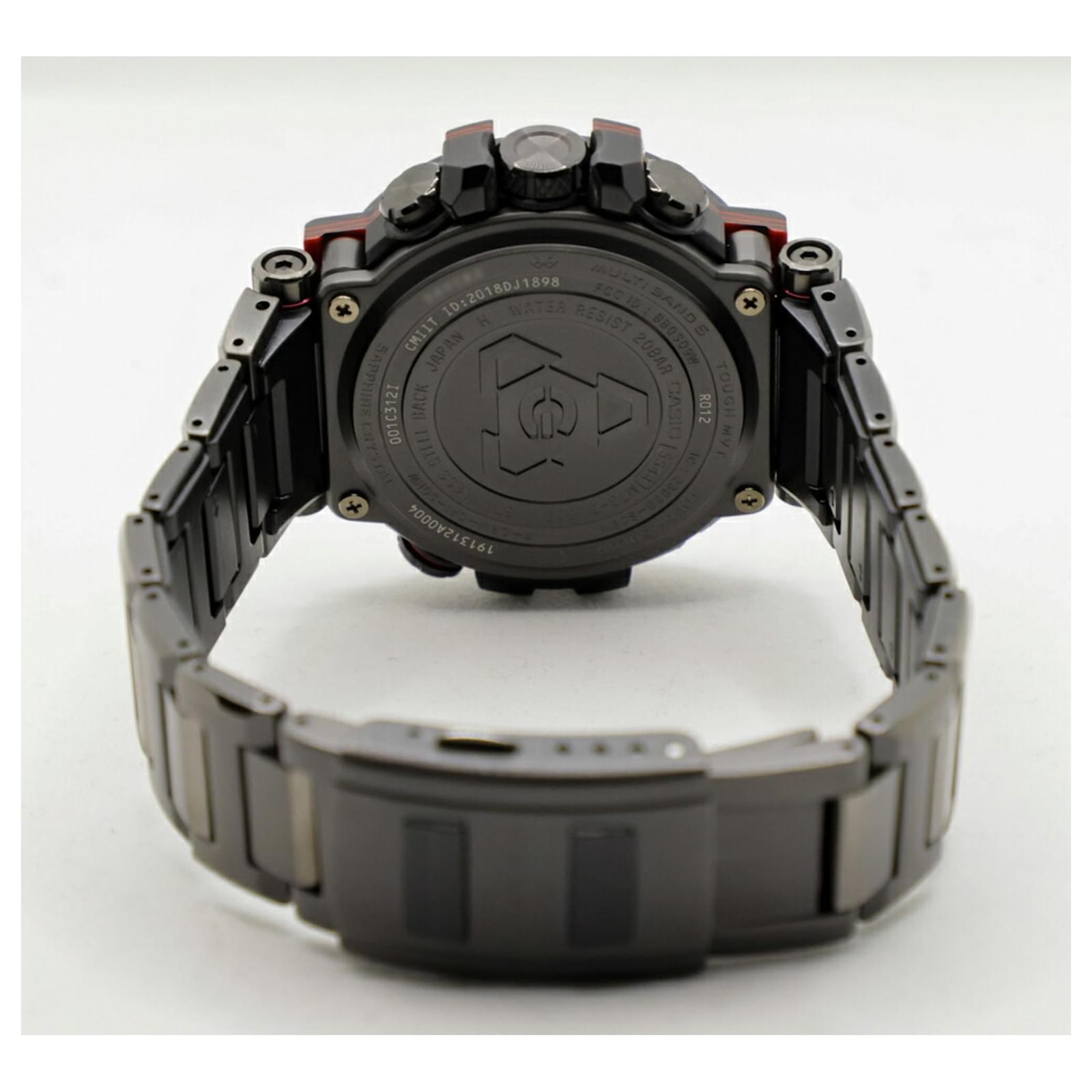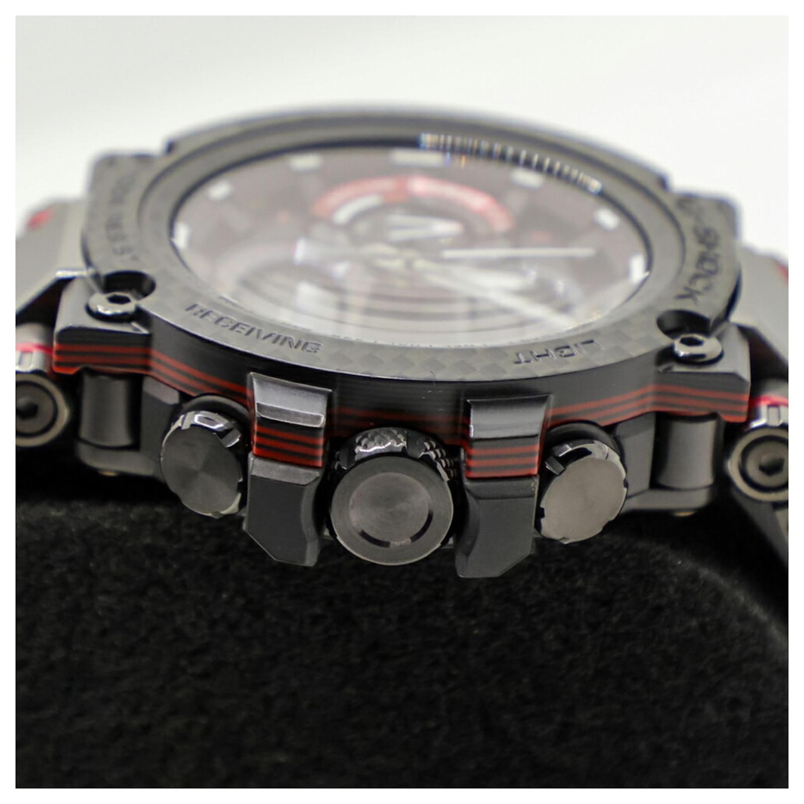 The Casio G-Shock MTG-B1000XBD-1AJF is a men’s wristwatch characterized by its black and red dial, crafted from durable carbon and complemented by a metal band. This timepiece utilizes radio wave control solar movement for precise timekeeping. It accommodates a wrist size of 21 cm (8.26 inches).