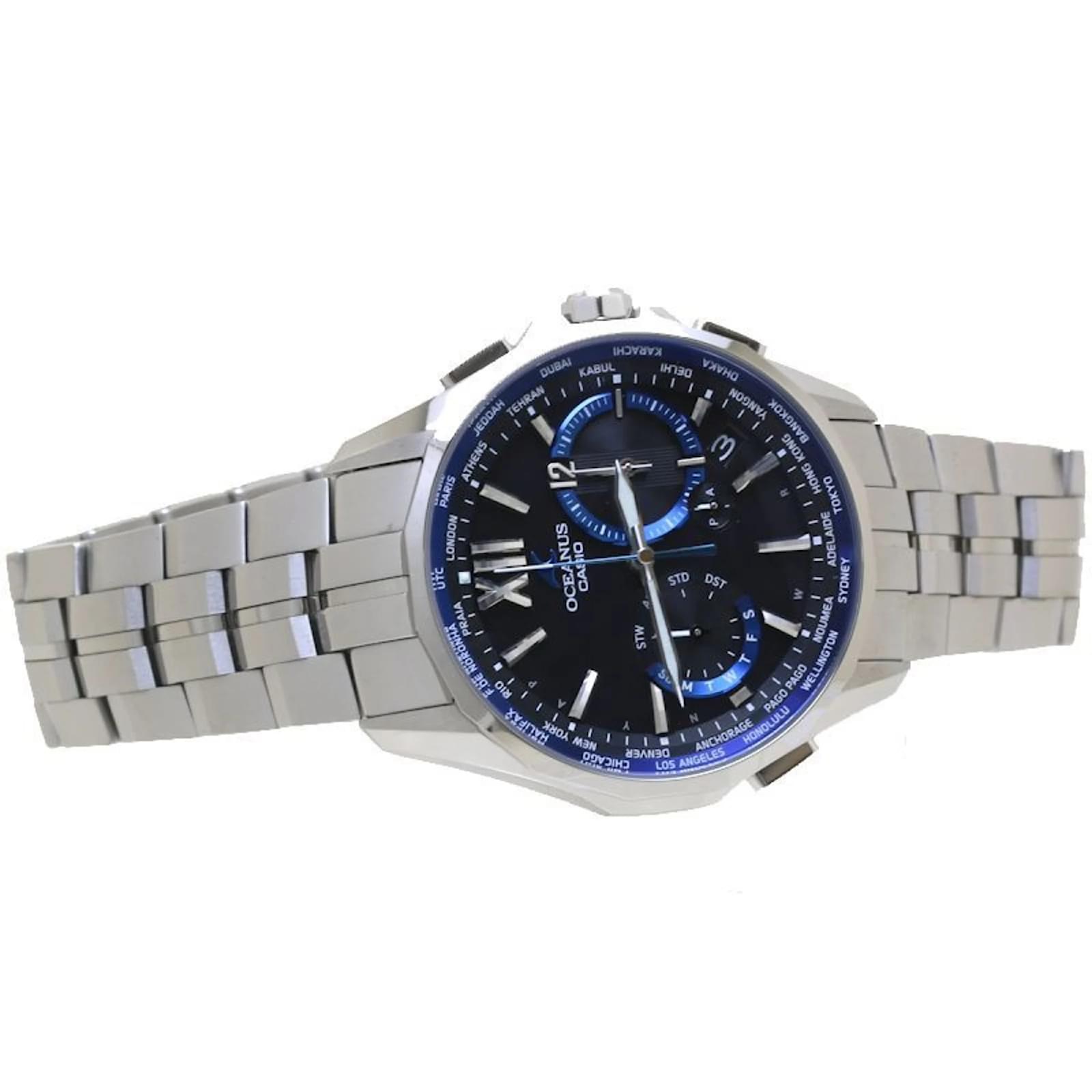 The Casio Oceanus Manta OCW-S3400-1AJF is a men's wristwatch designed with a sleek black dial and crafted from durable titanium for both the case and band. This timepiece features a radio wave control solar movement, ensuring accurate timekeeping.