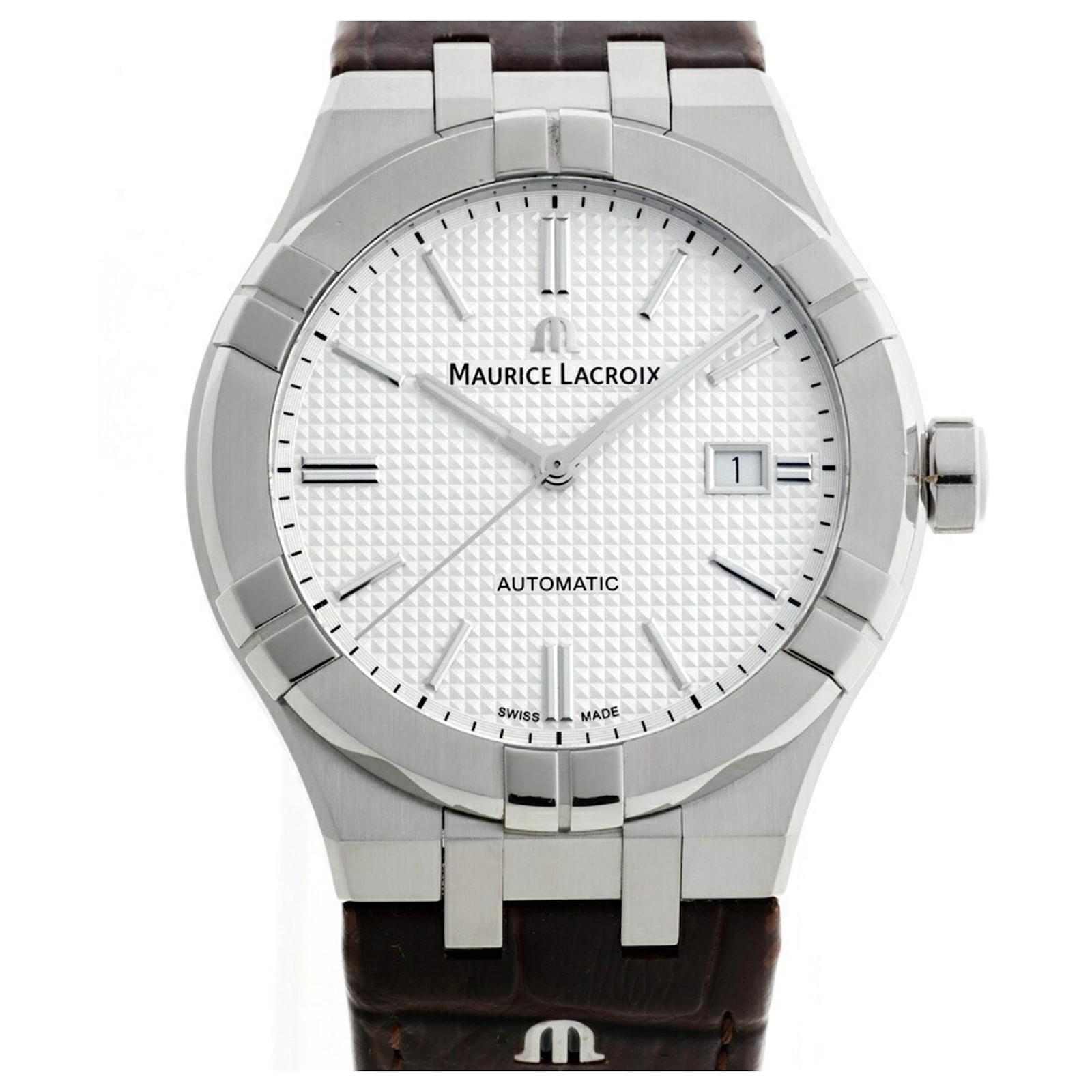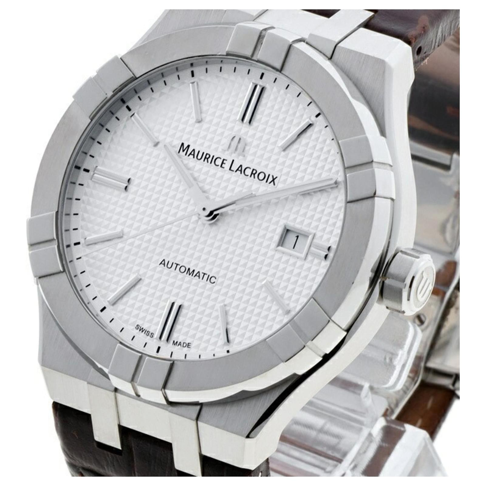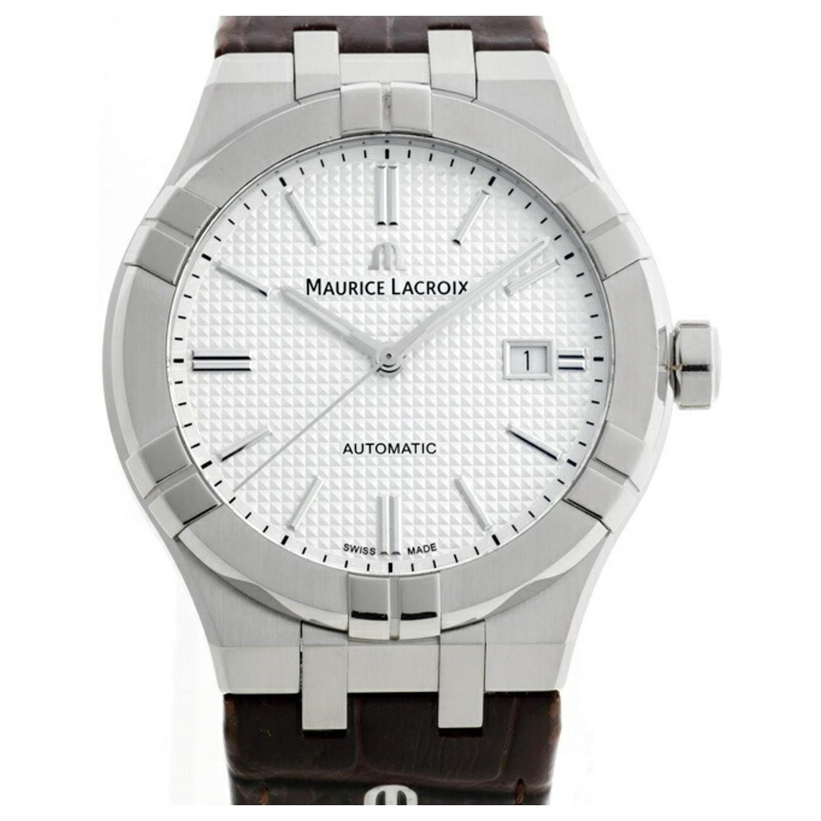 The Maurice Lacroix Icon Automatic Date AI6008-SS001-130-1 is a stylish wristwatch featuring a white dial housed in a stainless steel case. The timepiece is complemented by a combination leather and stainless steel band, fitting wrist sizes from 15.5cm to 20.5cm (6.1" to 8.07"). With a case diameter of 42mm (1.65"), this automatic self-winding watch blends functionality and elegance.