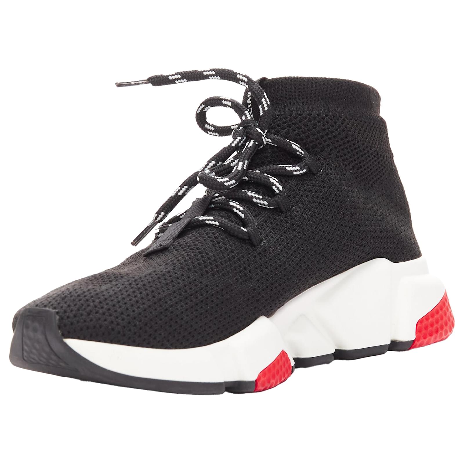 BALENCIAGA Speed black white red logo laced sock sneakers EU40Reference: CELE/A00011Brand: BalenciagaModel: SpeedMaterial: FabricColor: Black, WhitePattern: SolidClosure: Lace UpLining: Black FabricExtra Details: Logo tape at front tongue.CONDITION:Condition: Very good, this item was pre-owned and is in very good condition. Please refer to image gallery for thorough condition check. Micro dirts at midsoles.Comes with: One dust bag. SIZINGDesigner size: EU40Size reference: US7 / UK6 / EU40MEASUREMENTS: Footbed length: 23.5cm / 9.2"Heel height: 4.5cm / 1.8"Platform height: 2cm / 0.8"Measurments: length: 235 mm height: 45 mm