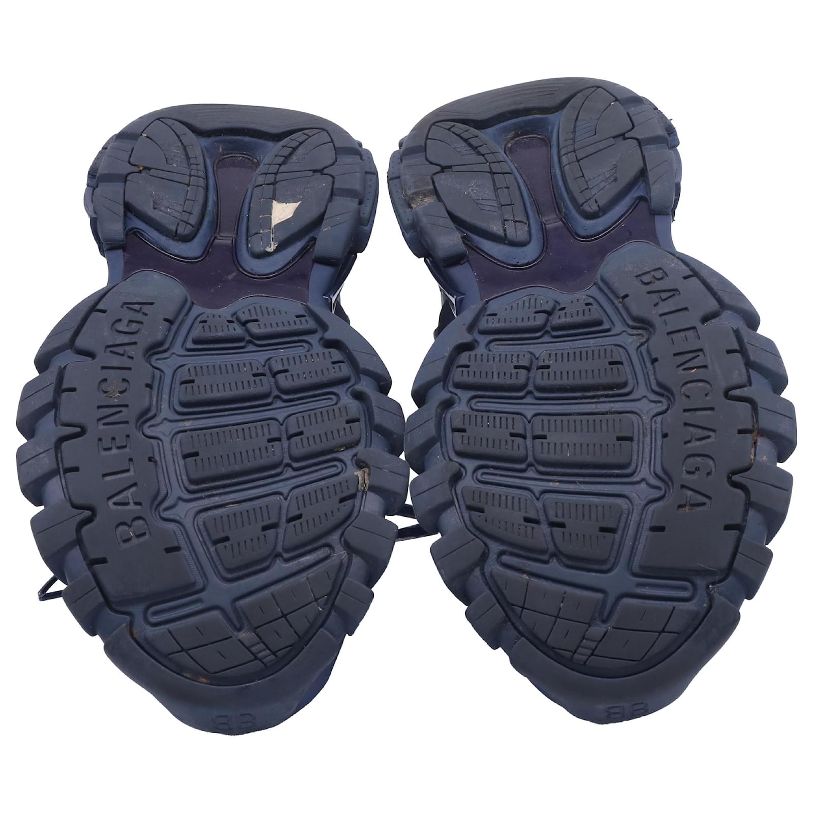 The Balenciaga Track Sneakers in Navy Blue Polyurethane deliver an ultra-technical, multi-layered design with a bold, sculptural silhouette that speaks performance-meets-fashion. Crafted from durable polyurethane overlays and mesh underlays, the sneakers boast a rugged, futuristic aesthetic with maximum cushioning and high-impact personality. **Styling tip:** Pair them with tapered cargo pants and a fitted nylon windbreaker in cool tones to echo their athletic edge while keeping the focus on their complex profile.