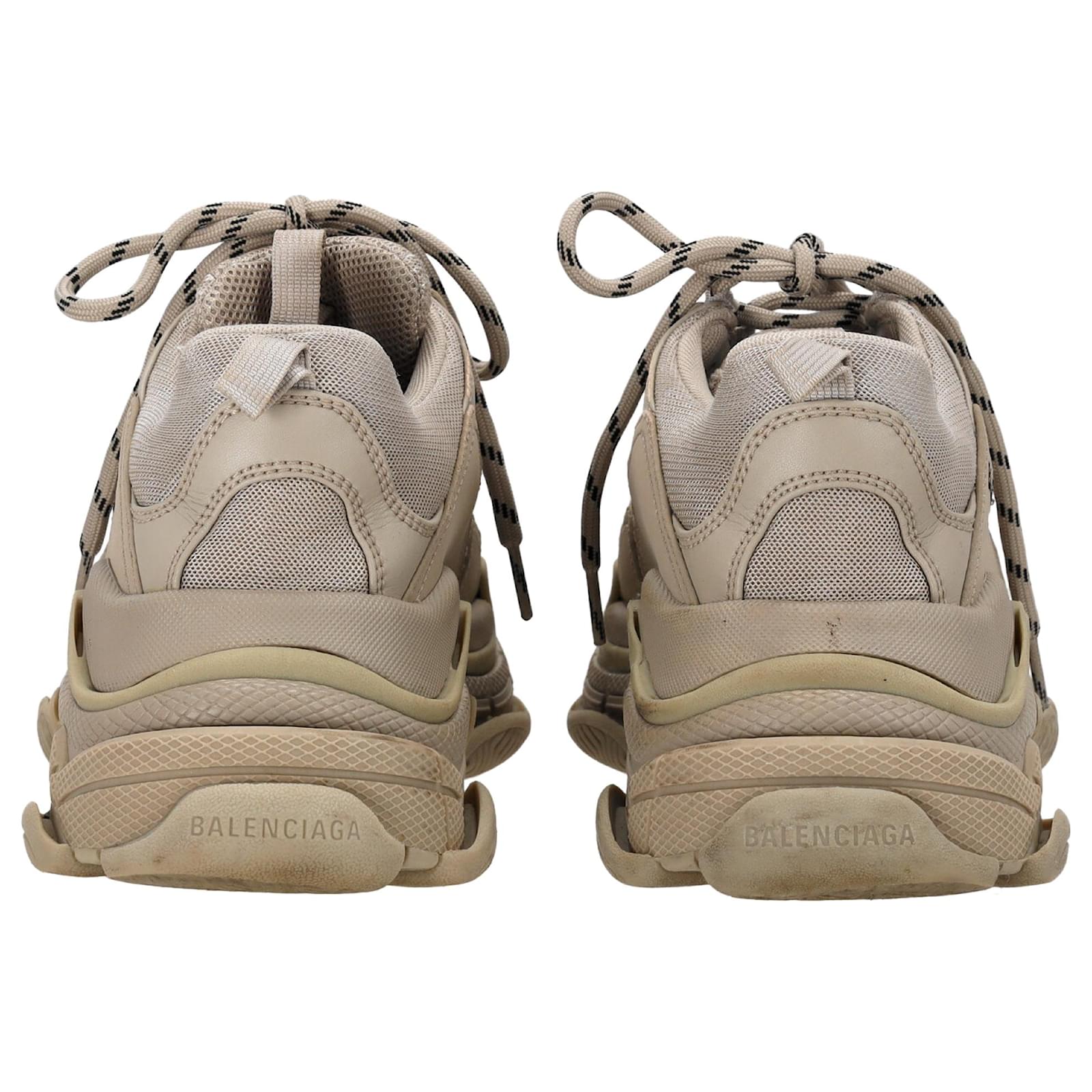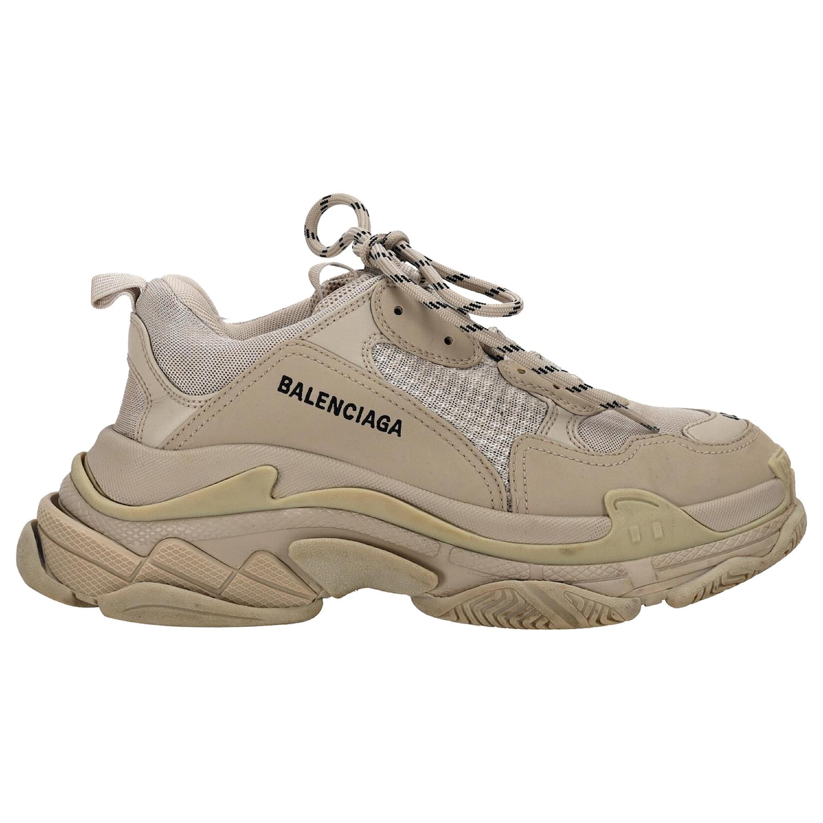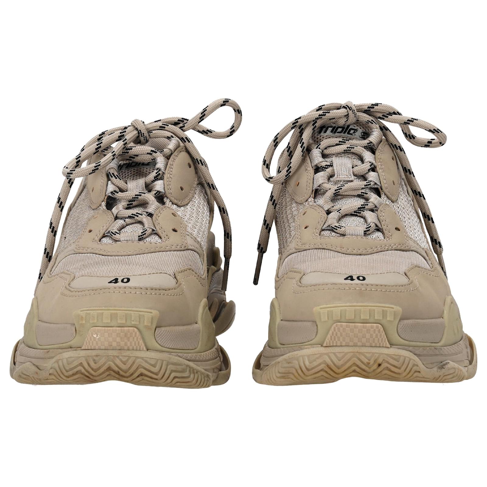 Step up your streetwear game with the iconic Balenciaga Triple S Sneakers in beige polyester—where oversized design meets luxury craftsmanship. These chunky sneakers combine retro athletic vibes with high-fashion appeal, making them the ultimate statement piece. **Style tip:** Pair them with tapered cargo pants and a relaxed hoodie for a bold, fashion-forward look that balances edge and ease.
