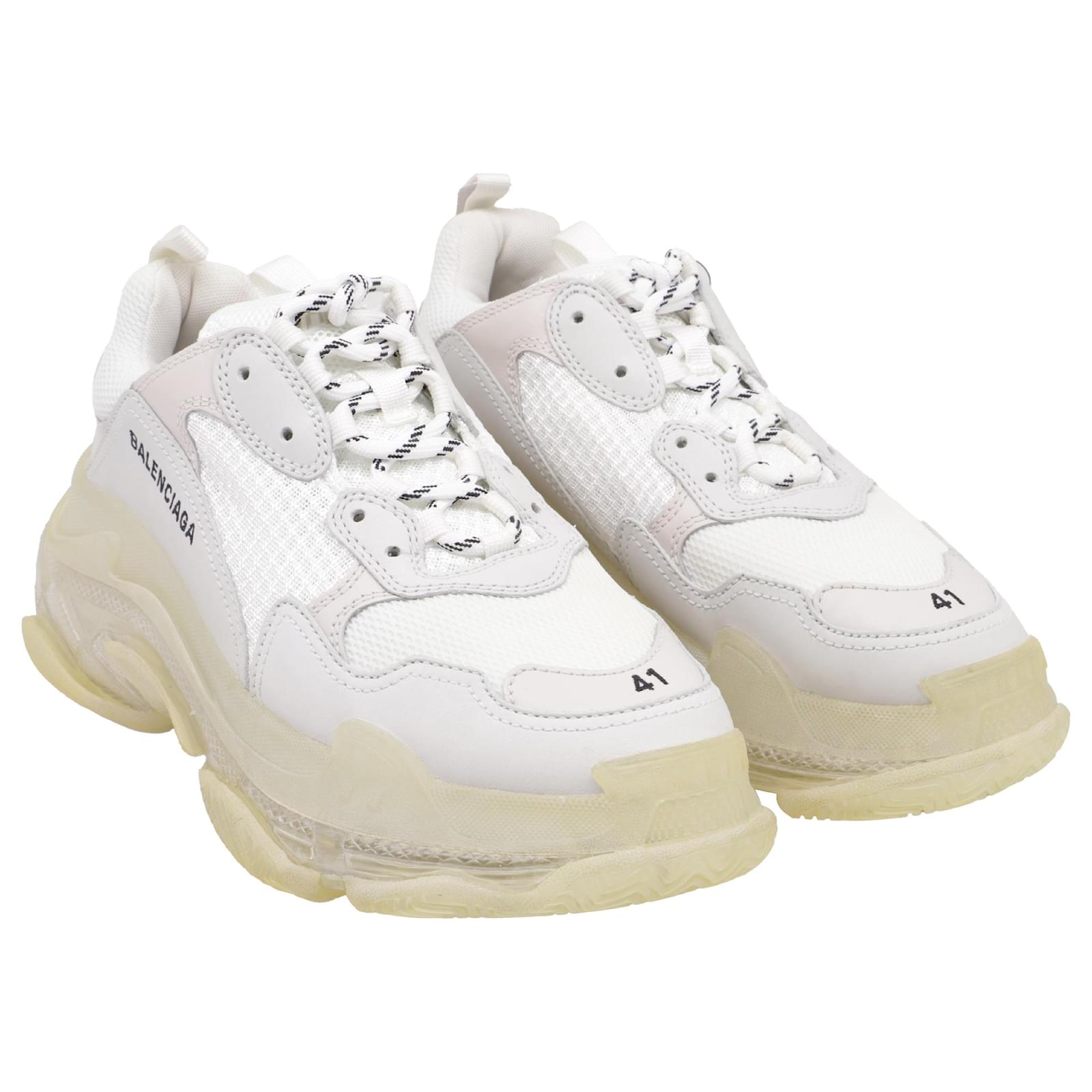 Step up your sneaker game with the Balenciaga Triple S Sneakers in White Polyester. These leather-free sneakers are not only stylish, but also feature a double foam and mesh construction for ultimate comfort. The complex 3-layered outsole provides added durability and support, while the embroidered size at the edge of the toe and logo details throughout add a touch of luxury. Complete with a lacing system featuring 12 fabric eyelets and an additional pair of laces, these sneakers are the perfect blend of fashion and functionality.