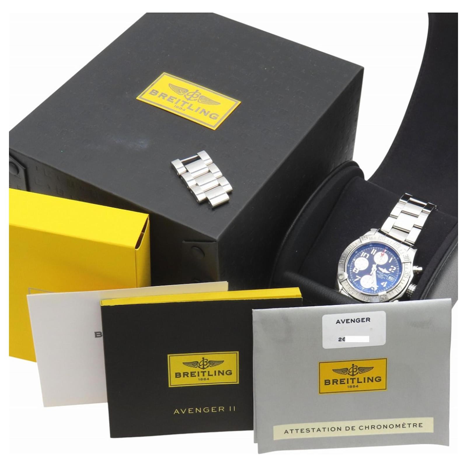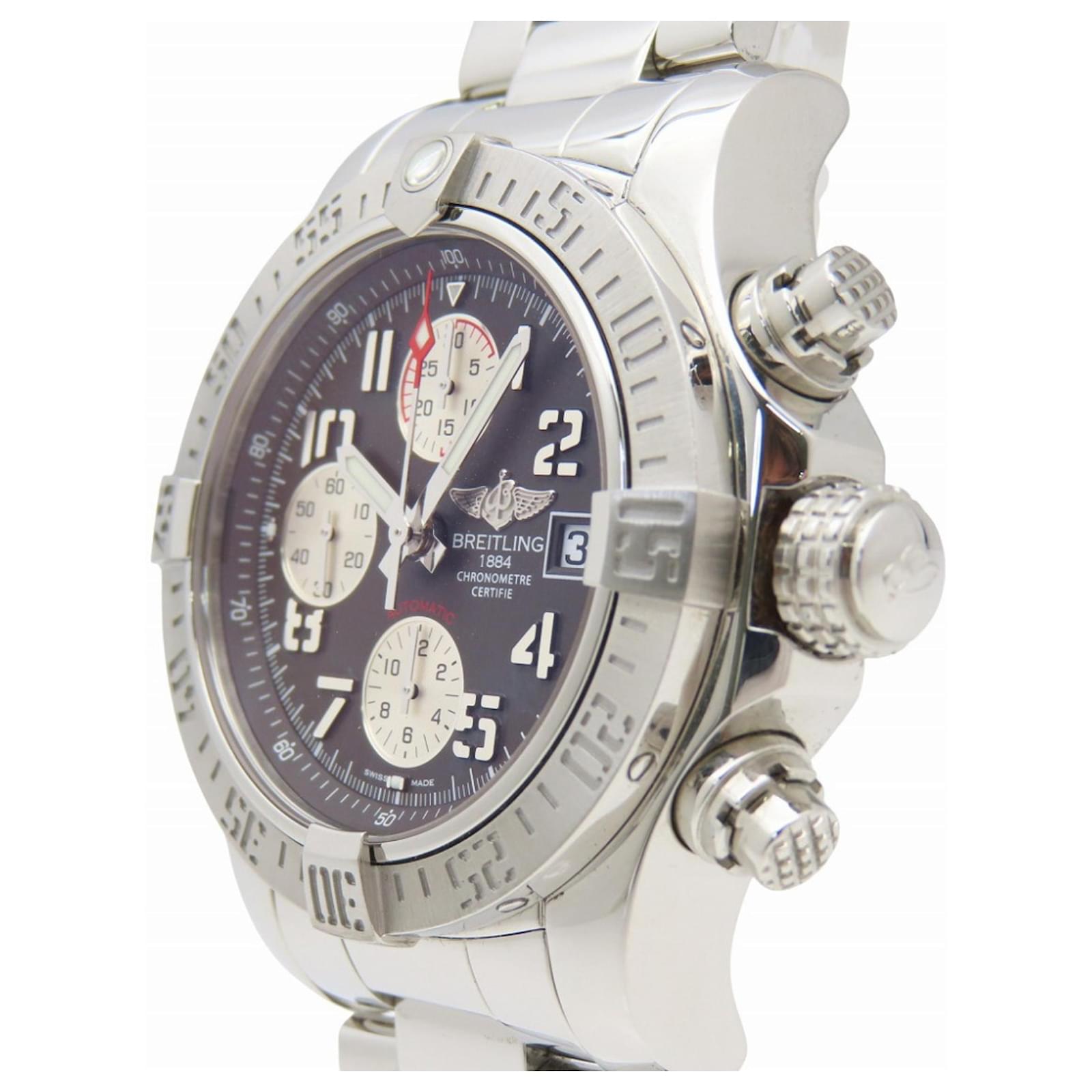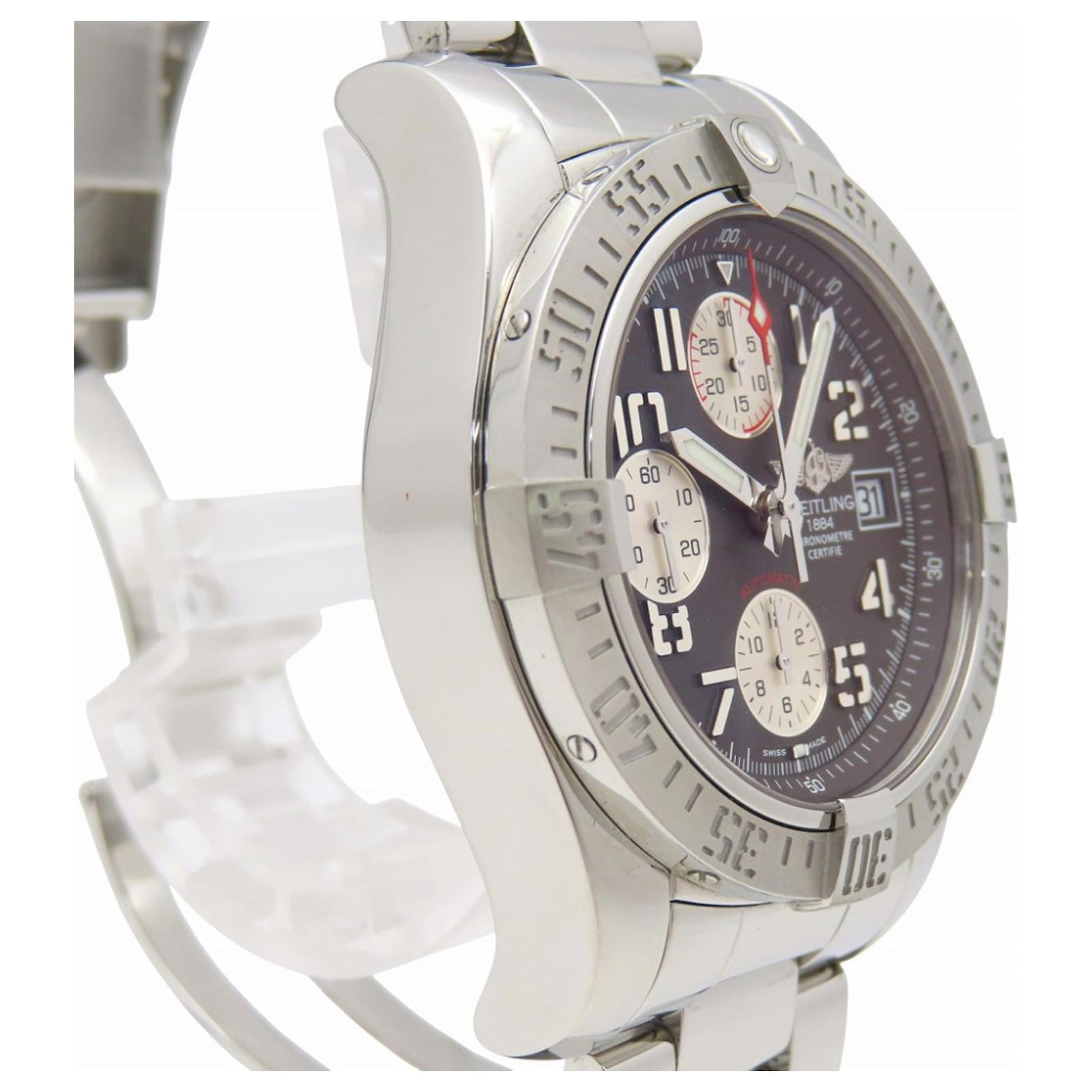 This Breitling Avenger II Chronograph watch, model A13381, features a gray dial and is crafted from durable stainless steel for both the case and band. It operates on a self-winding automatic movement and accommodates wrist sizes from 17cm to 20cm (approximately 6.69'' to 7.87''). The watch has a case diameter of 44mm (1.73'') and comes from the renowned Swiss brand Breitling.