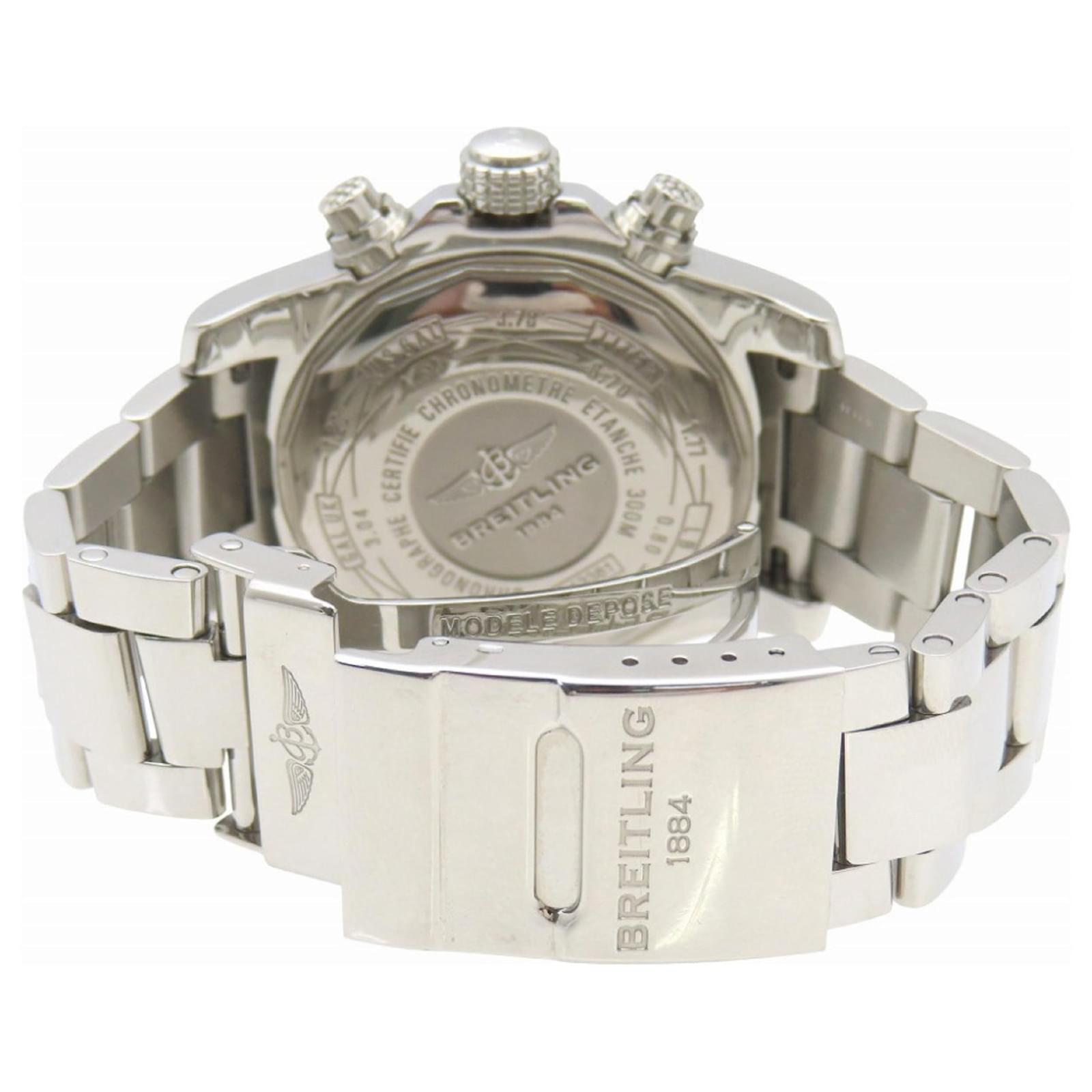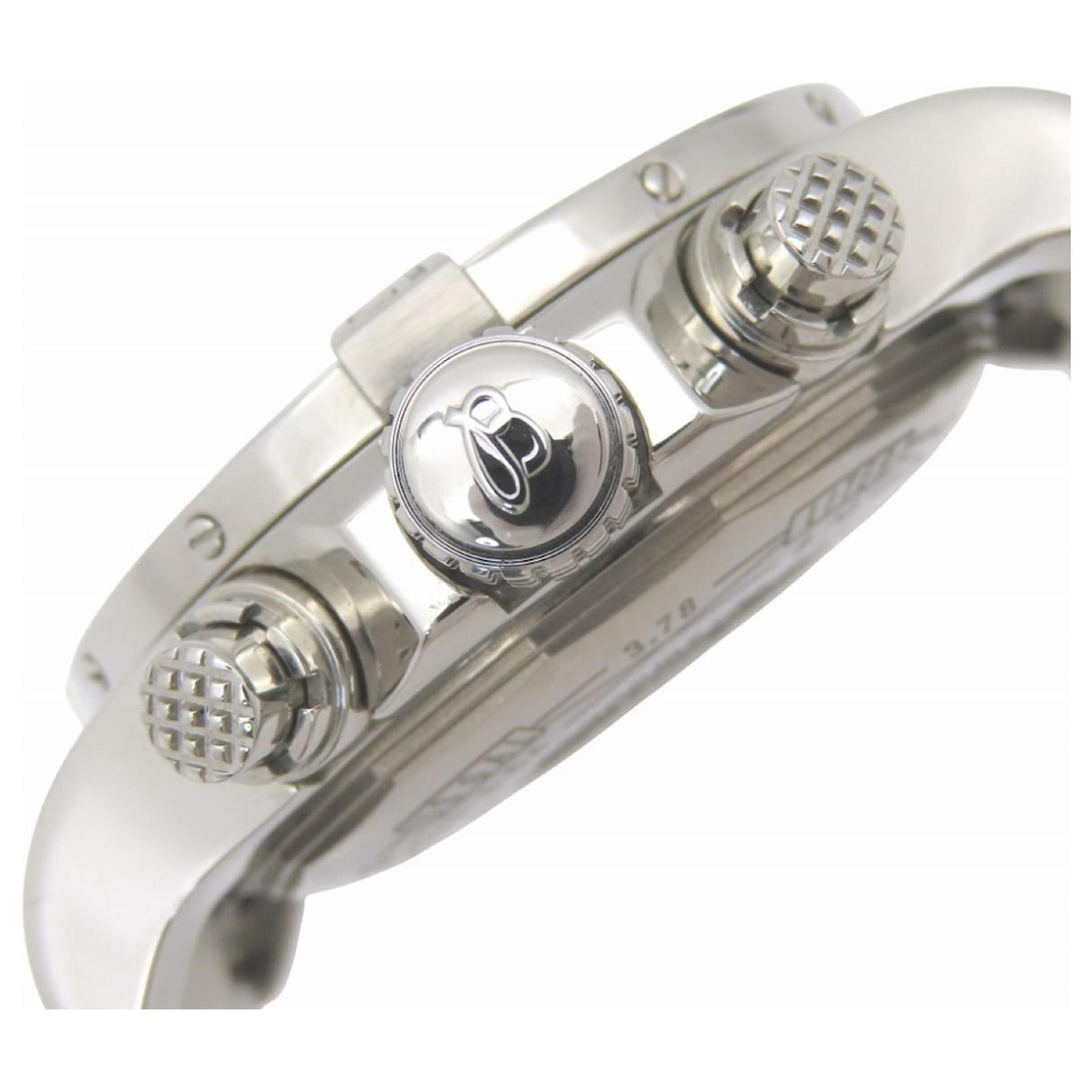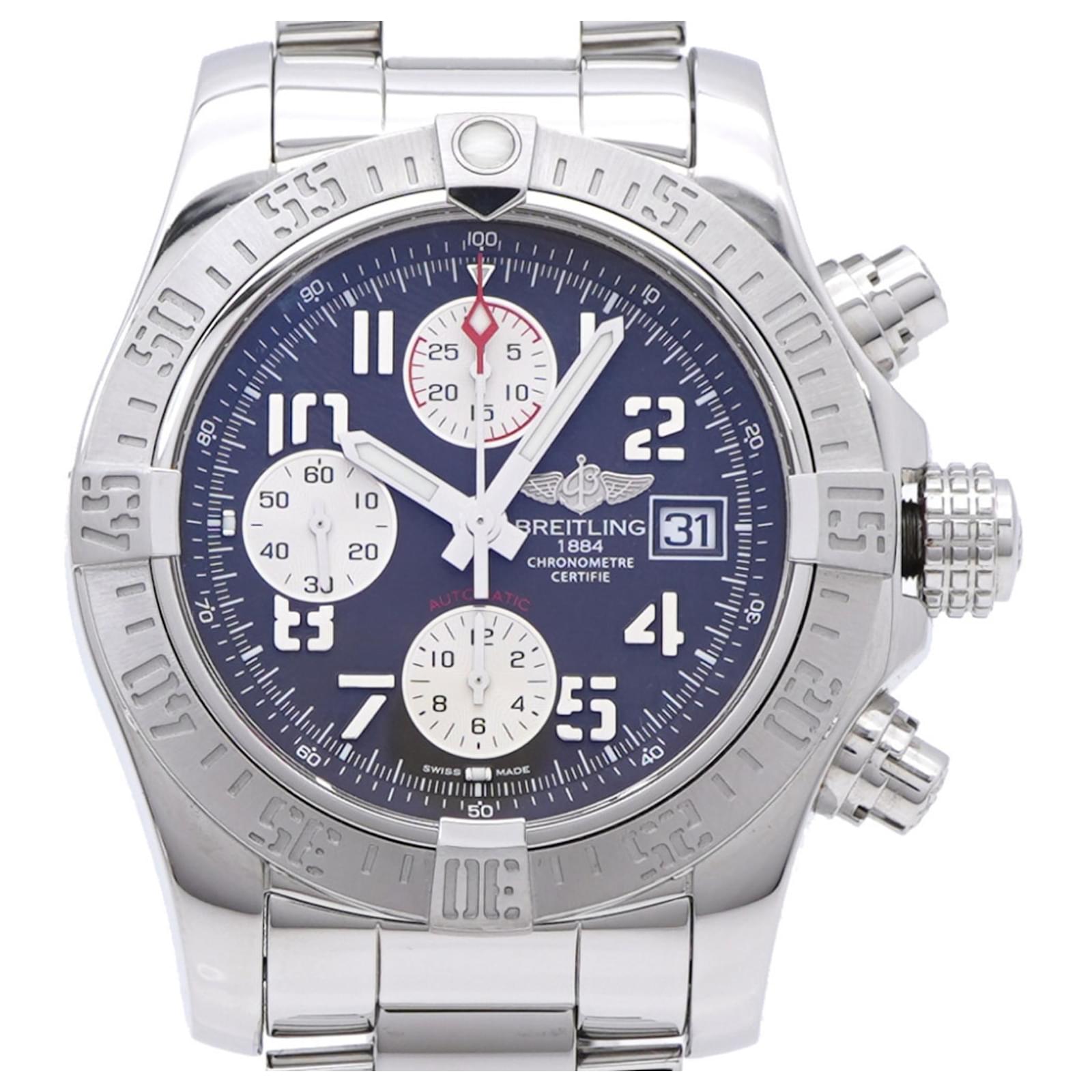 This Breitling Avenger II Chronograph watch, model A13381, features a gray dial and is crafted from durable stainless steel for both the case and band. It operates on a self-winding automatic movement and accommodates wrist sizes from 17cm to 20cm (approximately 6.69'' to 7.87''). The watch has a case diameter of 44mm (1.73'') and comes from the renowned Swiss brand Breitling.