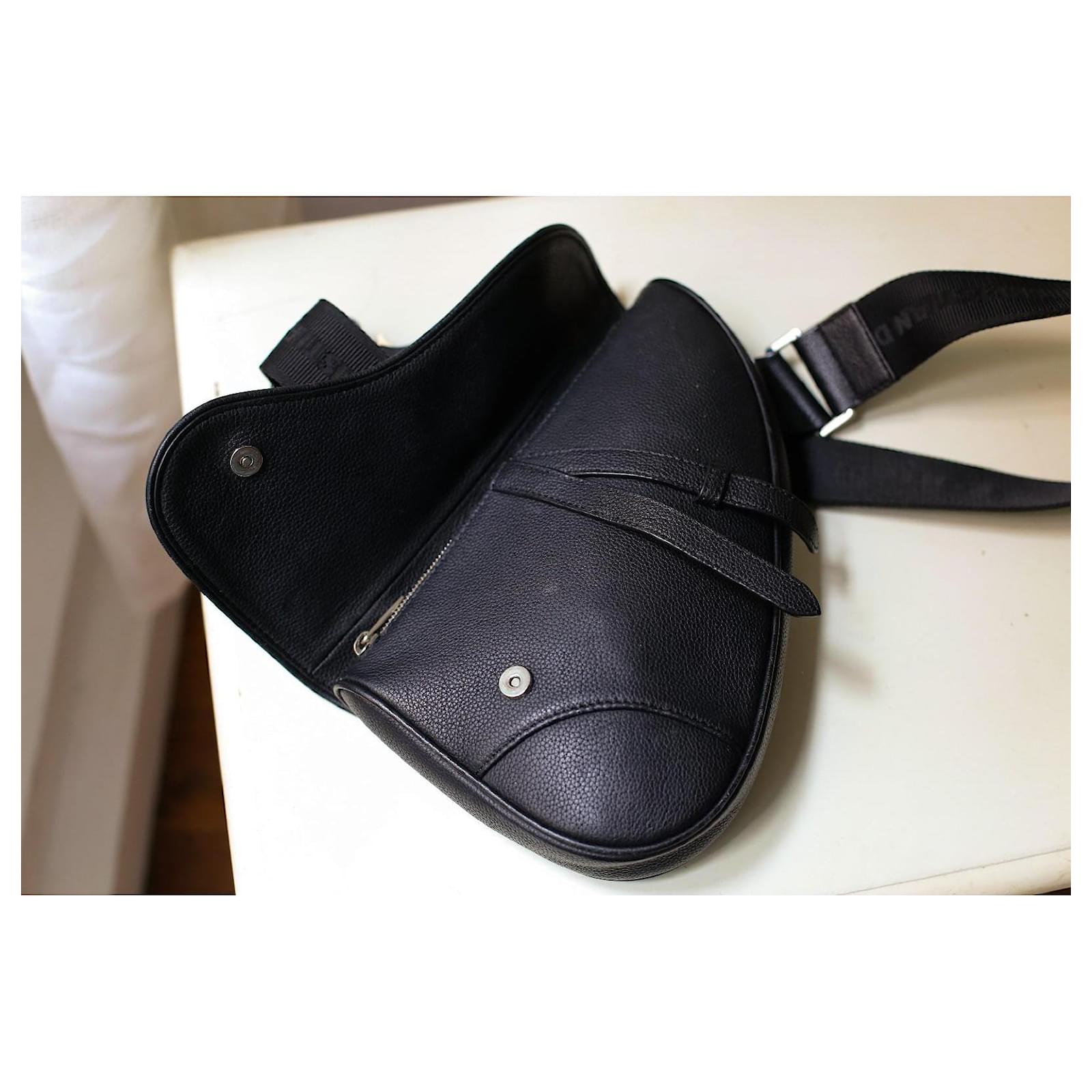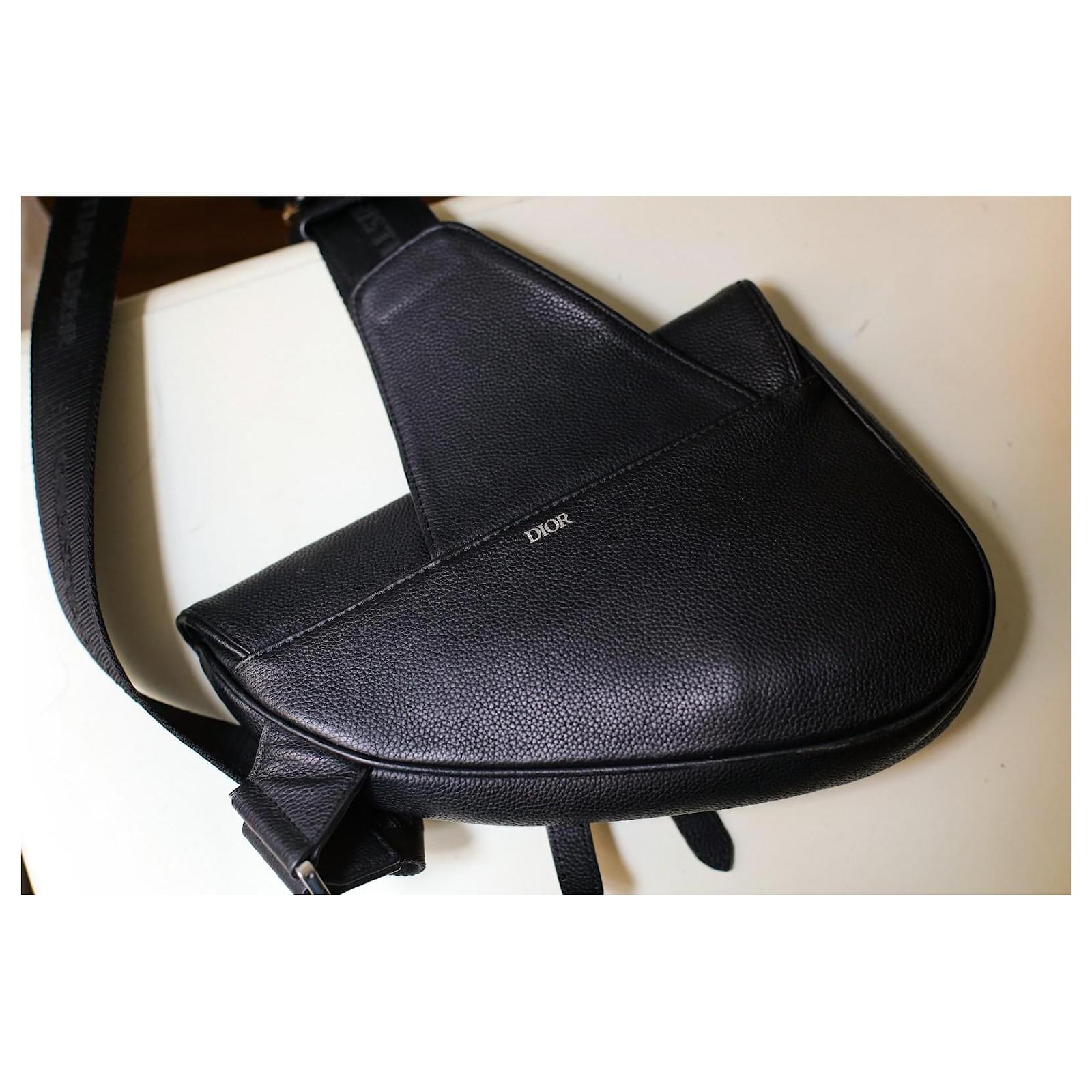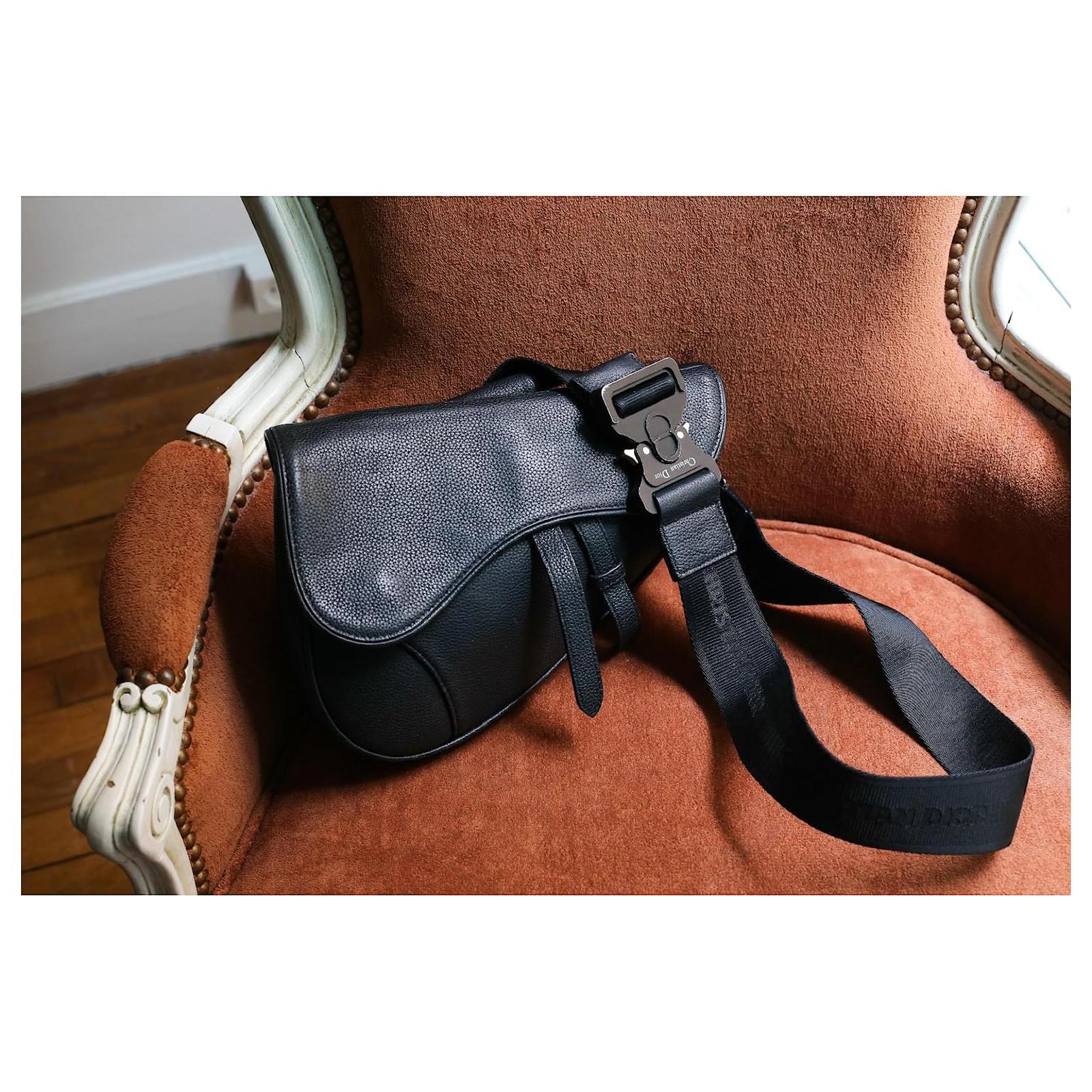 Dior, Saddle model handbag in grained leather. It is black. The closure is a magnetic flap with a zip. The shoulder strap is adjustable in Christian Dior jacquard nylon. The metal buckle features the Christian Dior signature and CD initials. Very light signs of wear (notably on the buckle), very good overall condition.