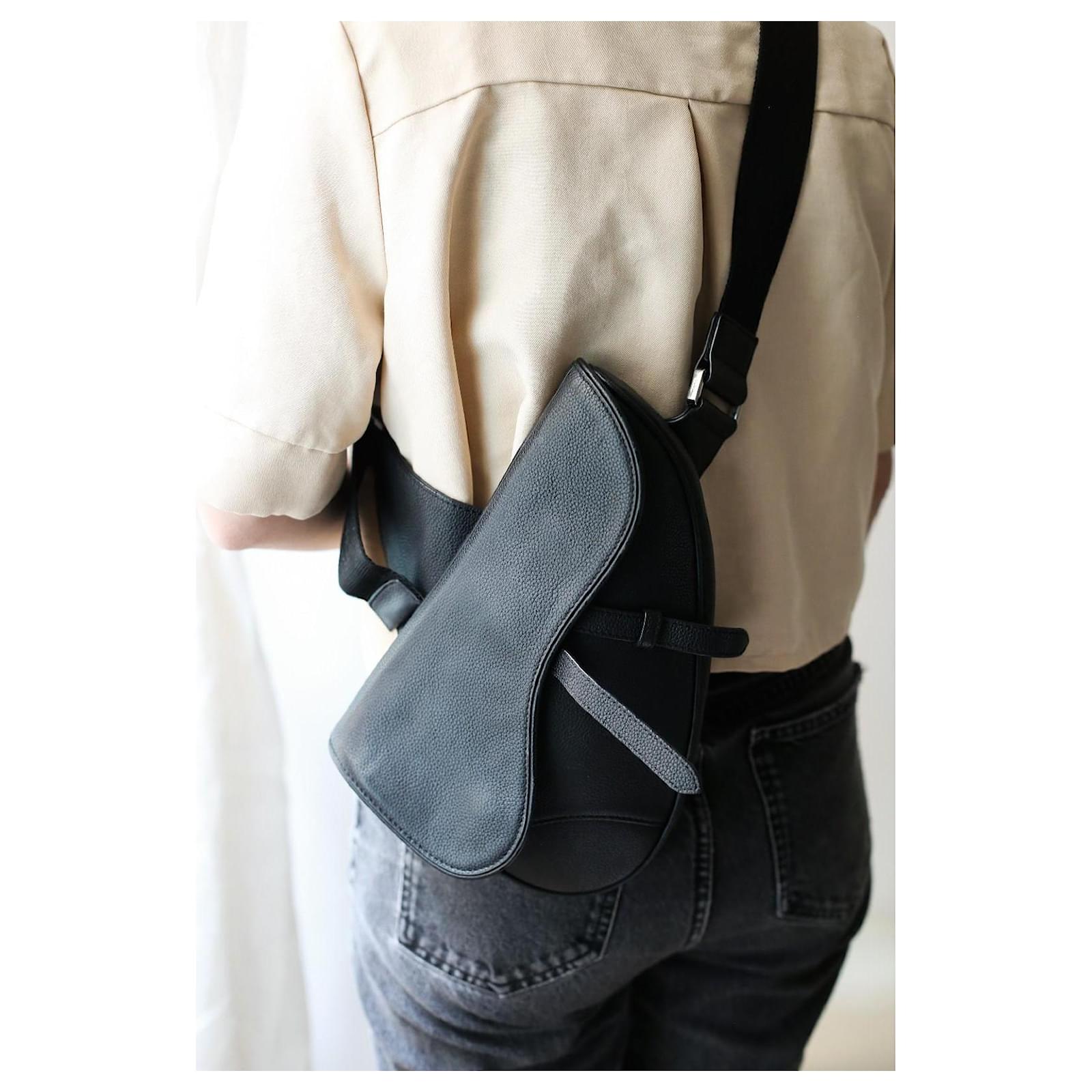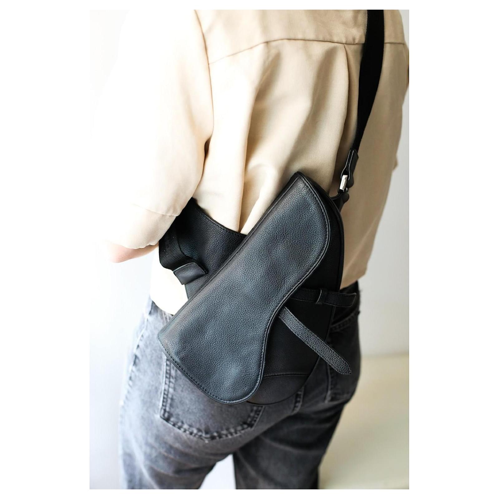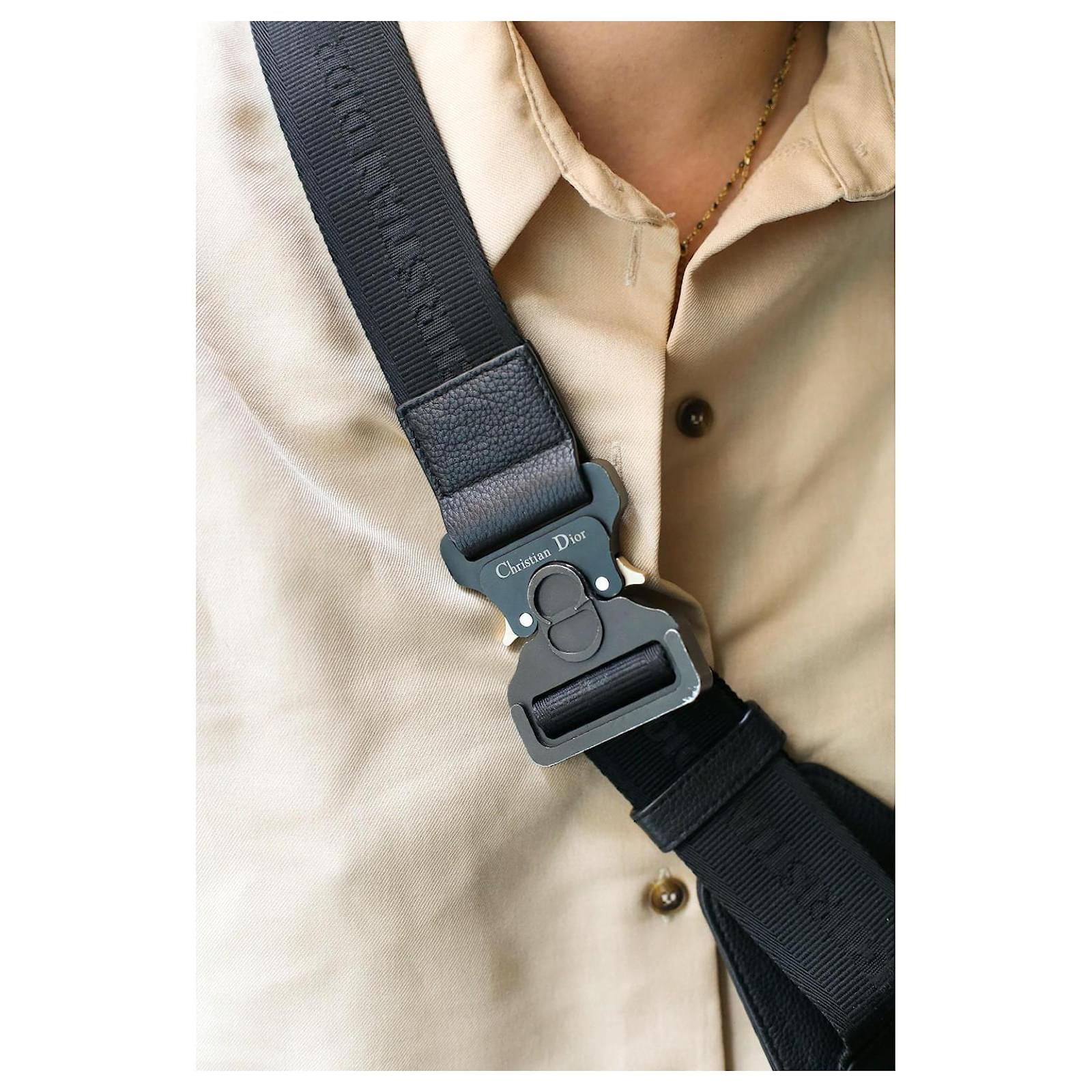 Dior, Saddle model handbag in grained leather. It is black. The closure is a magnetic flap with a zip. The shoulder strap is adjustable in Christian Dior jacquard nylon. The metal buckle features the Christian Dior signature and CD initials. Very light signs of wear (notably on the buckle), very good overall condition.
