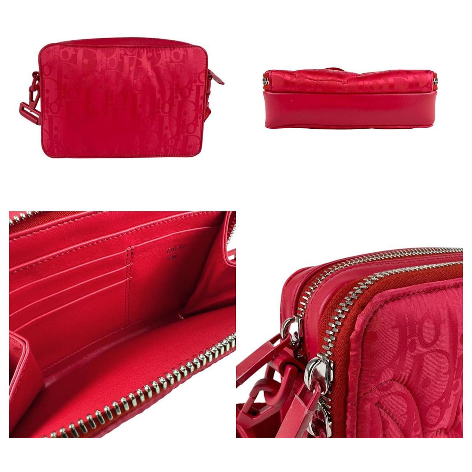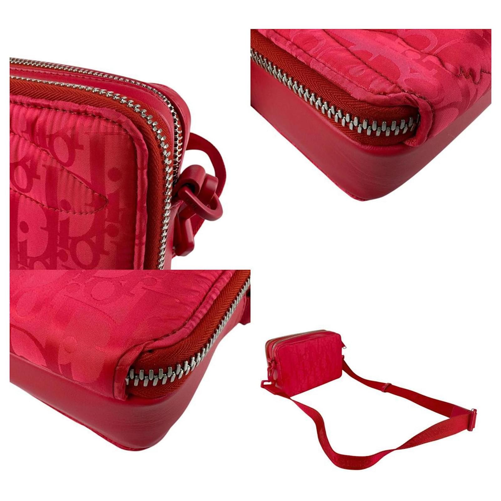 The Christian Dior Dior x ERL Nylon Shoulder Bag is a stylish accessory designed for men, featuring a vibrant red color complemented by silver hardware. This shoulder bag is made from durable nylon and includes a zipper closure for secure storage. It offers practical organization with one outer zipper pocket, two open inner pockets, and three card holders. The bag measures 13cm x 16cm x 6cm (5.11'' x 6.29'' x 2.36'') and comes with a strap length of 94cm (37'').