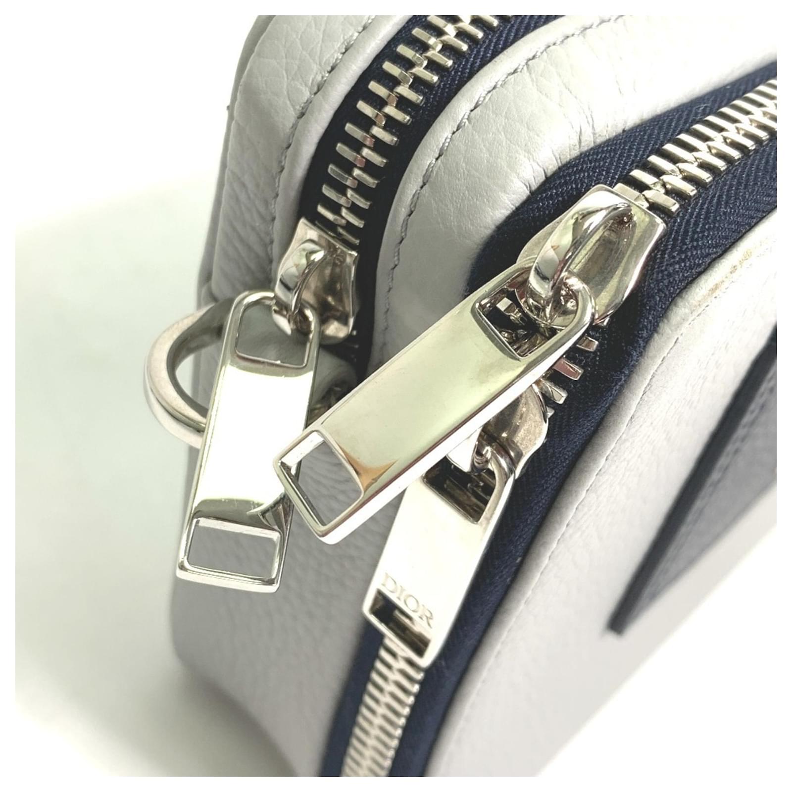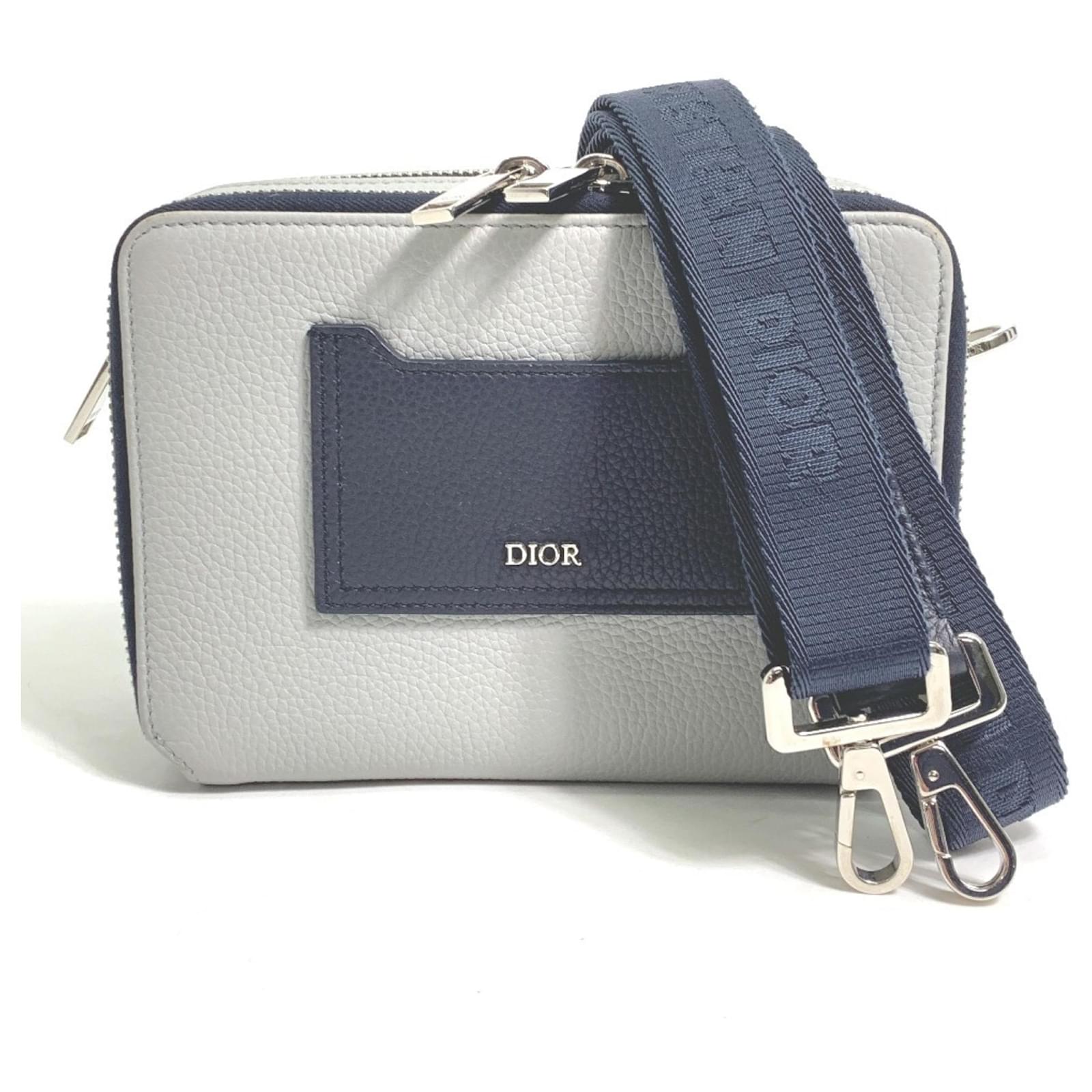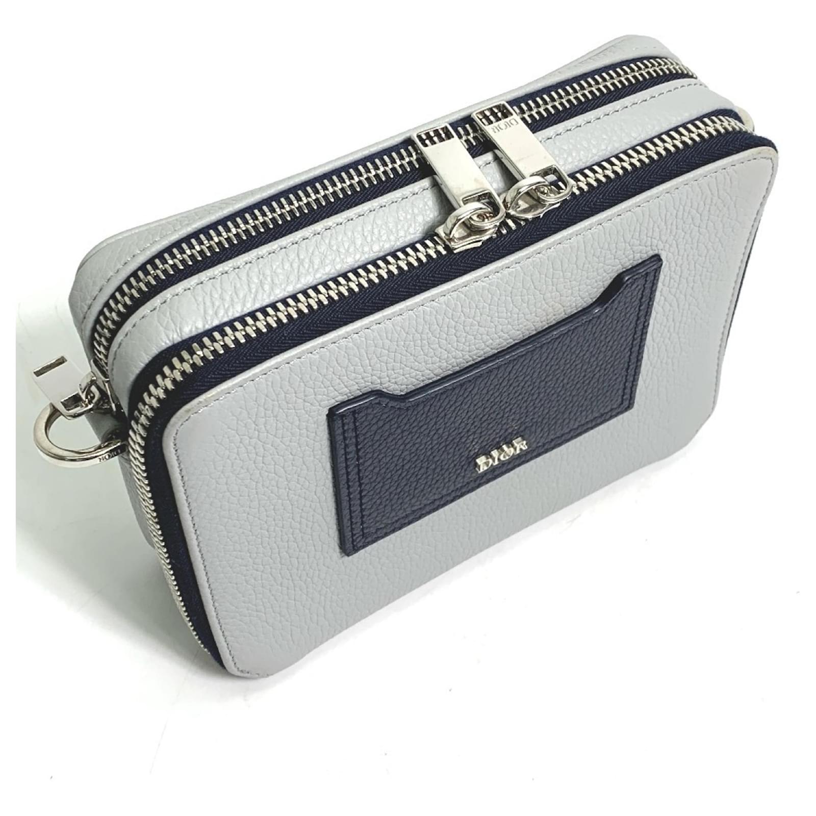 This Christian Dior shoulder bag features a double zip pocket design and is crafted from gray leather. With dimensions of 12cm x 17cm x 5.5cm, it is compact yet functional. The bag is categorized as used but is in very good condition, showing only slight traces of use, including minor scratches and dirt. There is a slight stain inside, and potential buyers are encouraged to review the images for a detailed view of the item's condition. The bag comes with a shoulder strap for added convenience.