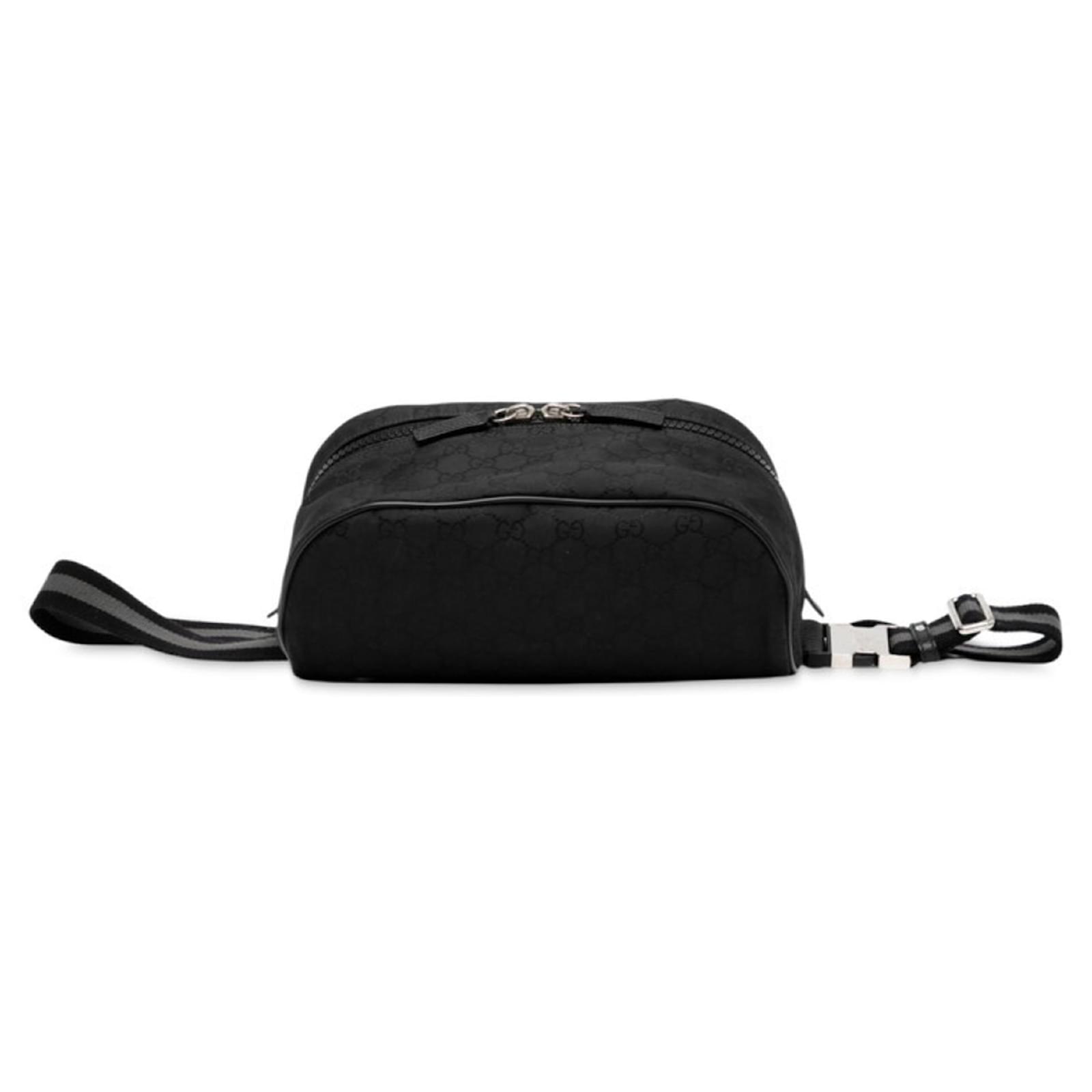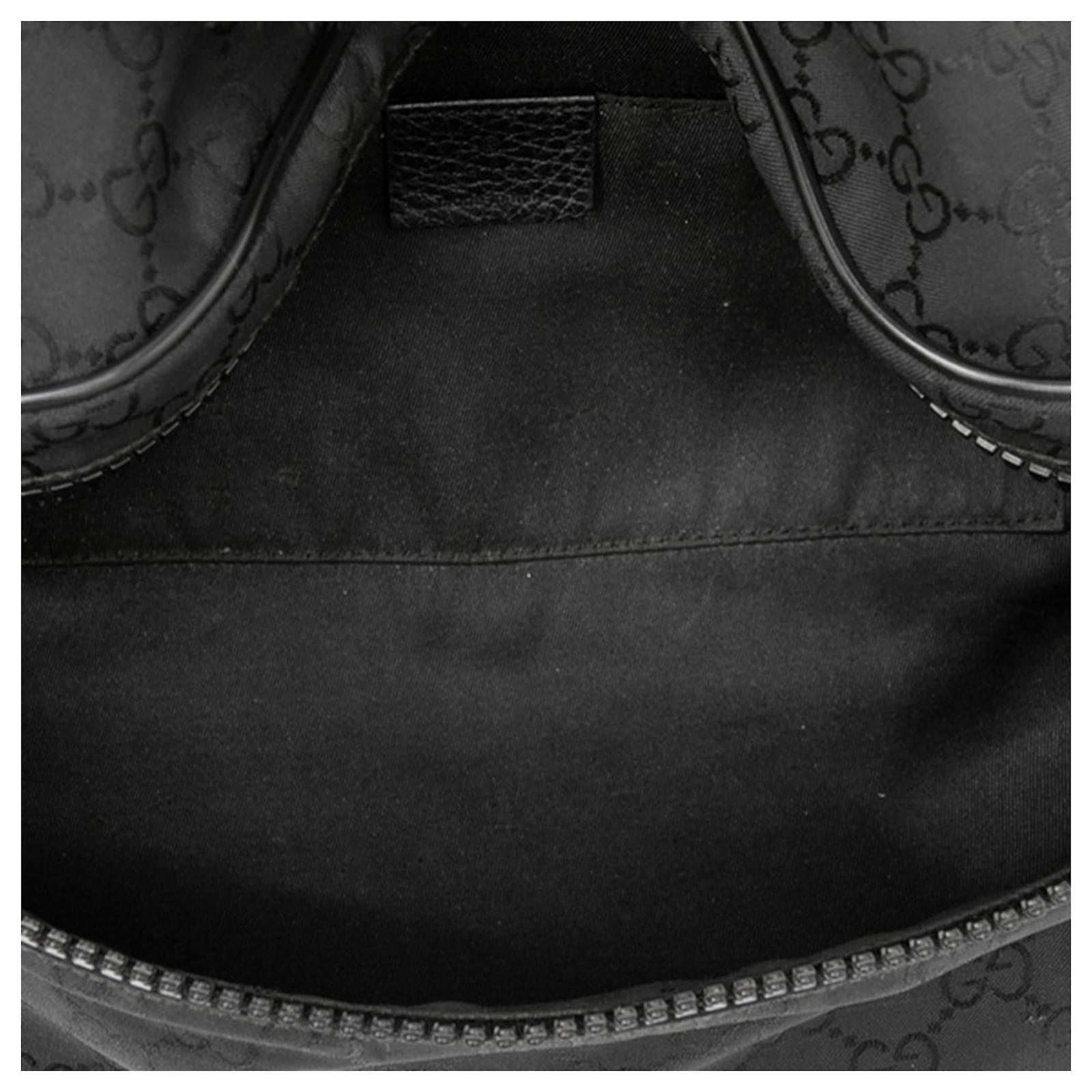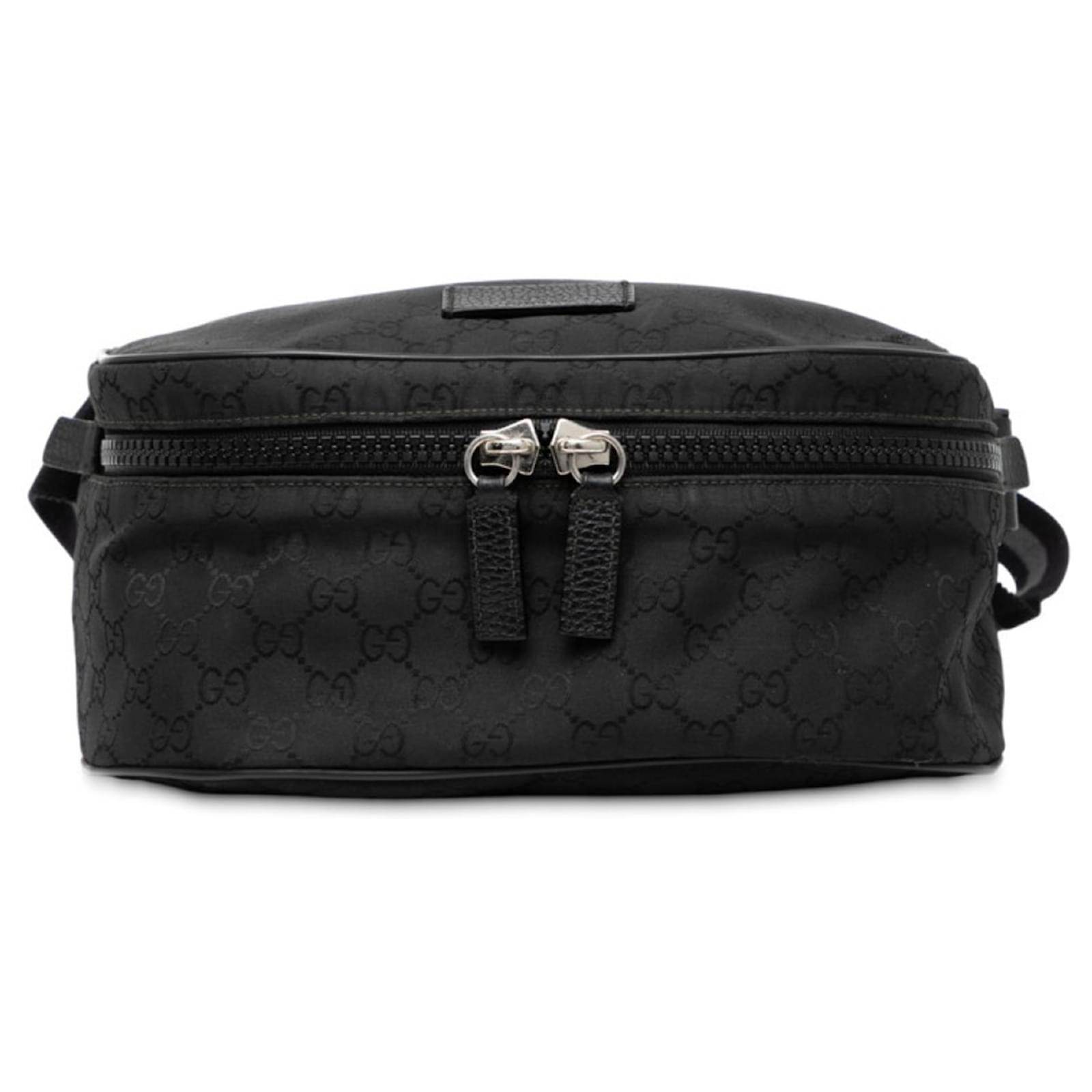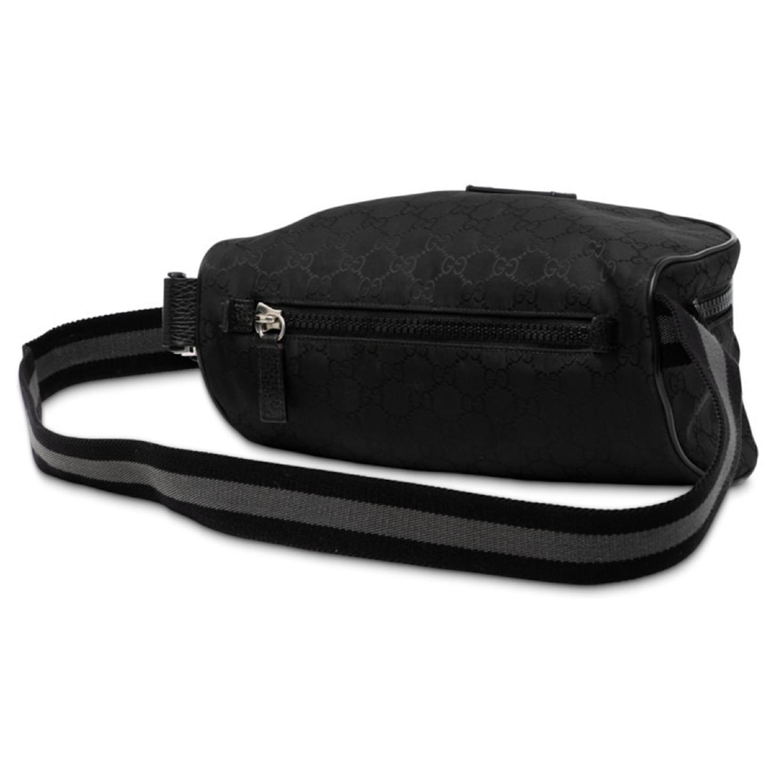 This Gucci GG Nylon Belt Bag, also known as a fanny pack, is designed for practicality and style. It features a black color scheme and is crafted from a combination of nylon and leather, providing durability and a sleek appearance. The bag's dimensions are 14cm in height, 25cm in width, and 11cm in depth, making it a convenient accessory for everyday use.