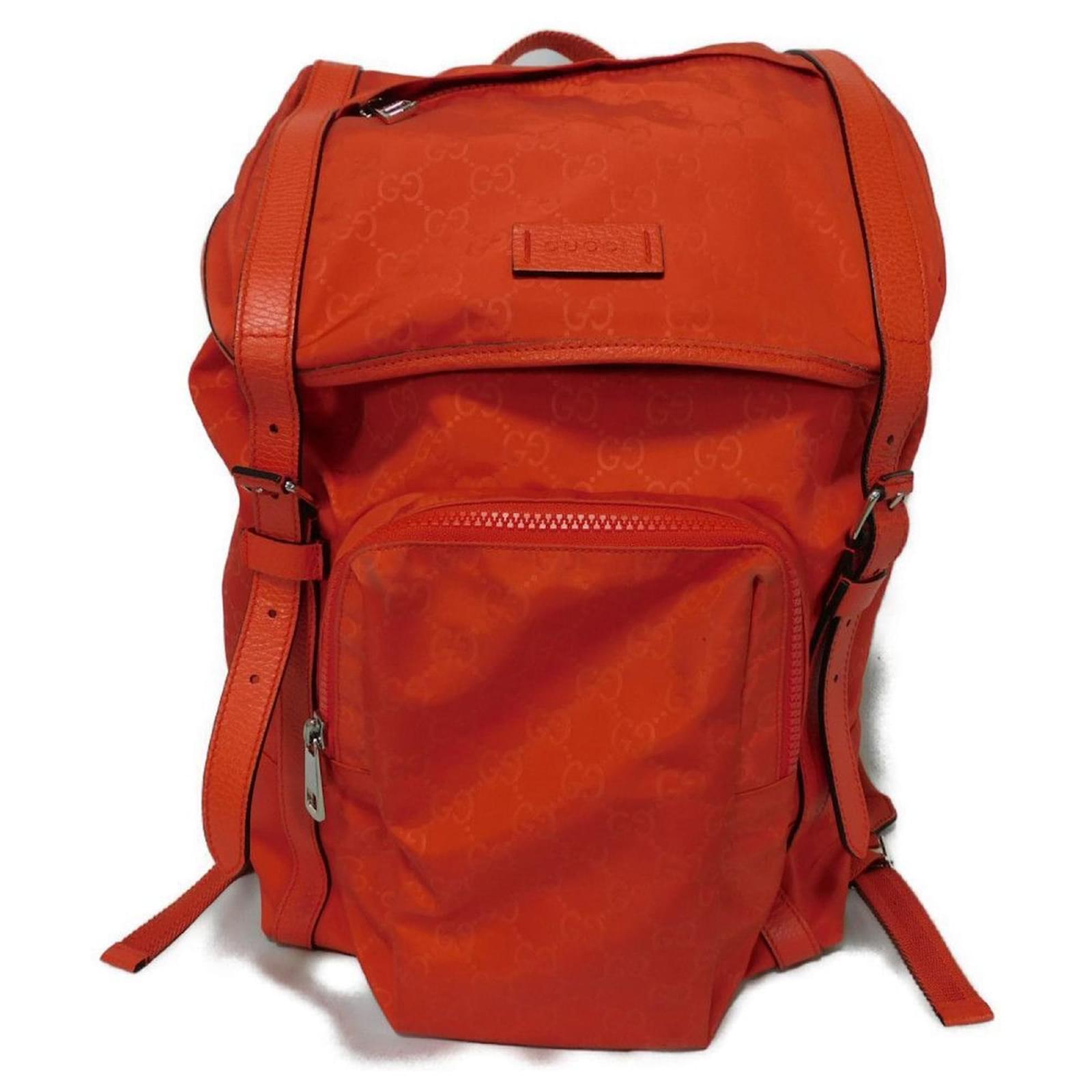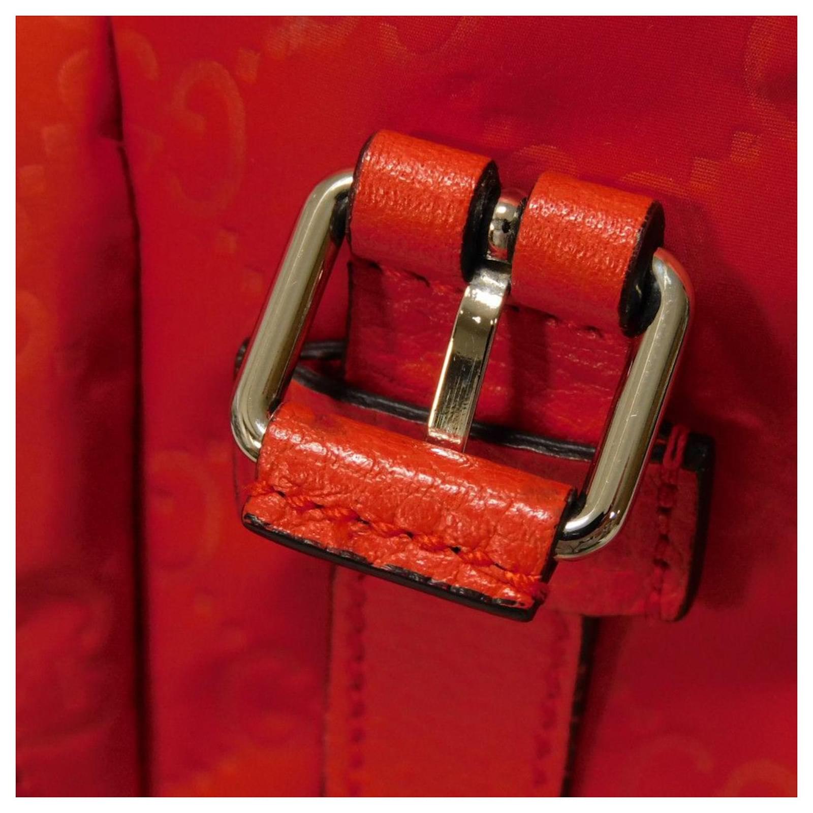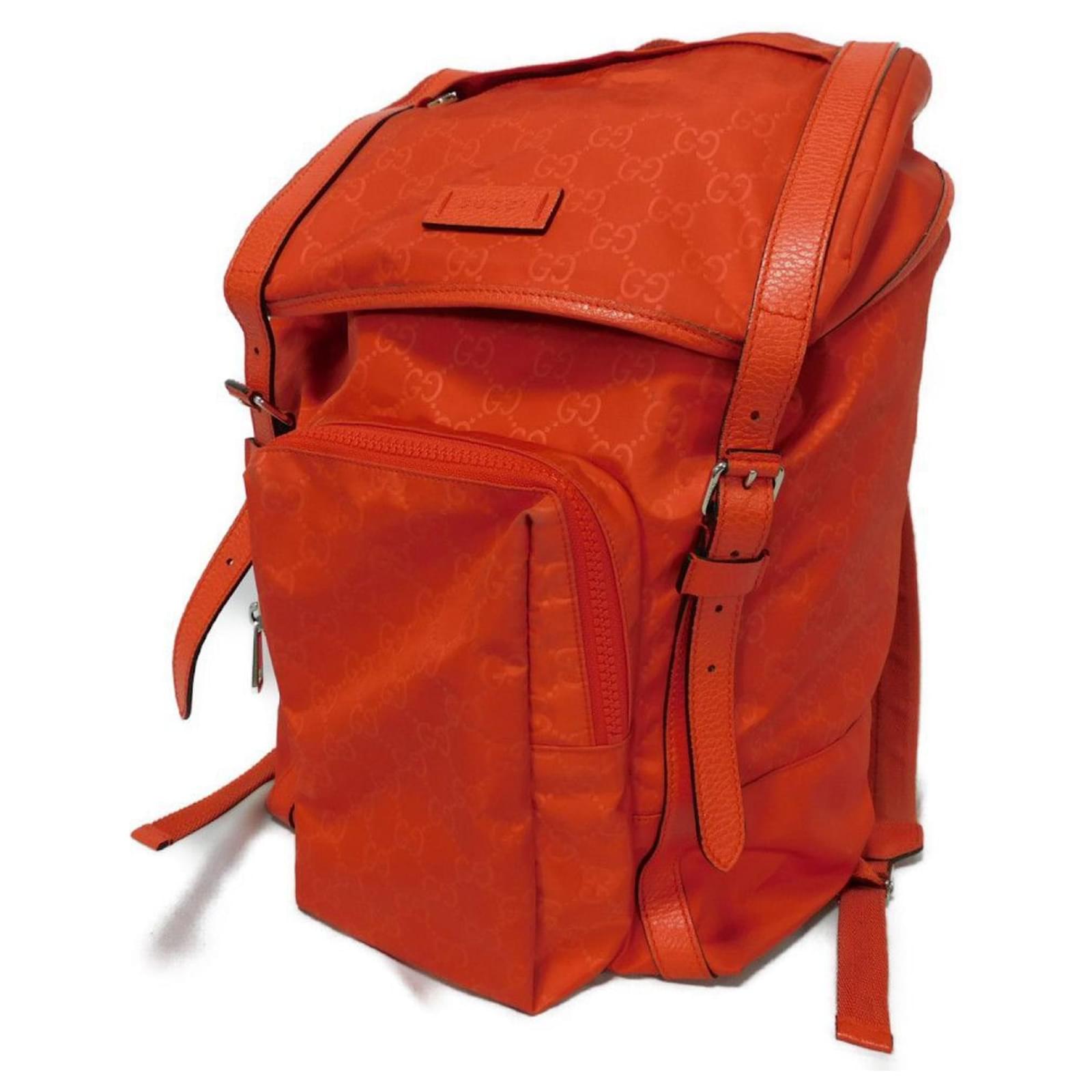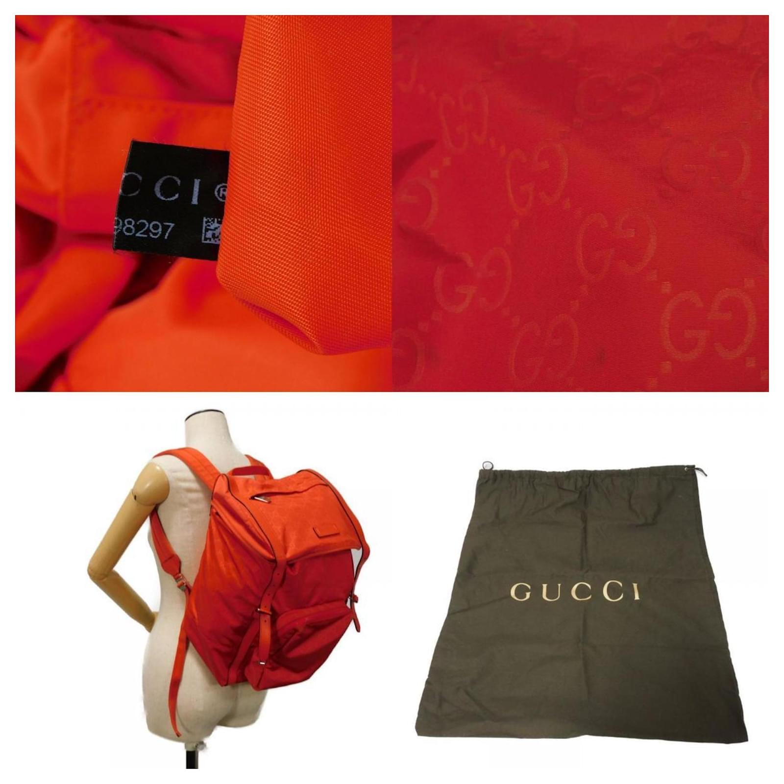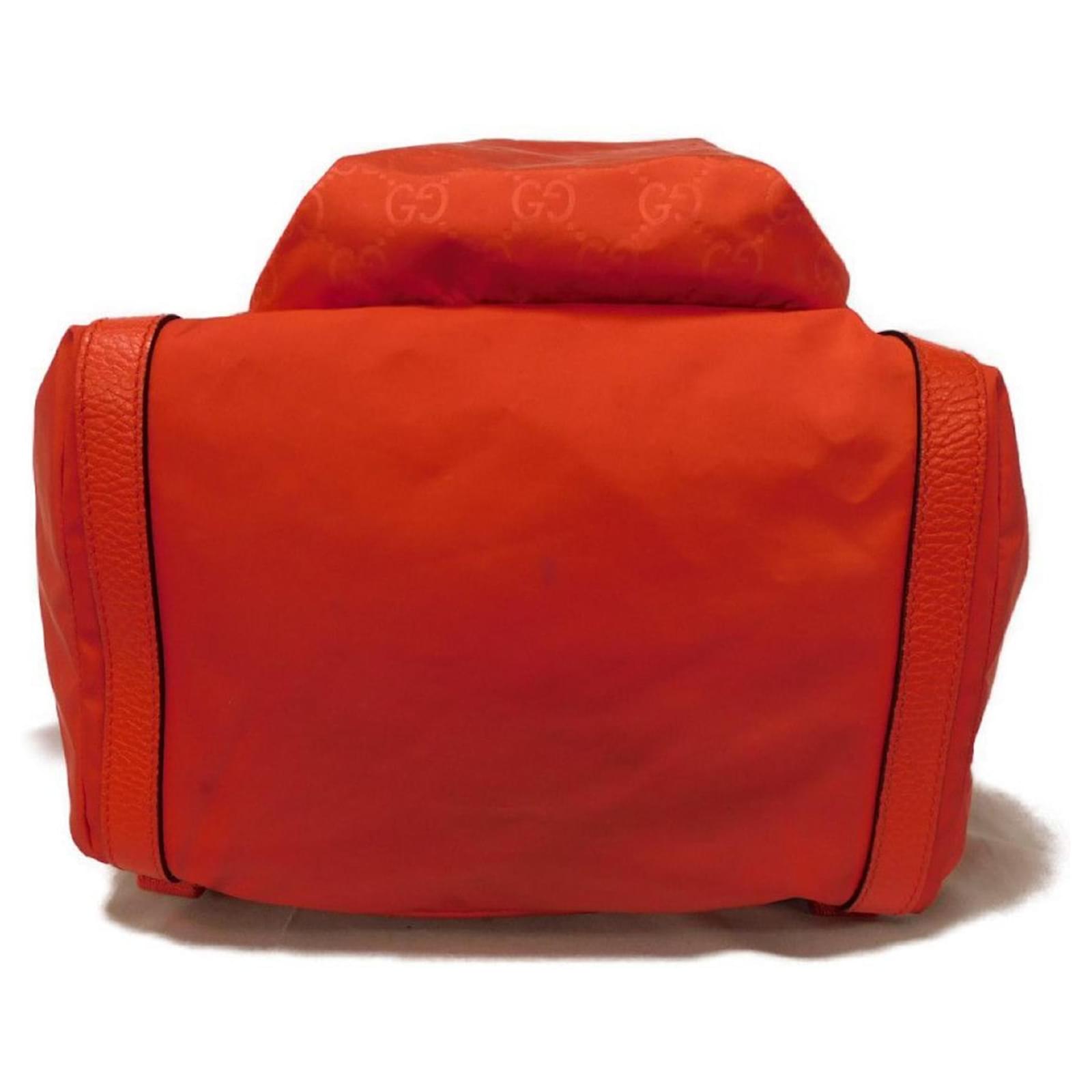 This Gucci GG Nylon Daypack features a striking orange red color and is crafted from a combination of nylon canvas and calfskin leather. The backpack is designed with silver hardware and includes a drawstring closure embossed with the iconic double G logo.