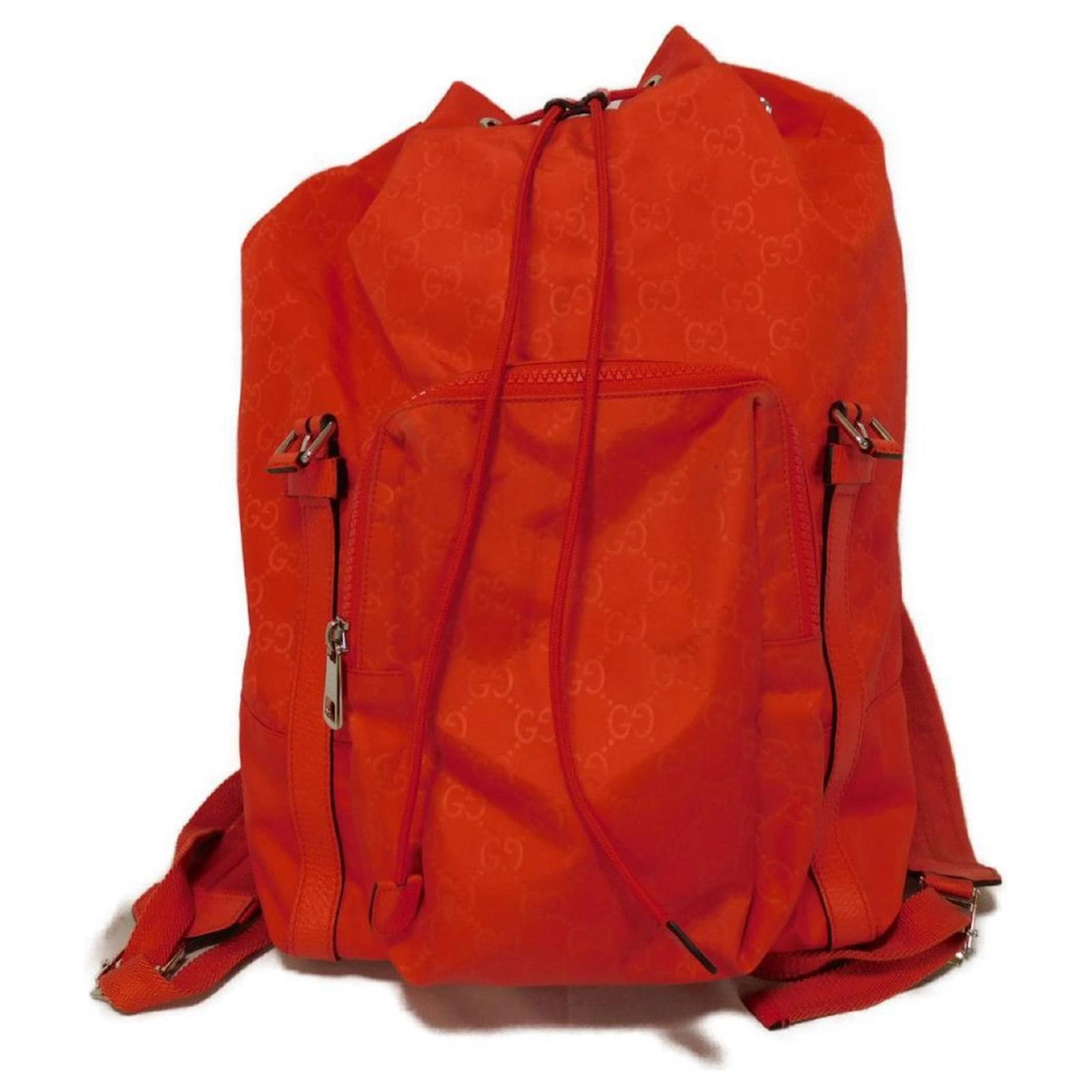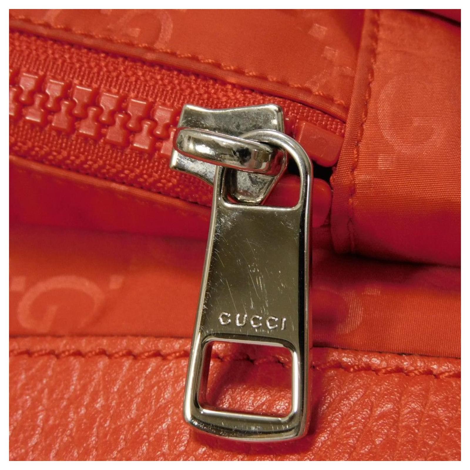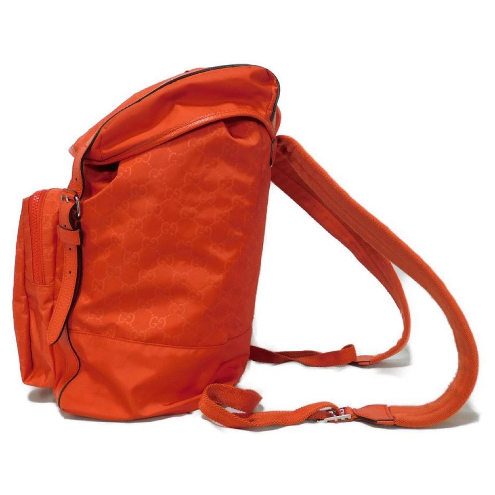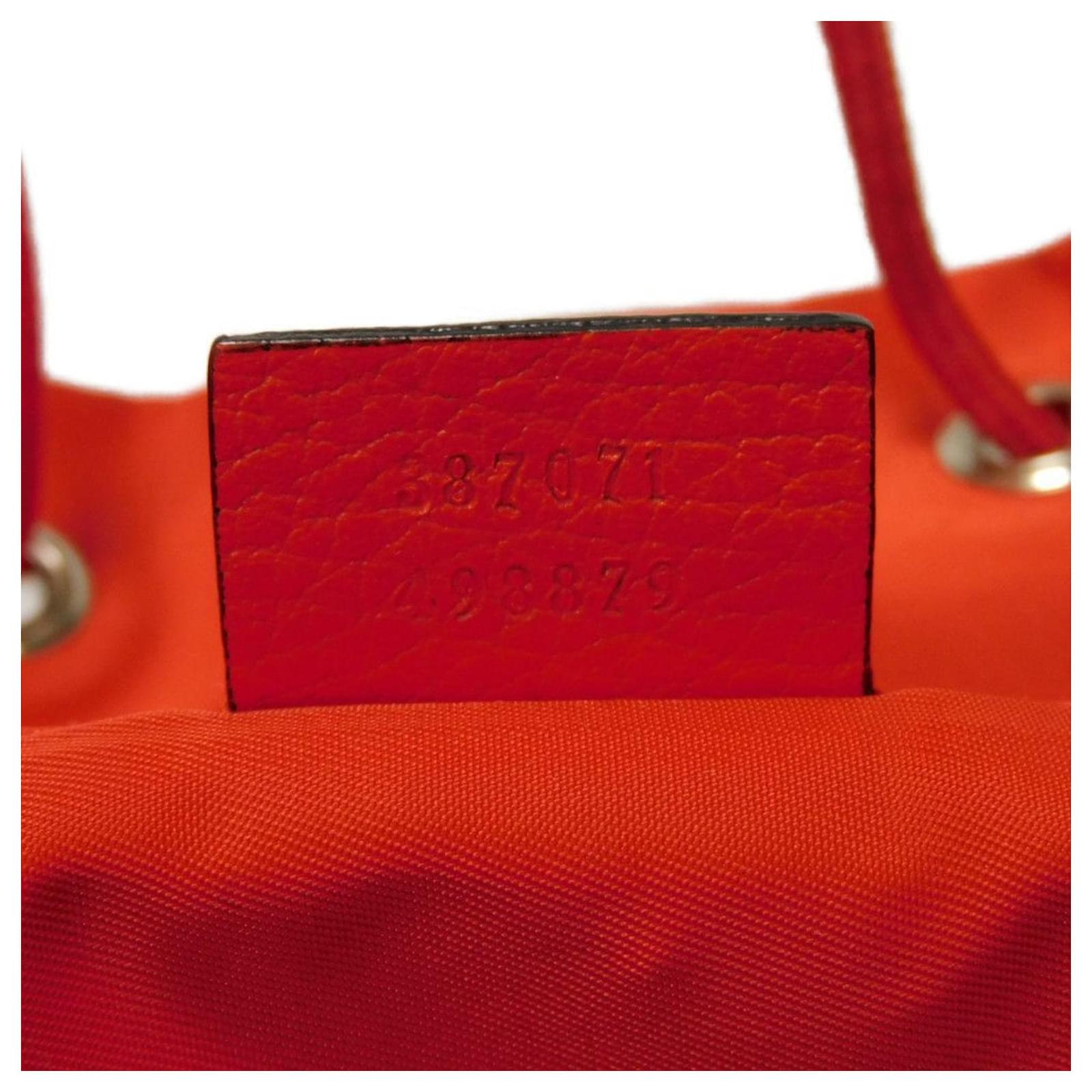 This Gucci GG Nylon Daypack features a striking orange red color and is crafted from a combination of nylon canvas and calfskin leather. The backpack is designed with silver hardware and includes a drawstring closure embossed with the iconic double G logo.