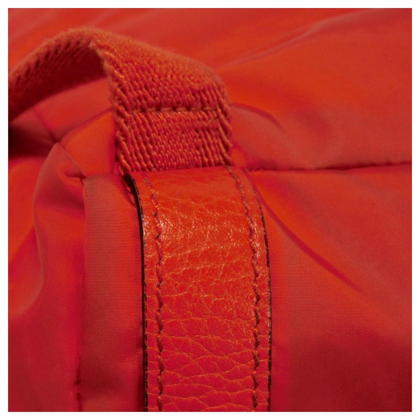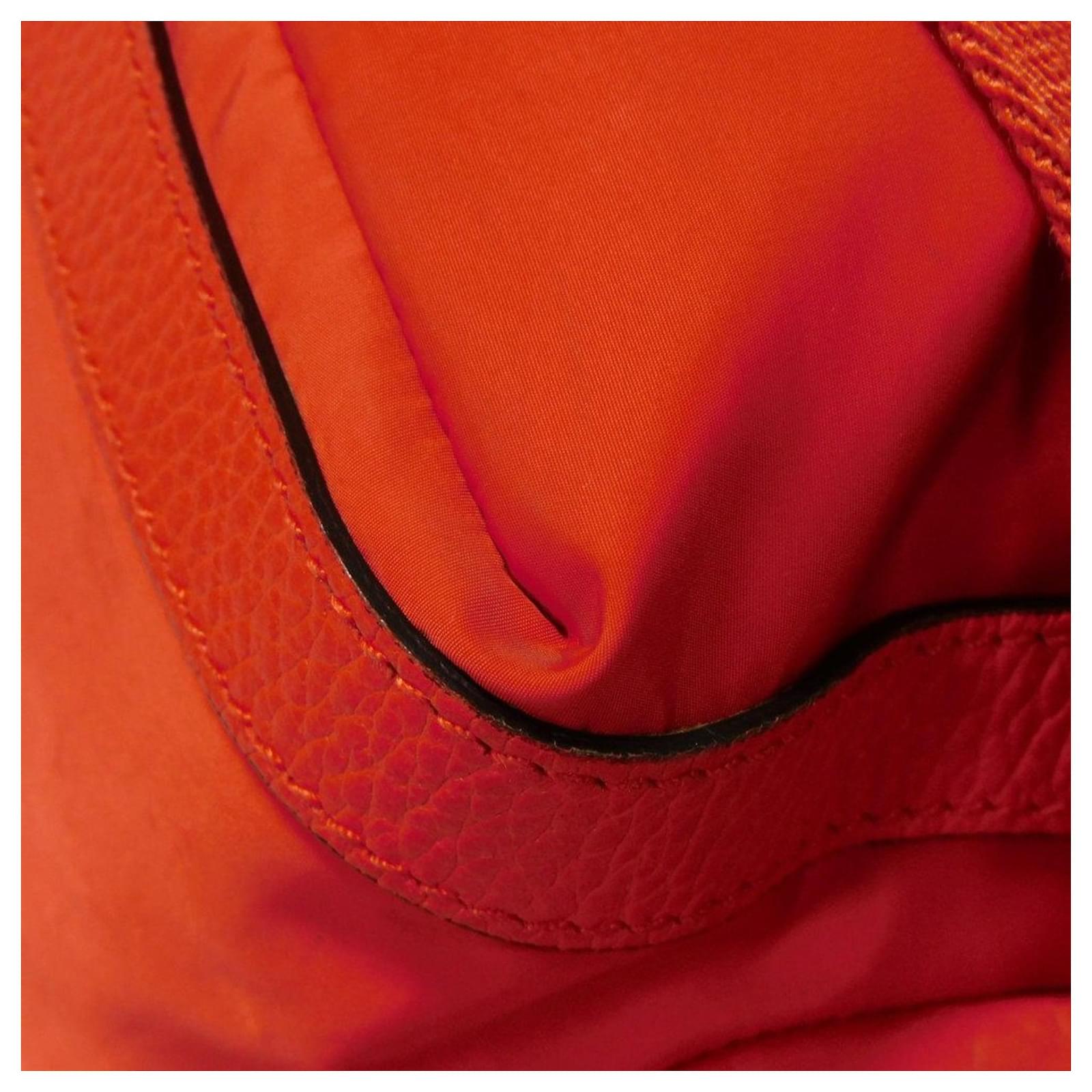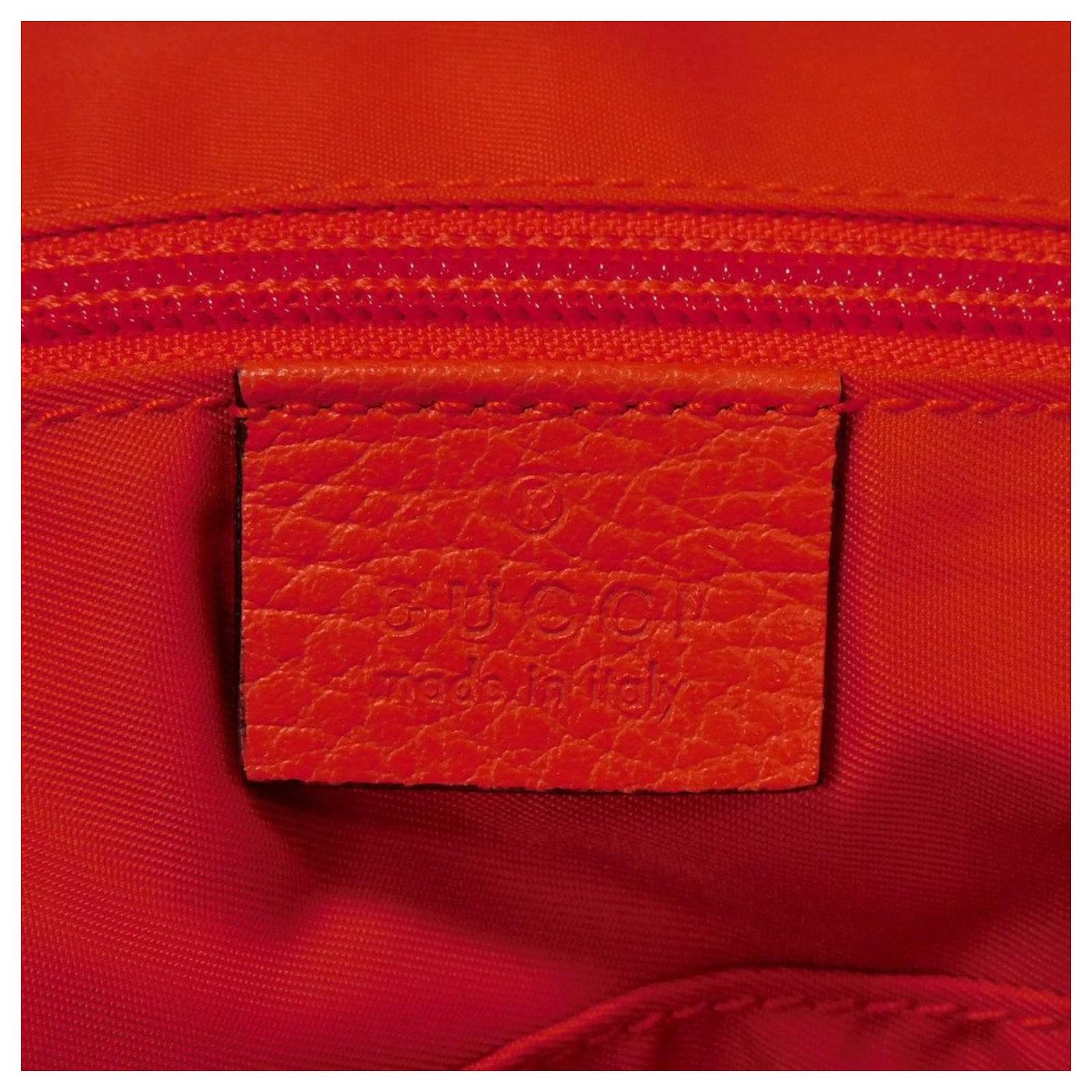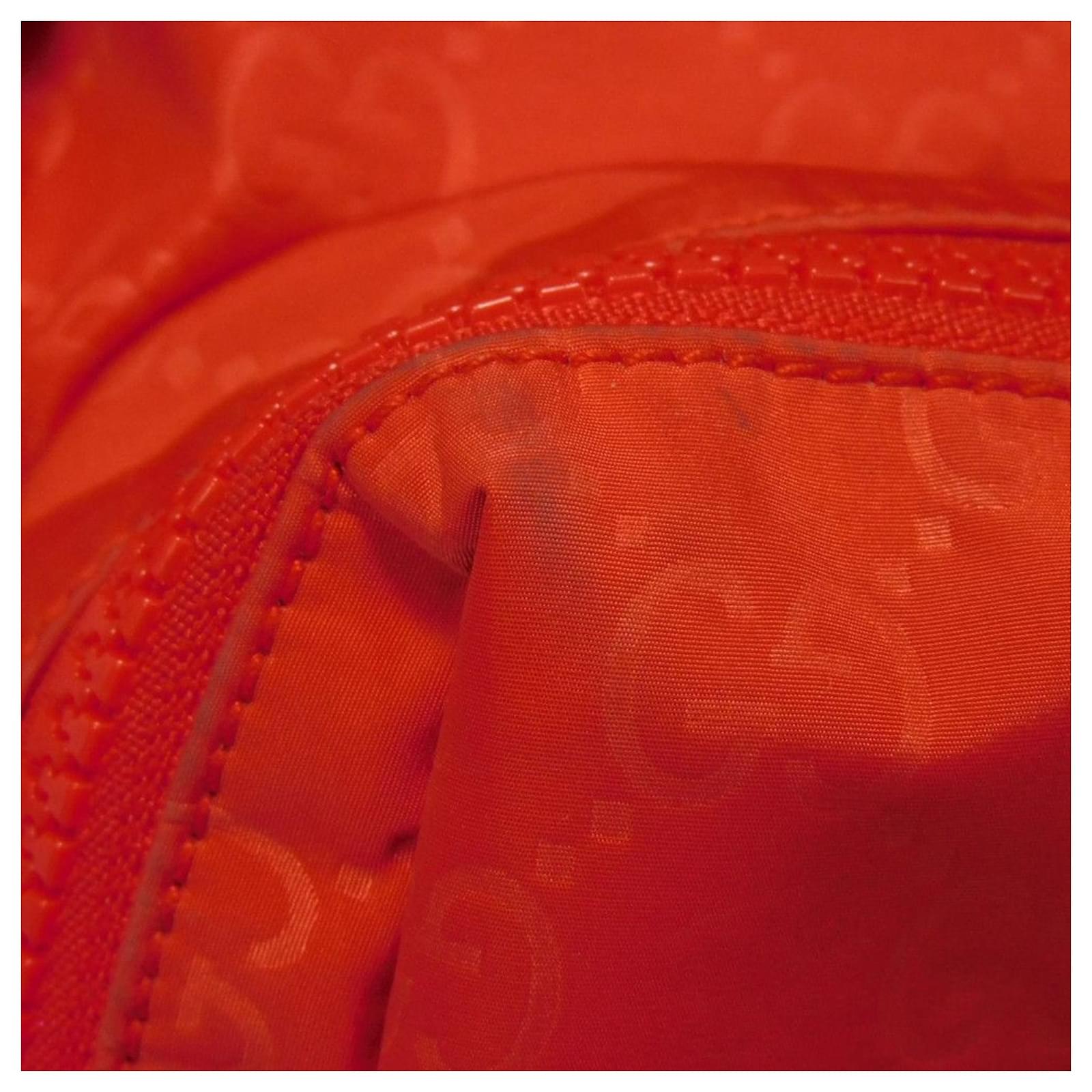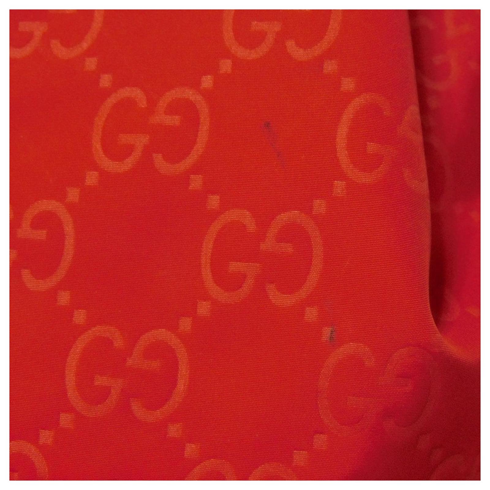 This Gucci GG Nylon Daypack features a striking orange red color and is crafted from a combination of nylon canvas and calfskin leather. The backpack is designed with silver hardware and includes a drawstring closure embossed with the iconic double G logo.