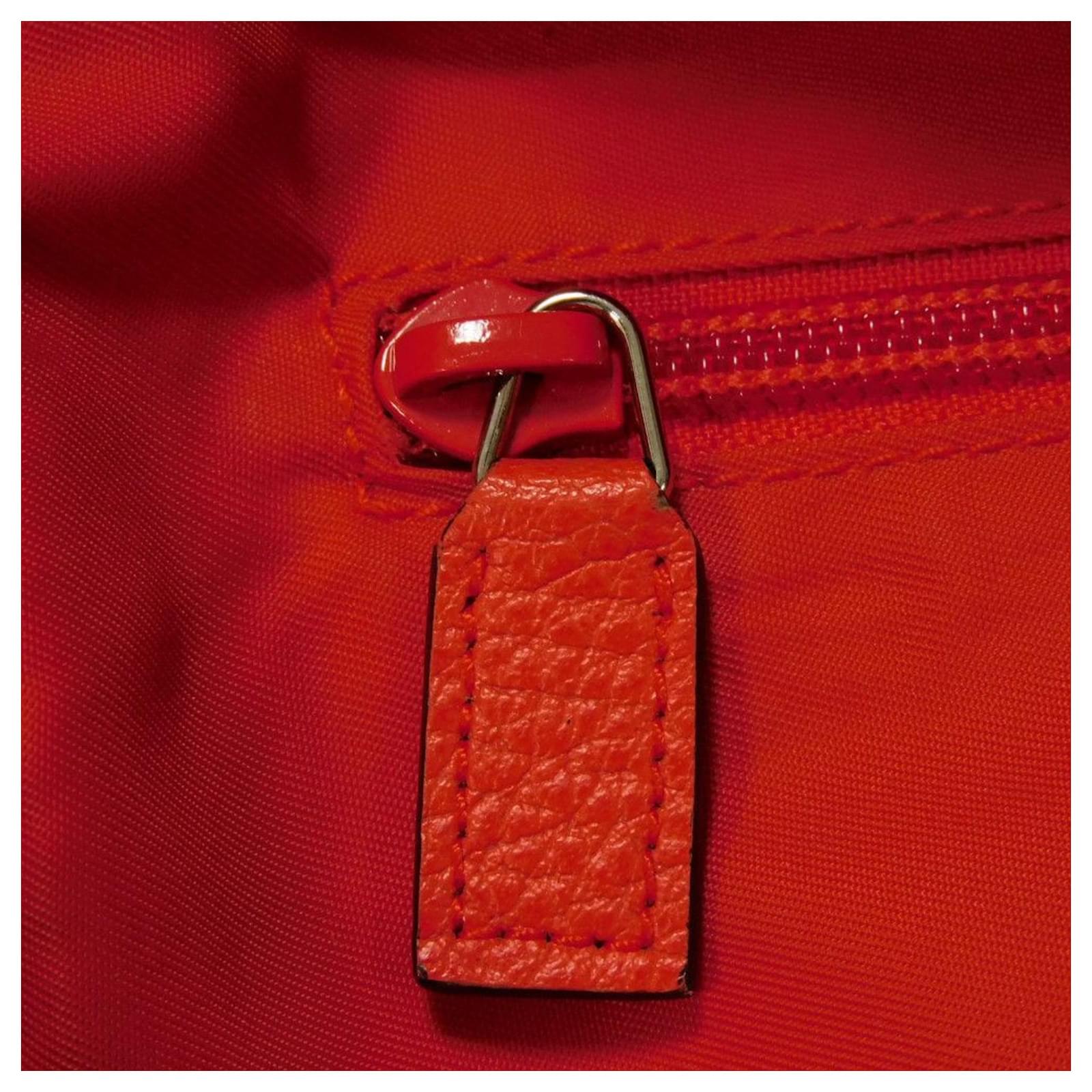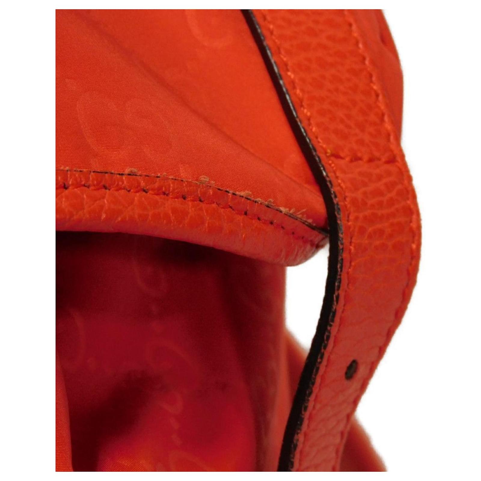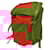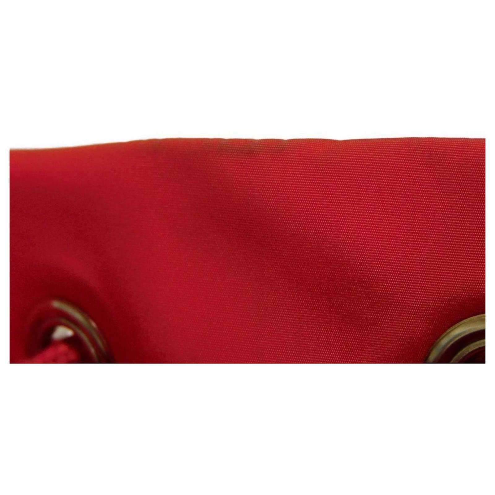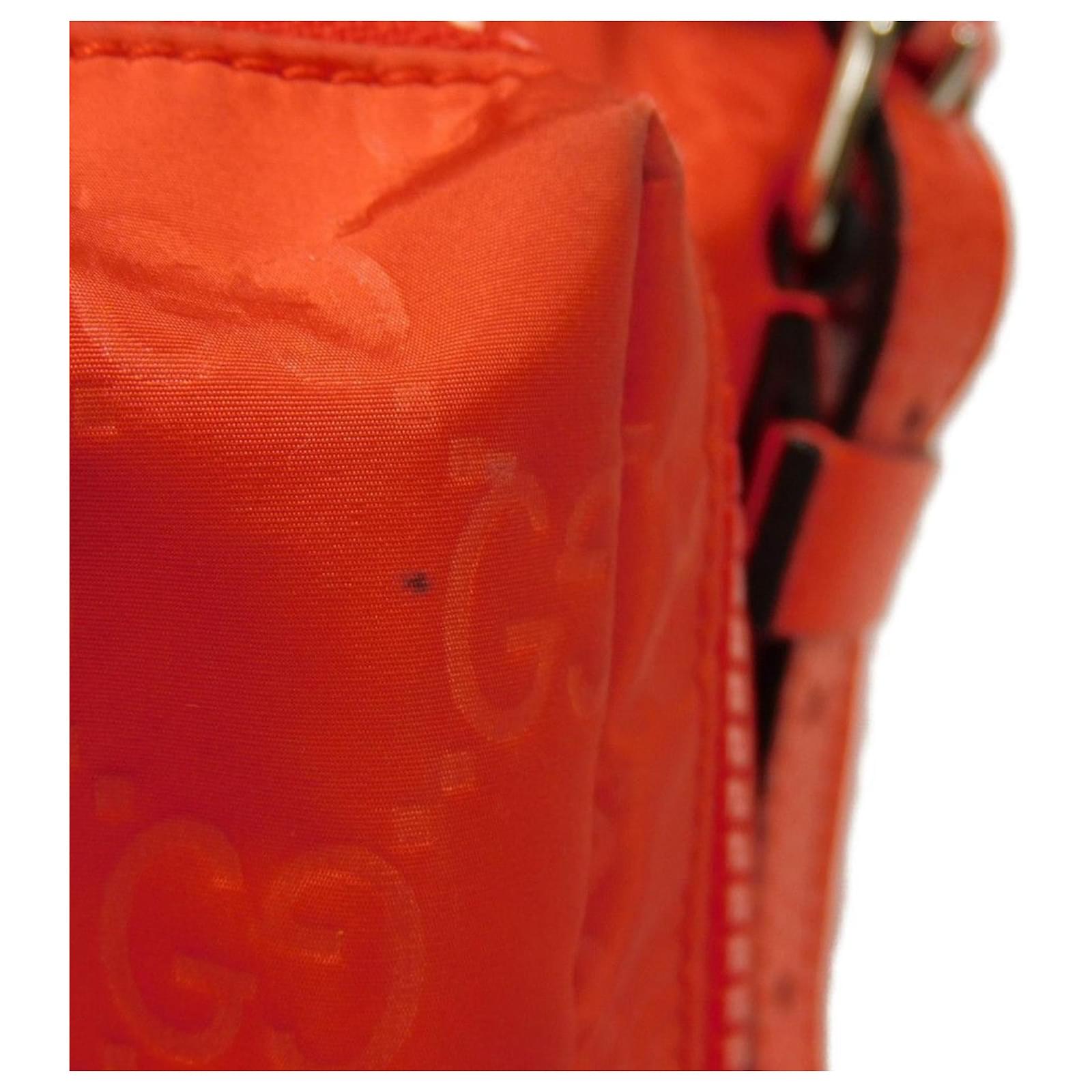 This Gucci GG Nylon Daypack features a striking orange red color and is crafted from a combination of nylon canvas and calfskin leather. The backpack is designed with silver hardware and includes a drawstring closure embossed with the iconic double G logo.