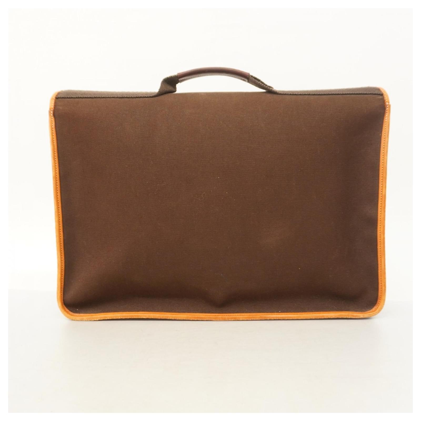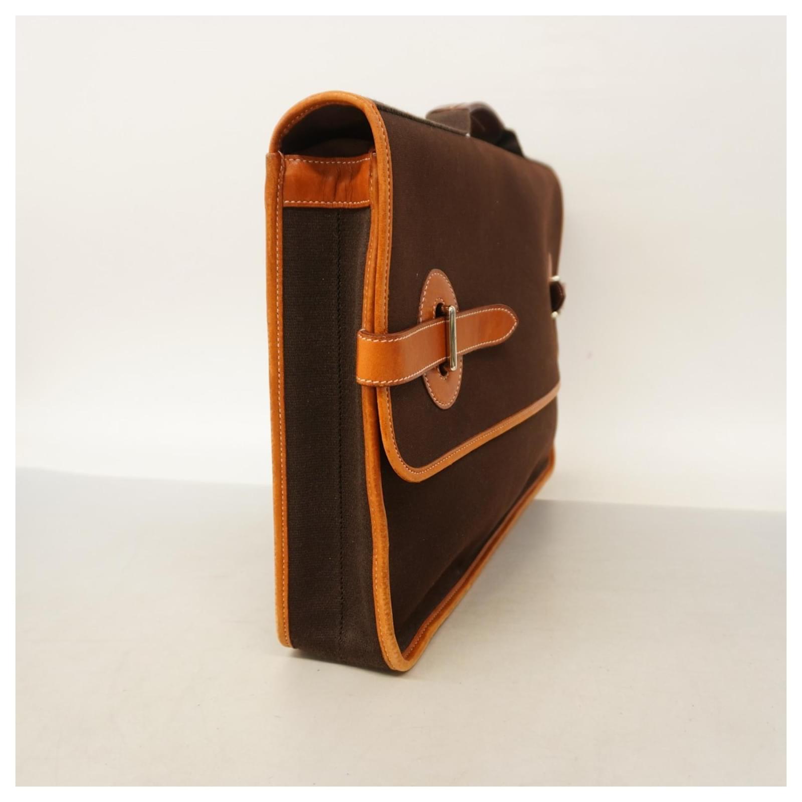 This Hermes Hermès Buenaventura MM briefcase is crafted from Toile officier material in a brown color, complemented by silver hardware. With dimensions of 29cm x 39cm x 7cm, it offers a practical size for daily use. The bag is classified as used (acceptable) with moderate traces of use, including scratches and dirt, but remains in acceptable condition for continued usage. It comes with a dust bag for storage. Potential buyers are encouraged to review the images for a clear understanding of the item's condition and included accessories.