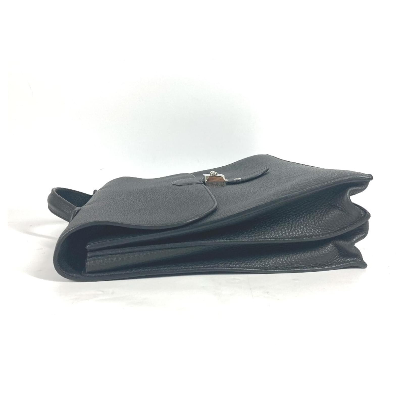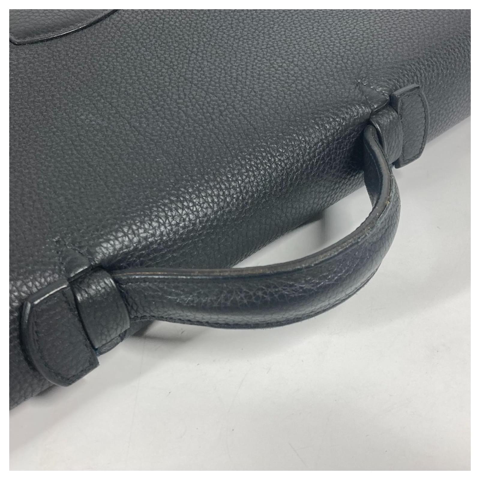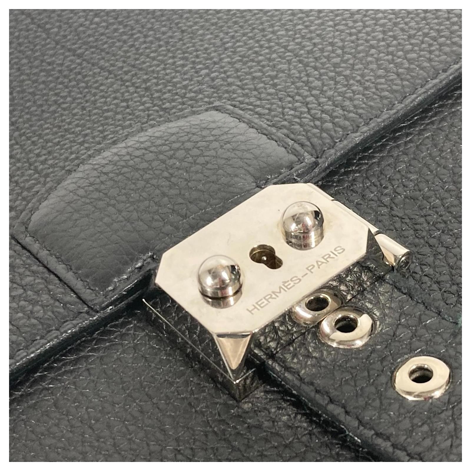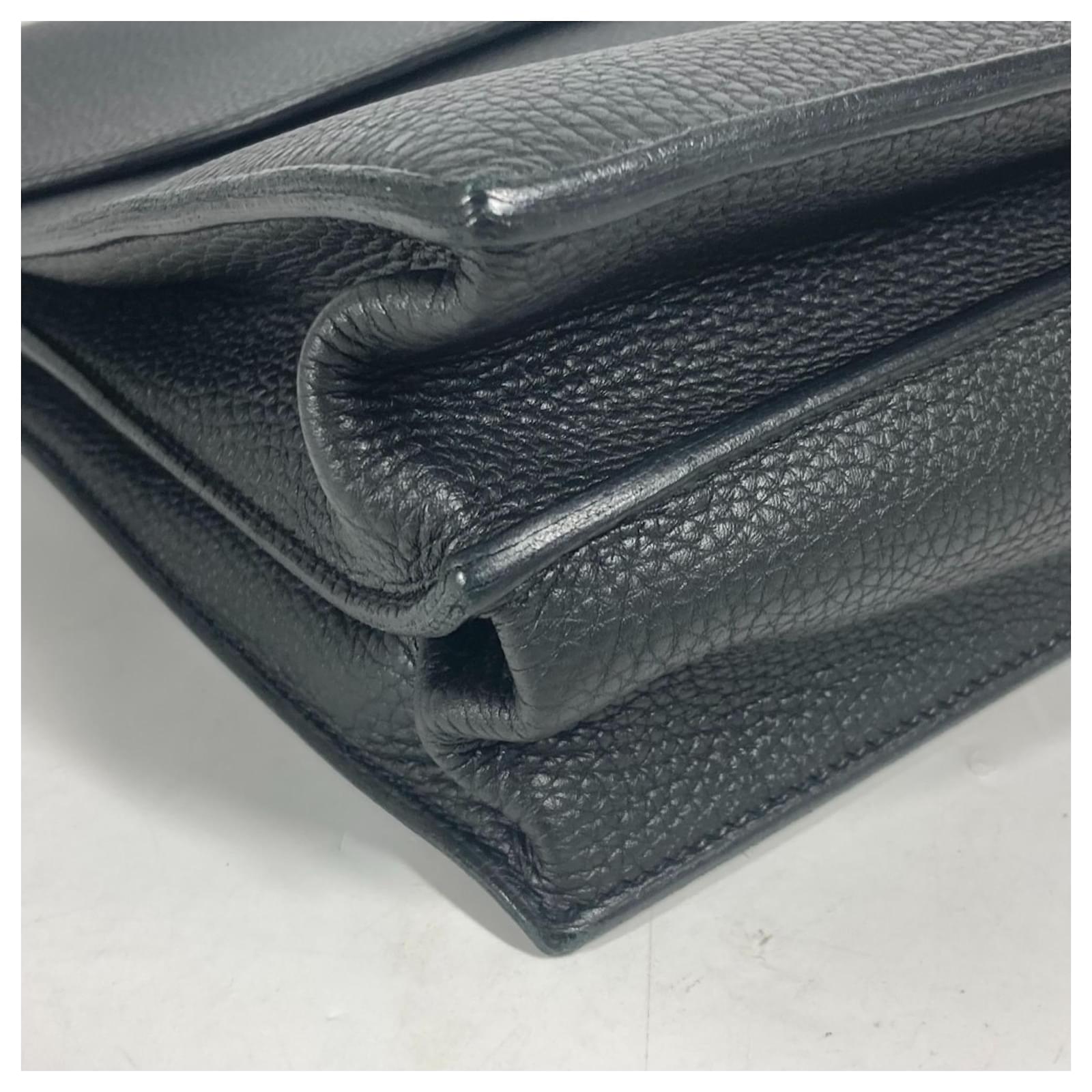 This Hermes briefcase, known as the Sac A Depeche 38, is crafted from Togo leather in a classic black color. It features silver hardware and measures 30.5cm in height, 38.5cm in width, and 13cm in depth, making it suitable for business use. The item is in used condition, rated as "like new" with hardly any traces of usage, and has insignificant overall peeling, scratches, and dirt. Included with the briefcase are a box, clochette, dust bag, and key. Potential buyers are encouraged to review the images for a detailed view of the item's condition and included accessories.