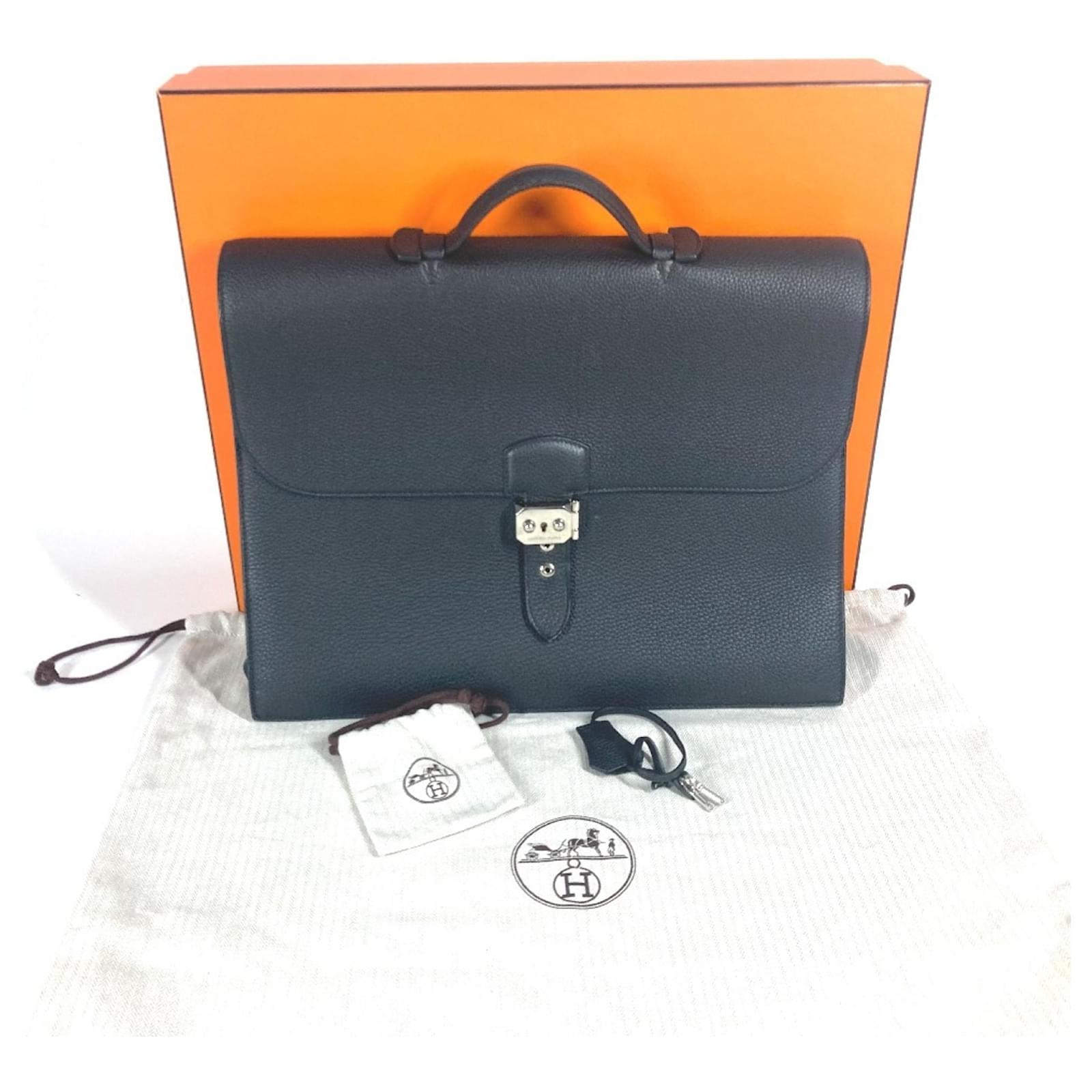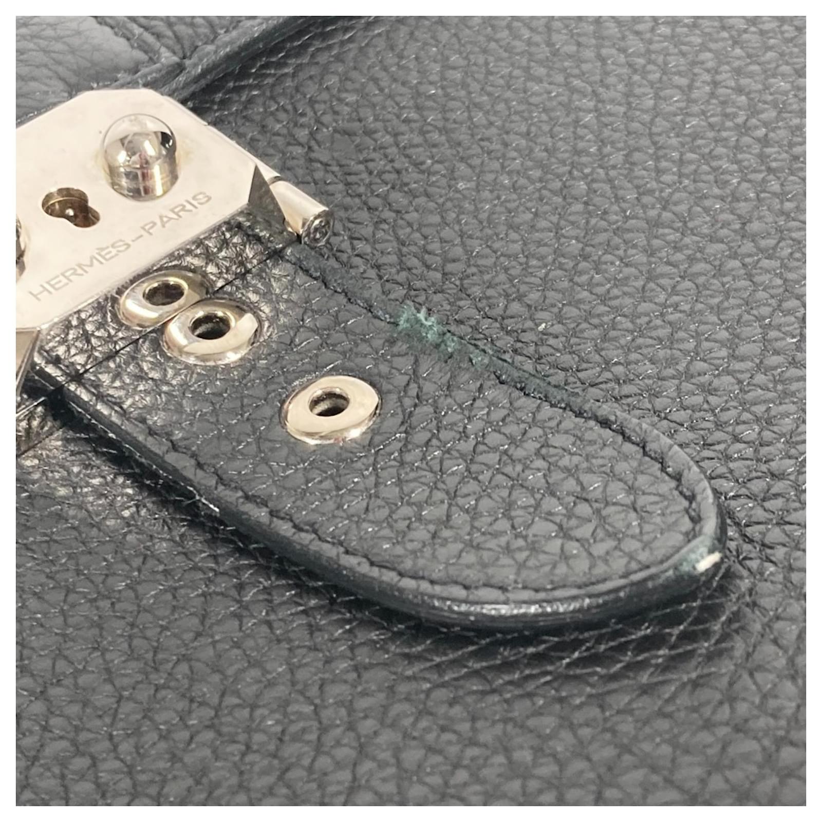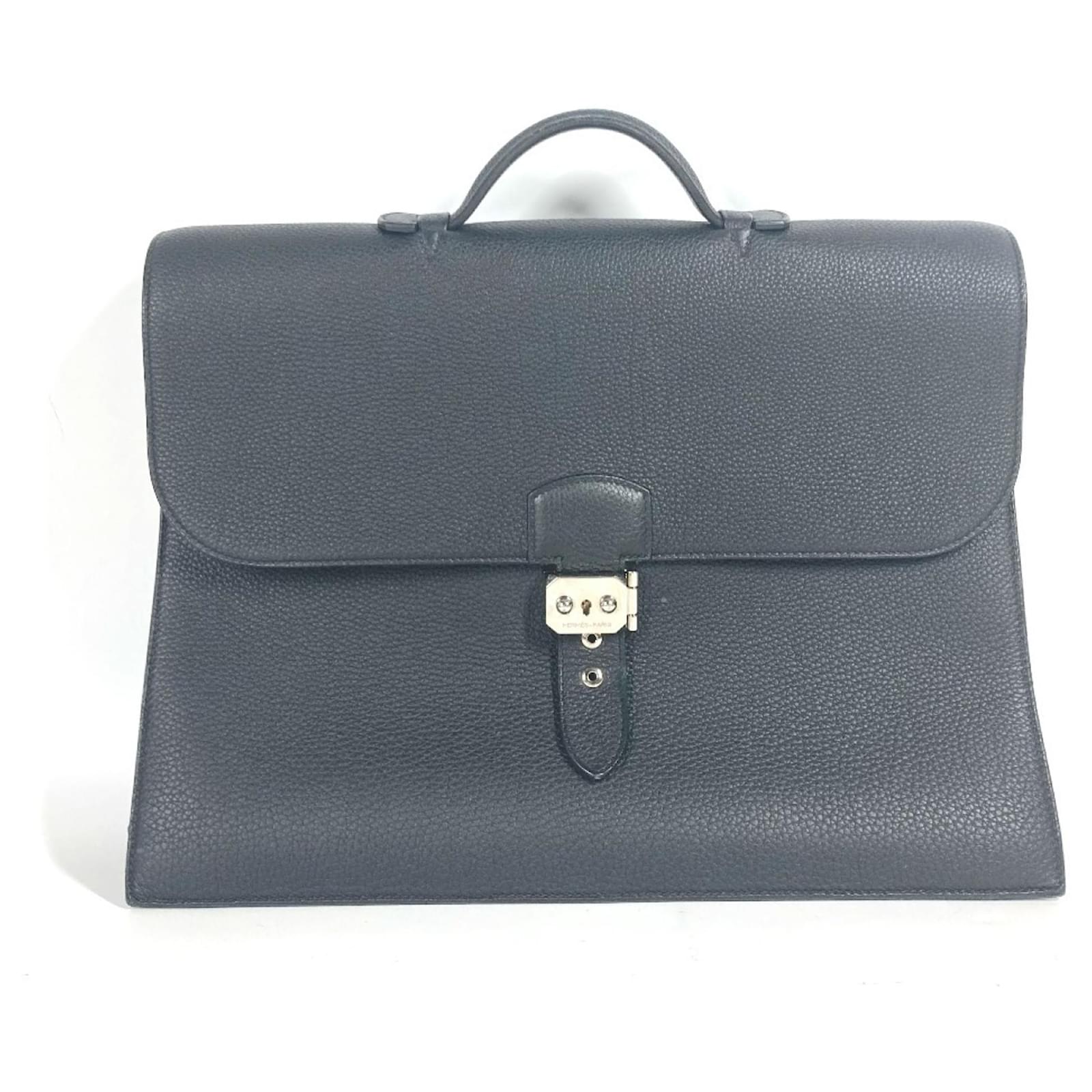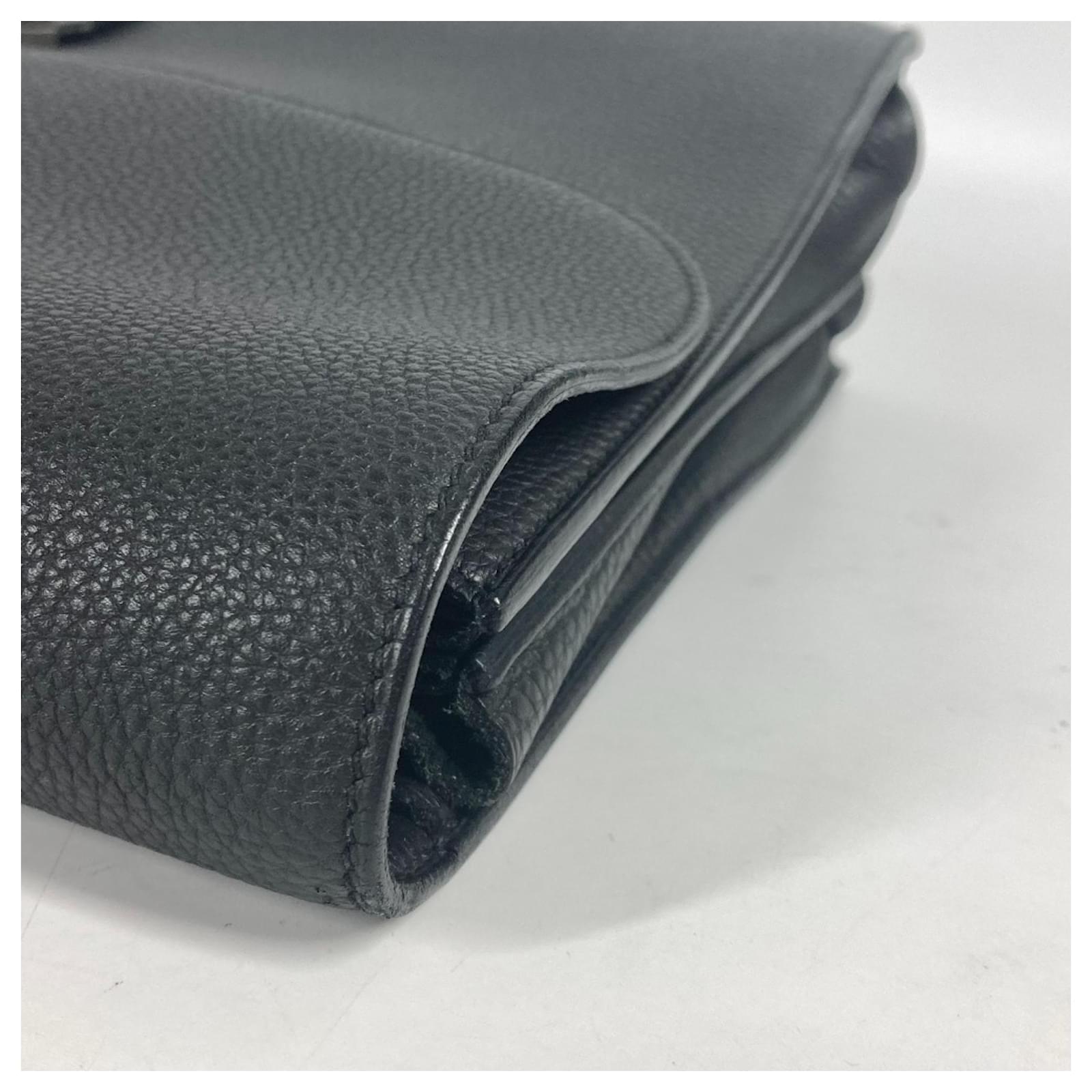 This Hermes briefcase, known as the Sac A Depeche 38, is crafted from Togo leather in a classic black color. It features silver hardware and measures 30.5cm in height, 38.5cm in width, and 13cm in depth, making it suitable for business use. The item is in used condition, rated as "like new" with hardly any traces of usage, and has insignificant overall peeling, scratches, and dirt. Included with the briefcase are a box, clochette, dust bag, and key. Potential buyers are encouraged to review the images for a detailed view of the item's condition and included accessories.