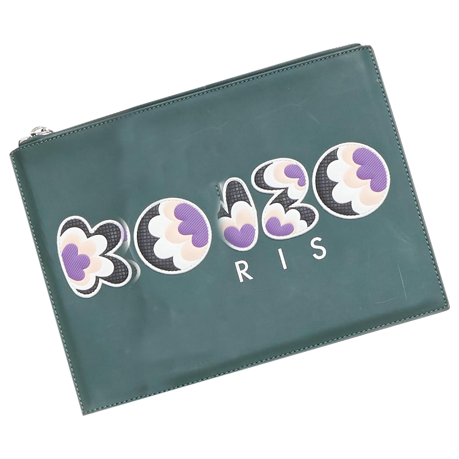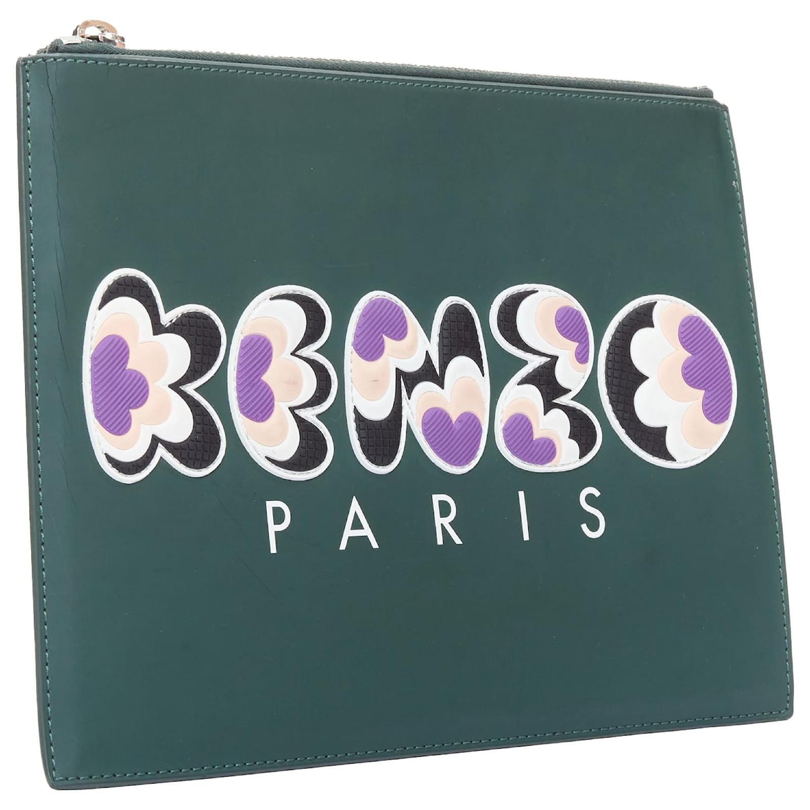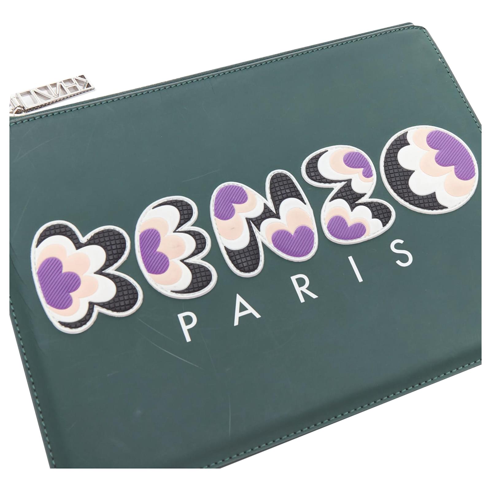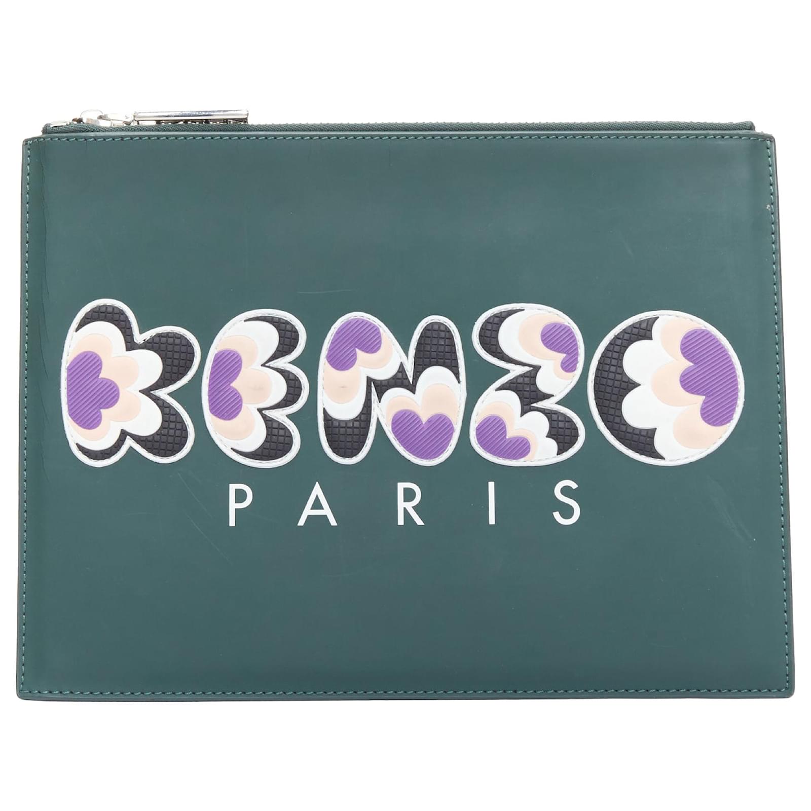 KENZO dark green purple debossed rubber logo portfolio zip clutchReference: BNAY/A00042Brand: KenzoMaterial: LeatherColor: Green, MulticolourPattern: SolidClosure: ZipLining: Black FabricExtra Details: Leather clutch detailed with coloured rubber logo and zip fastening.CONDITION:Condition: Fair, this item was pre-owned and is in fair condition. Please refer to image gallery for thorough condition check. Scratches at front and back. White color transfer at right side and back top.MEASUREMENTS: Width (width across base): 30cm / 11.7"Height (base to opening): 22.5cm / 8.8"Depth (side depth): 22.5cm / 8.8" Kenzo. This Kenzo item is authentic. Measurments: width: 225 mm length: 300 mm height: 225 mm