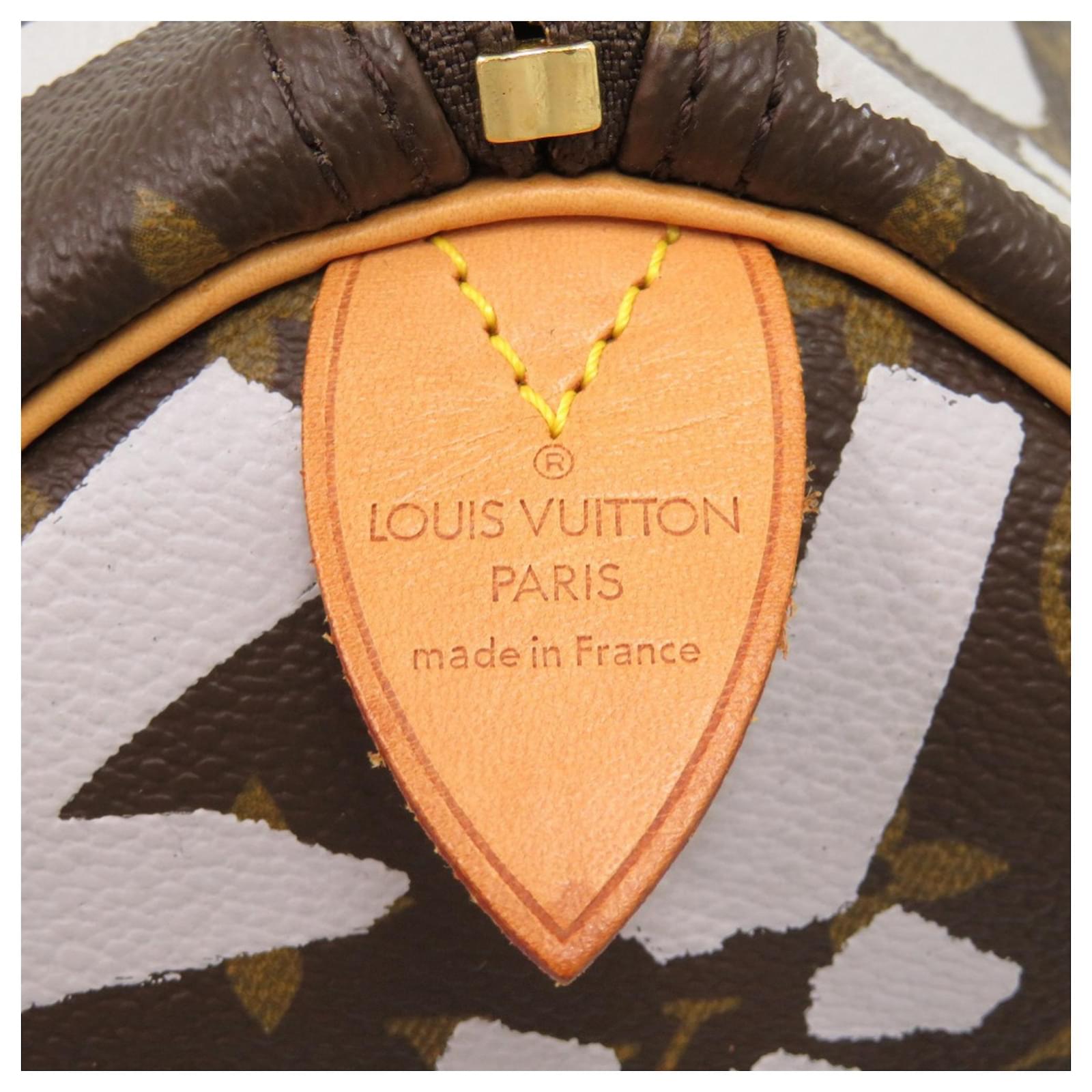 The Louis Vuitton Keepall 50 Monogram Graffiti bag features a sophisticated design in brown, white, and gold, crafted with Monogram Graffiti and Monogram materials. This Boston bag comes with a zipper closure for easy access and a handle length of 28 cm. The dimensions of the bag are 27 cm in height, 50 cm in width, and 22 cm in depth. It is a part of the Monogram Graffiti line and was made in France, bearing the model code M92197.