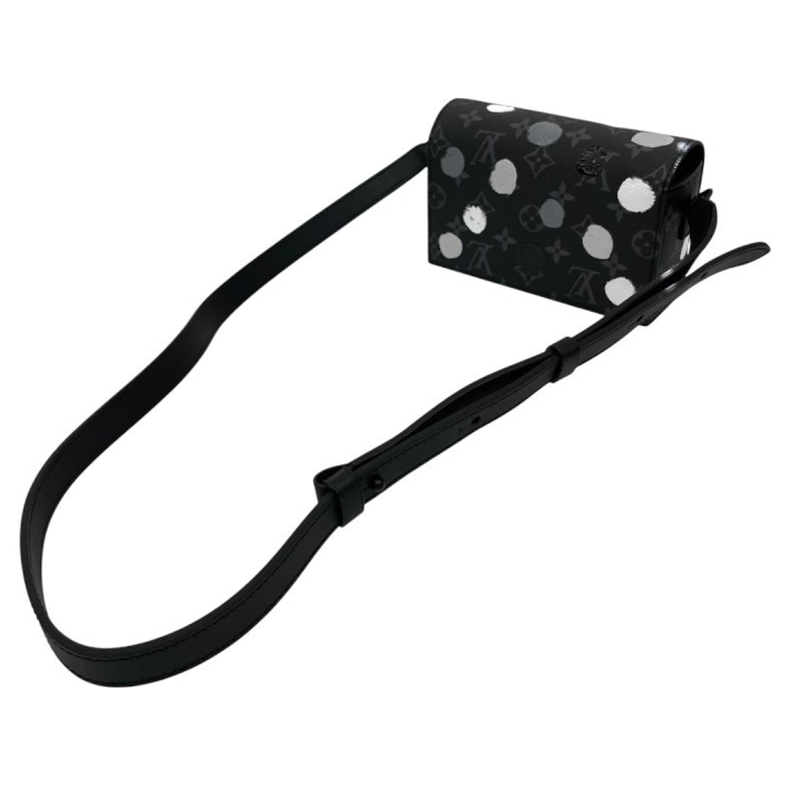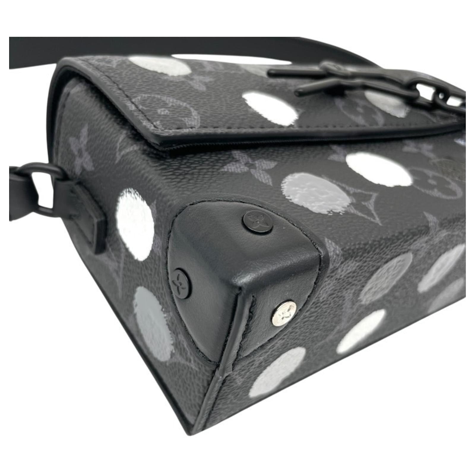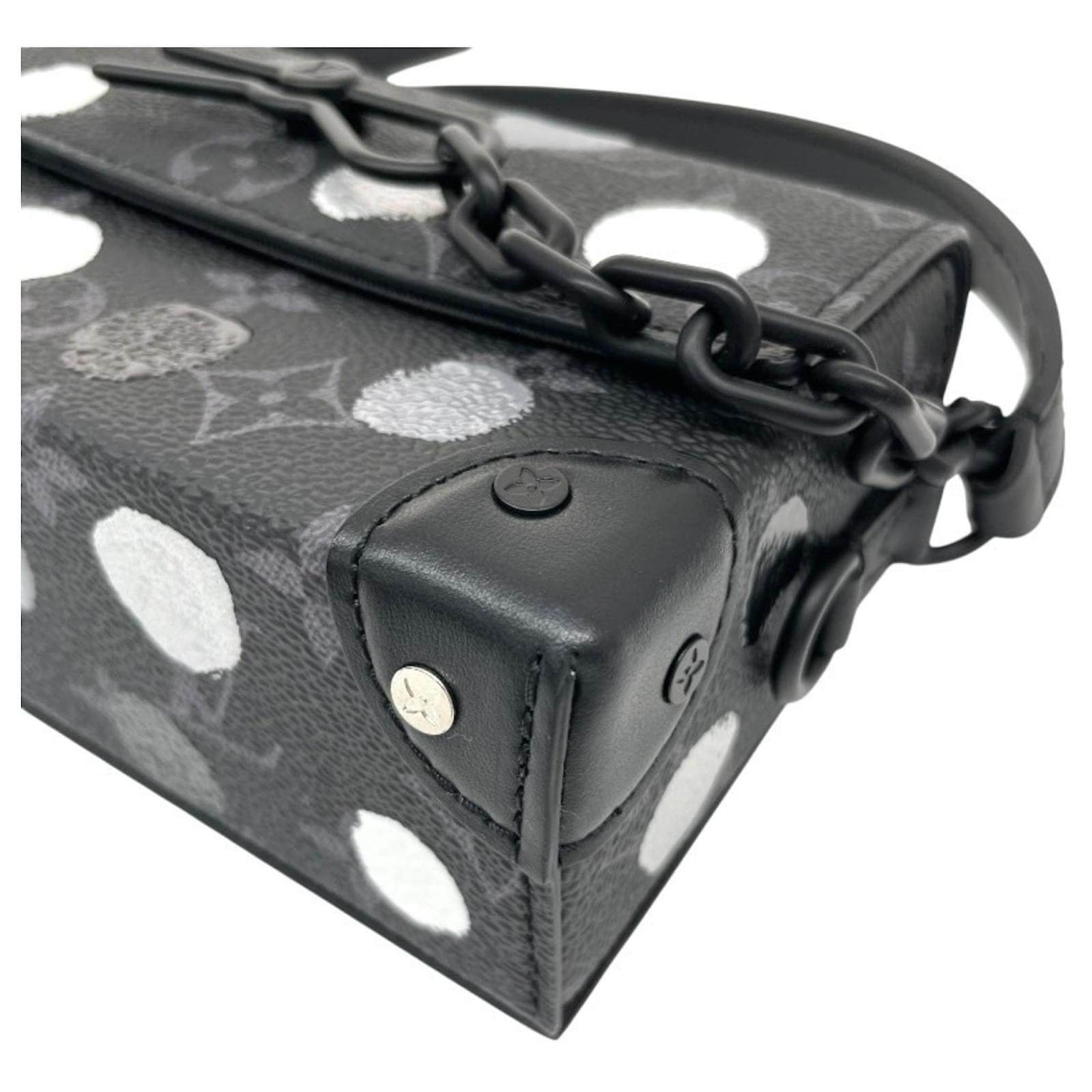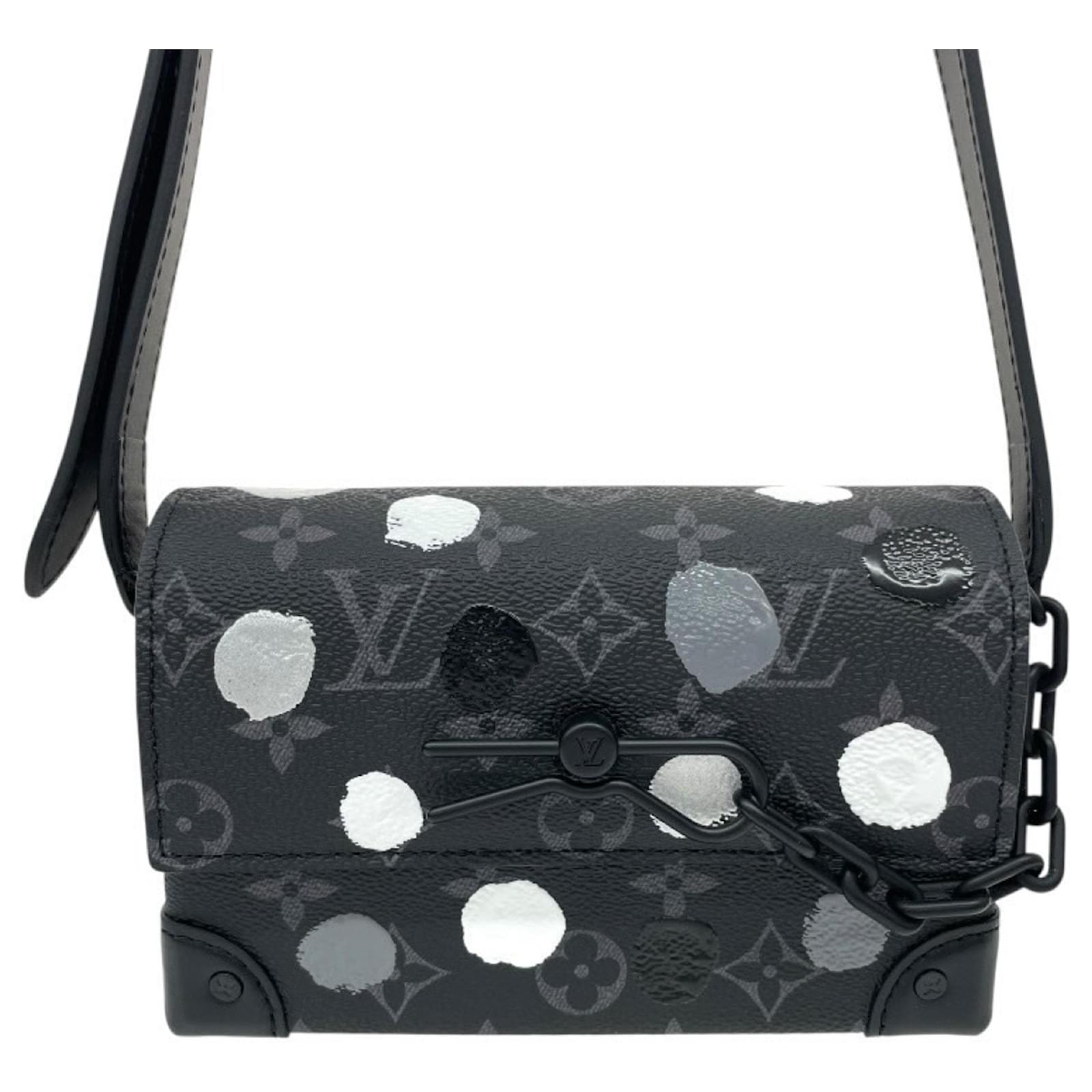 The Louis Vuitton Steamer Wearable Wallet M81935 is a men's shoulder bag designed in collaboration with Yayoi Kusama, featuring a distinctive Monogram Eclipse pattern. This black shoulder bag measures 10cm in height, 18cm in width, and 6cm in depth, making it a compact accessory for daily use.