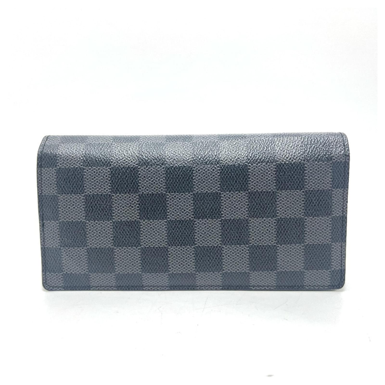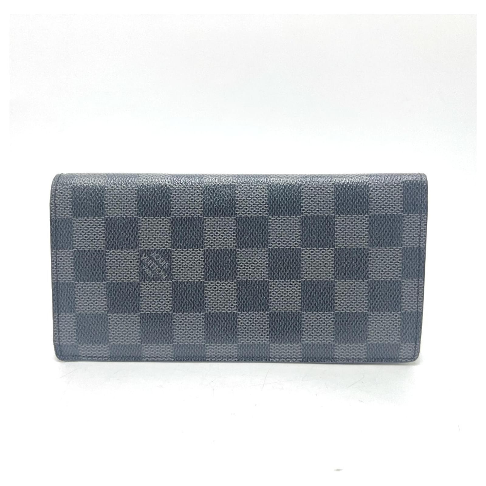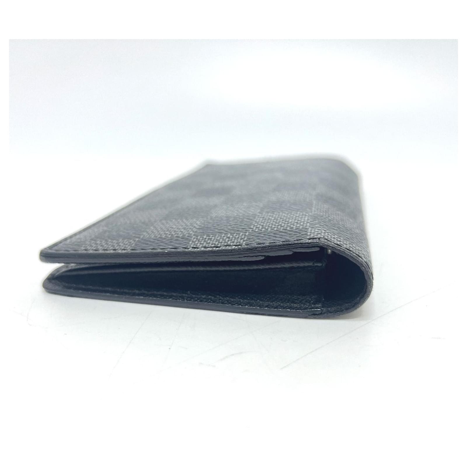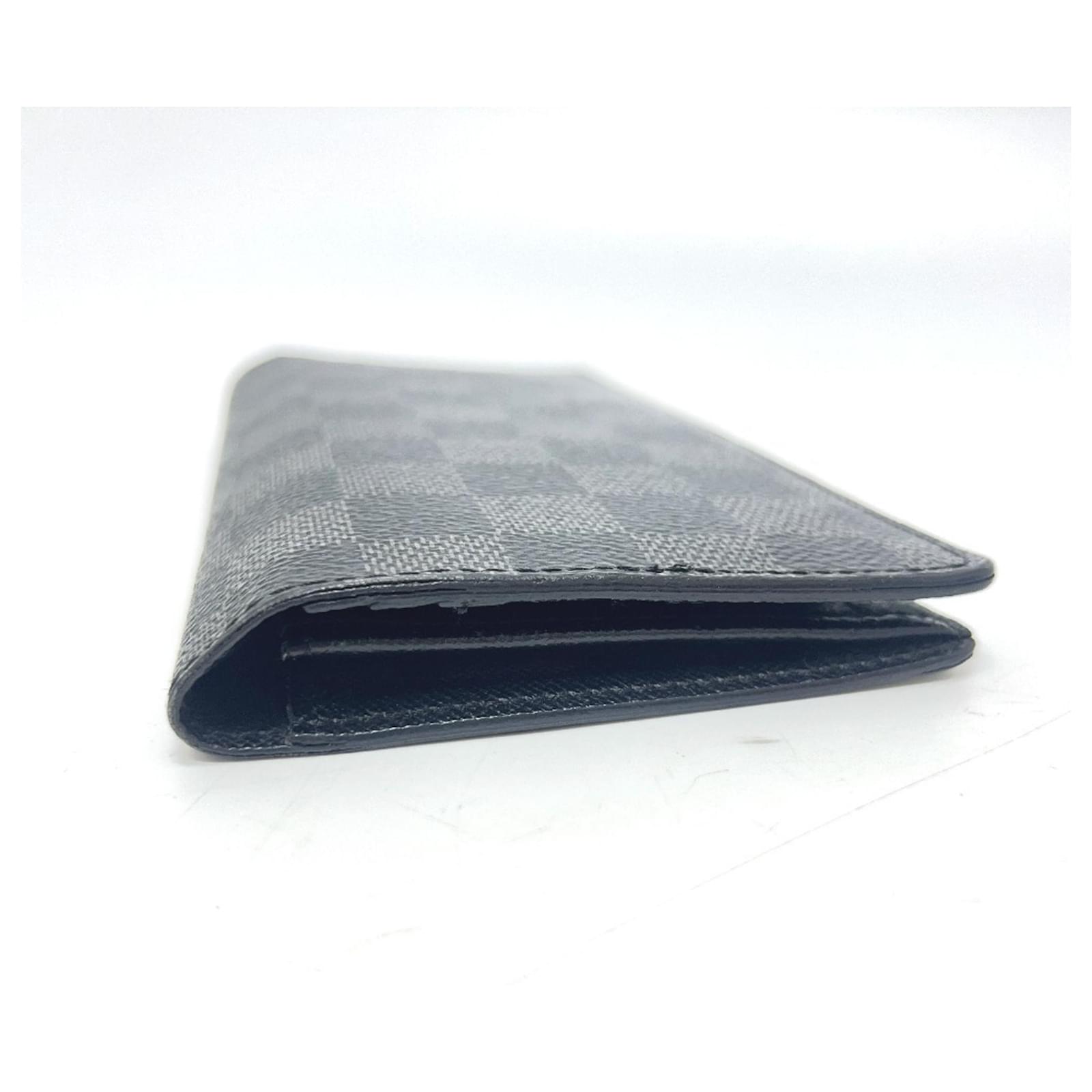 The Louis Vuitton N62665 Portefeuille Brazza is a long bi-fold wallet designed for men, featuring a classic black Damier Graphite canvas. Measuring 10cm x 19cm (3.93'' x 7.48''), this wallet offers ample space for essentials. It is listed as used and falls under Rank B condition, indicating that while it shows visible traces of use, such as slight cracks at the edges, creasing inside, and minor peelings in the coin case, it remains functional. It is important for potential buyers to consult the provided images to assess the item’s condition accurately. No accessories are included with this wallet.