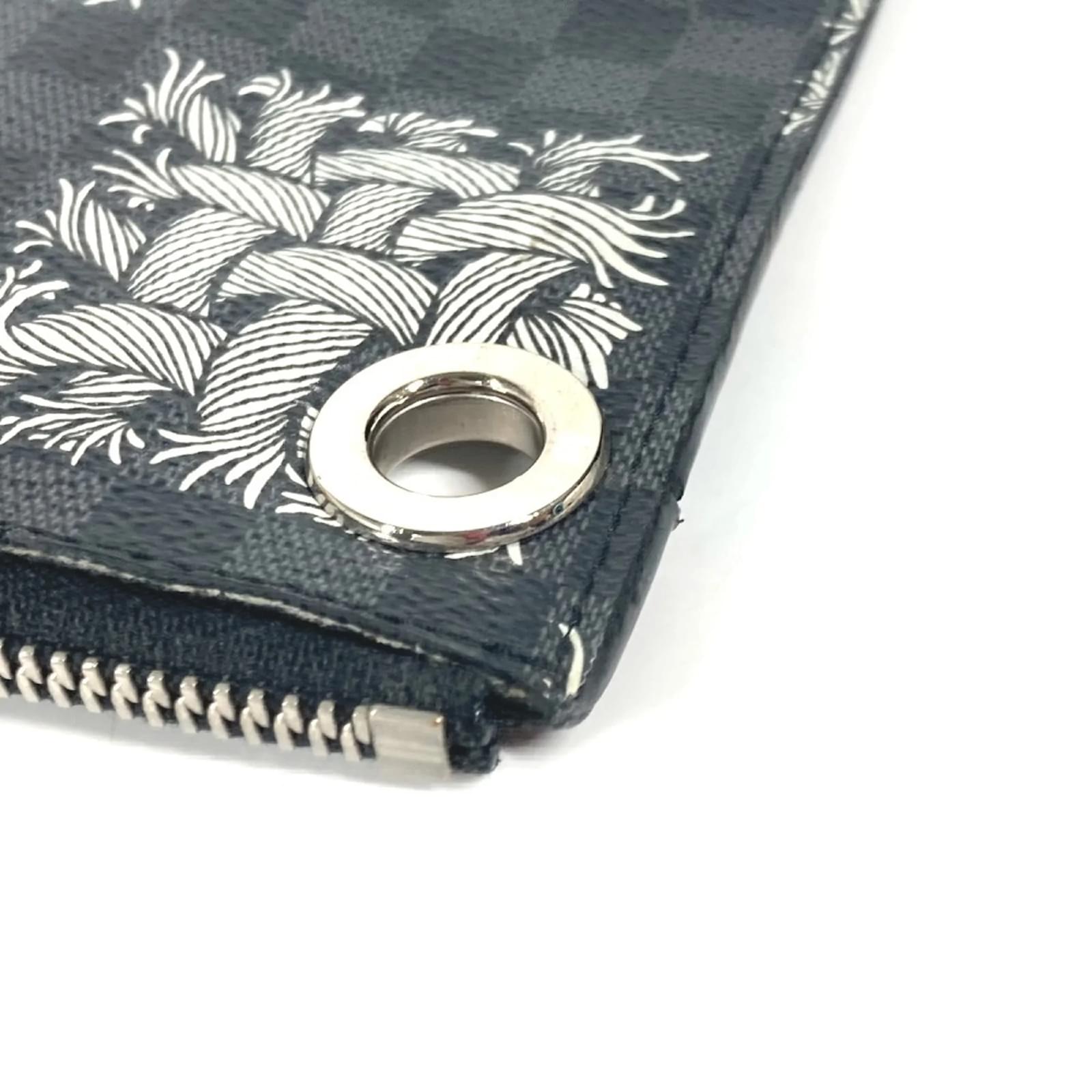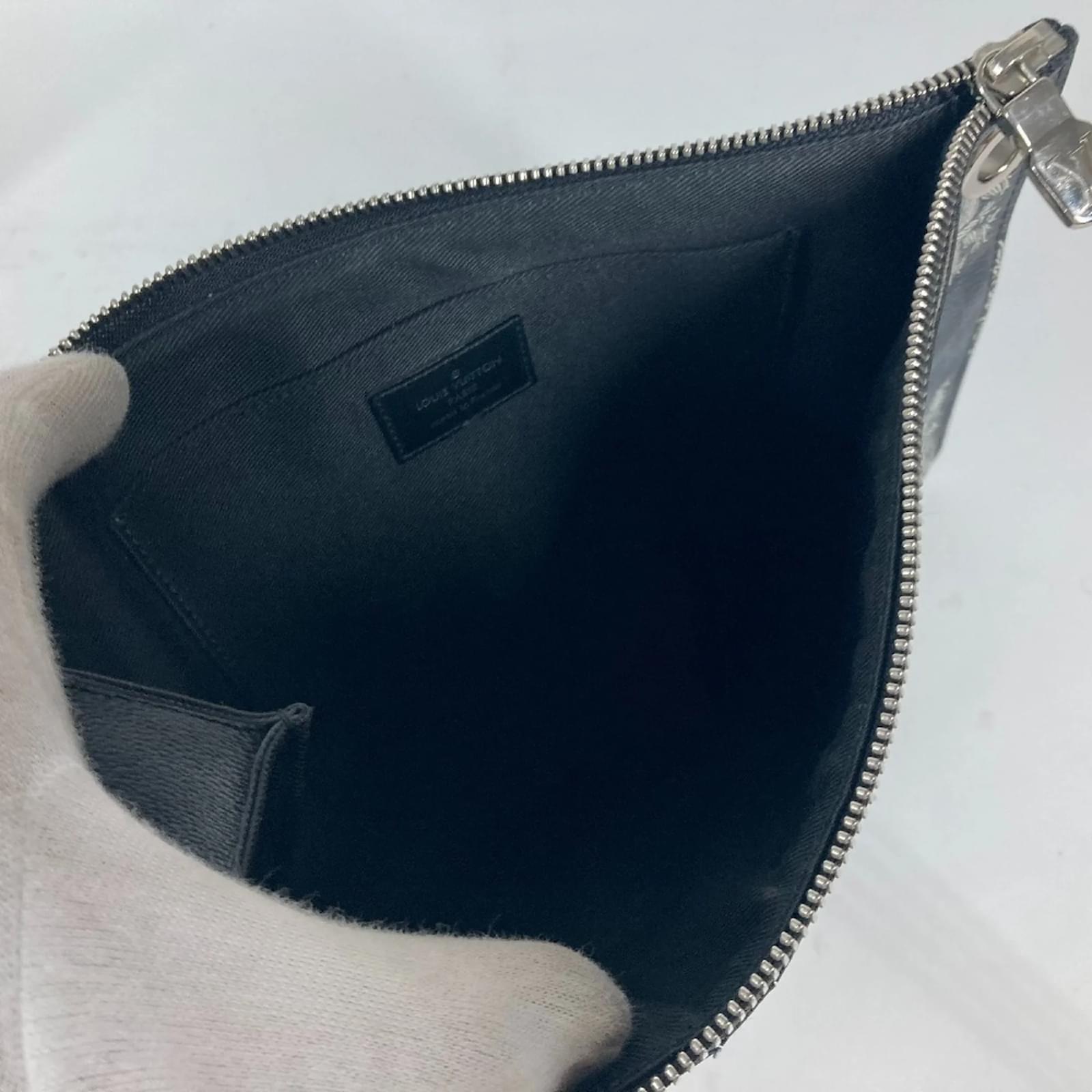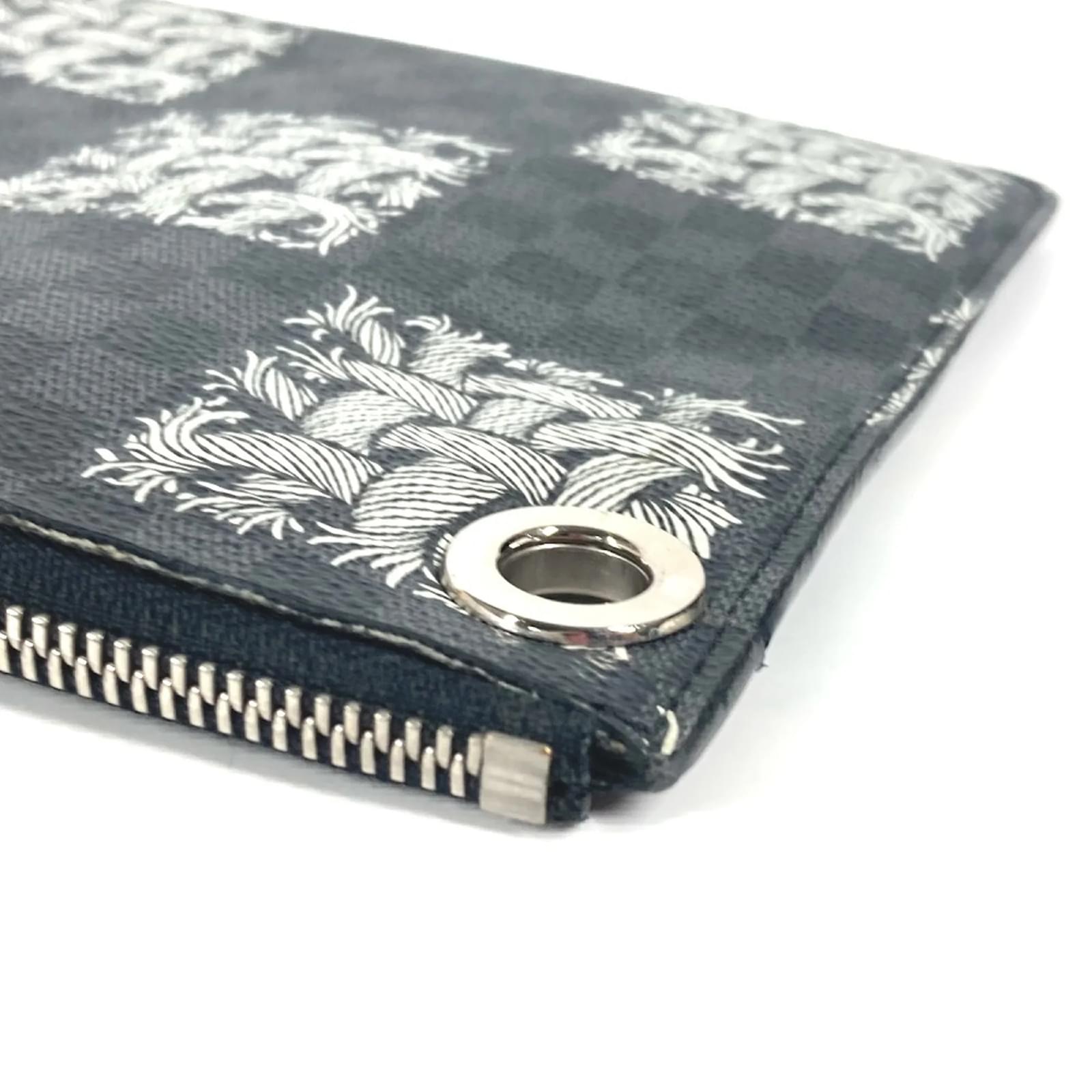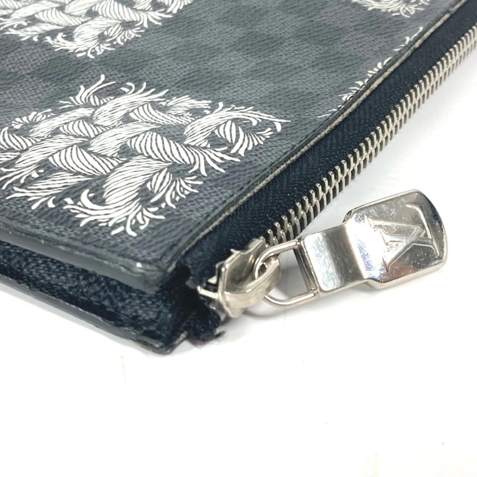 This Louis Vuitton Pochette Jour PM is crafted from Damier Graphite canvas in a classic black color. Measuring 17.5cm x 27.5cm (6.88'' x 10.82''), it serves as a versatile clutch bag, pouch, or pochette. The item is in very good used condition, classified as Rank A, with only slight traces of use, including minor scratches and dirt. There are slight peelings on the edges, but overall, it remains in good shape. The purchase includes a box, and potential buyers are encouraged to review the images for a detailed view of the item's condition and included accessories.