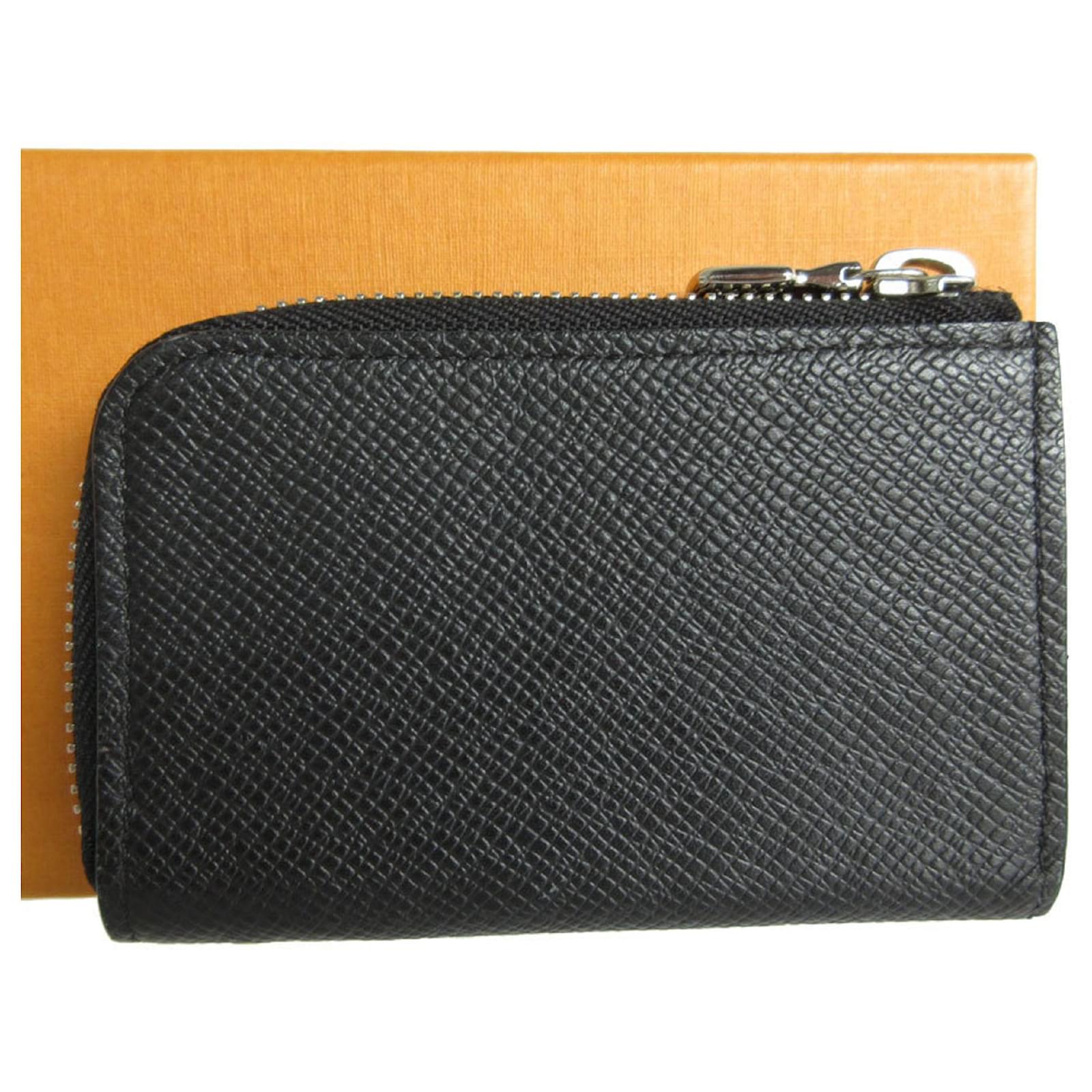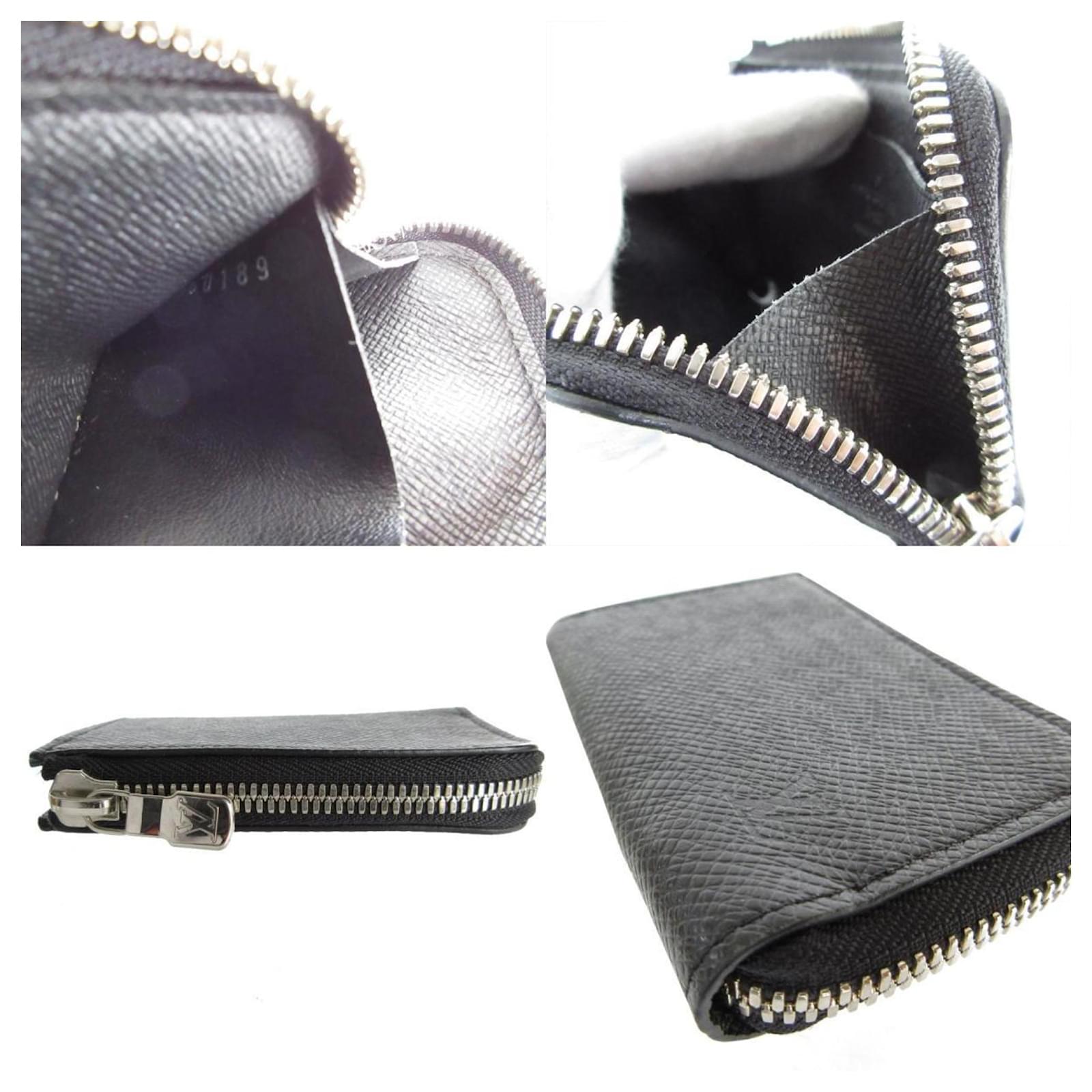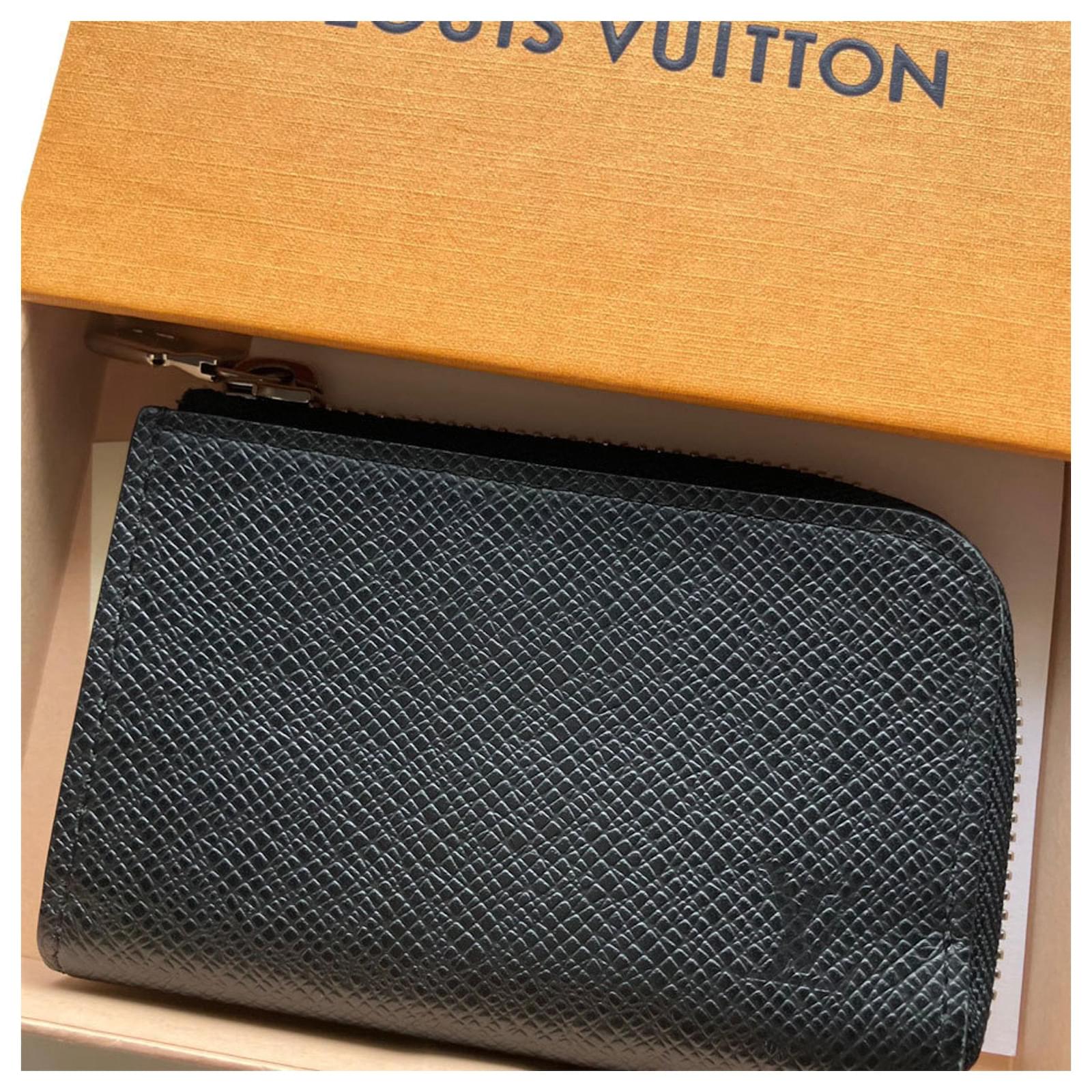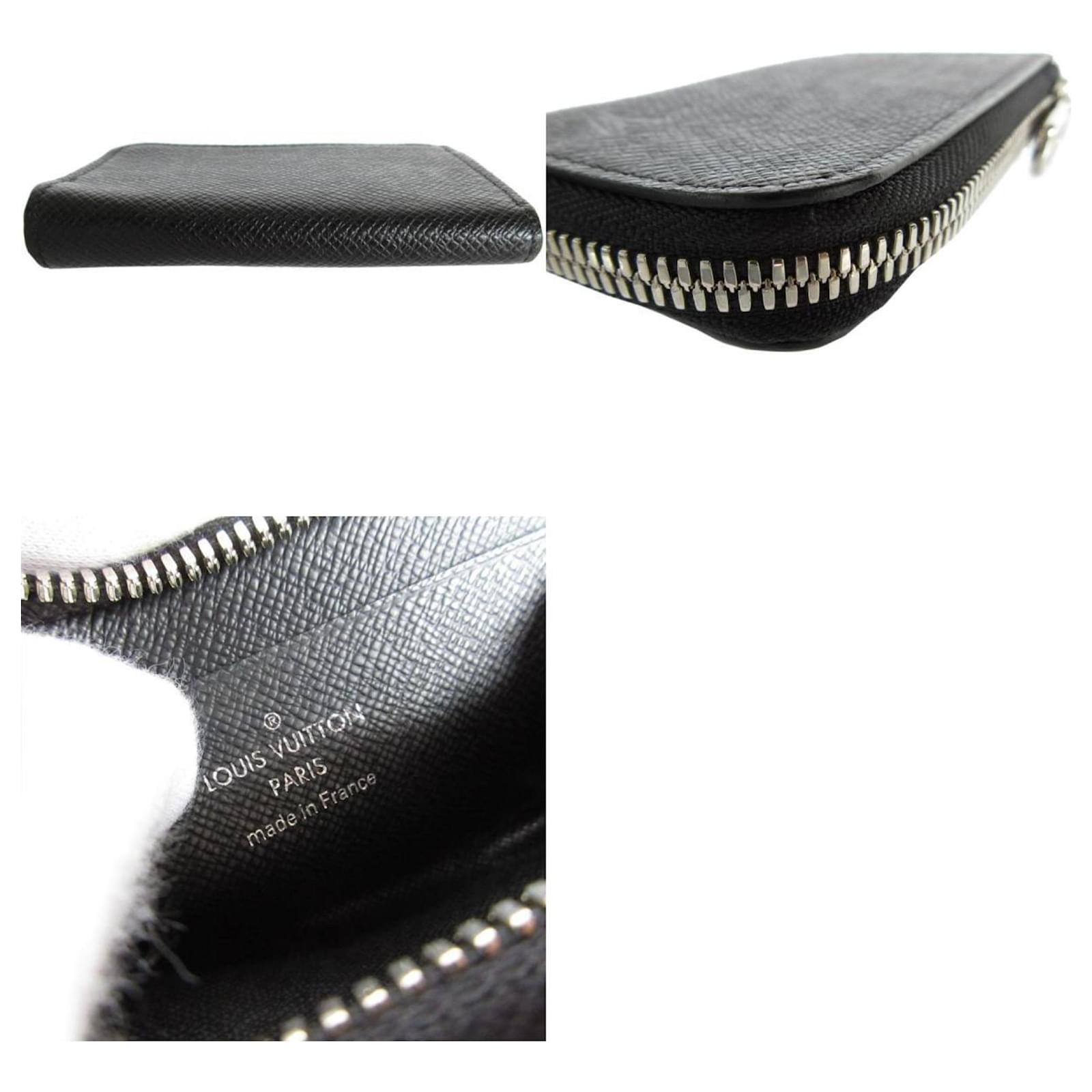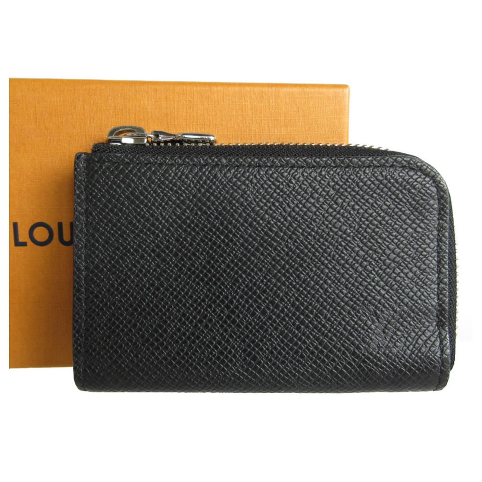 This Louis Vuitton coin purse, model M63375, is crafted from Taiga leather in a classic black color. It features a zipper closure and includes a card slot for added convenience. The dimensions of the purse are 7cm x 10.5cm x 1.2cm, making it a compact accessory suitable for everyday use.