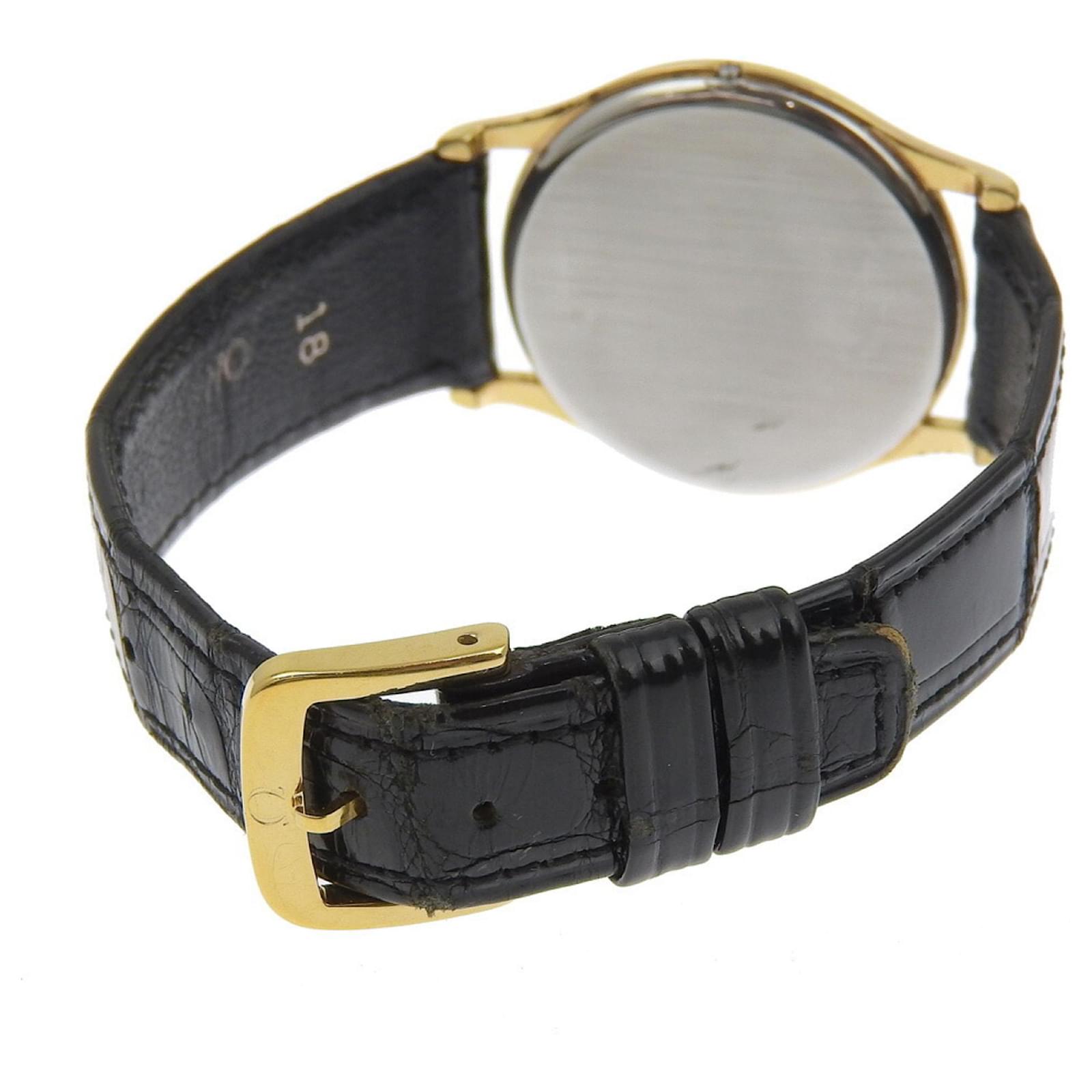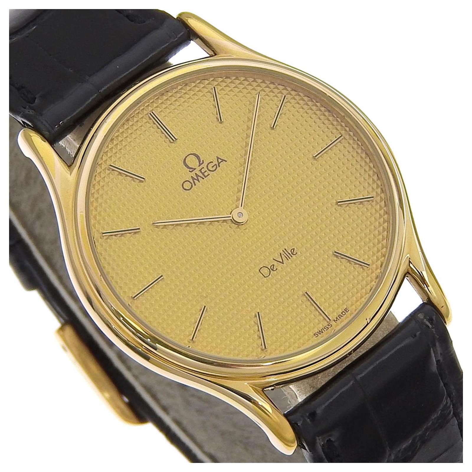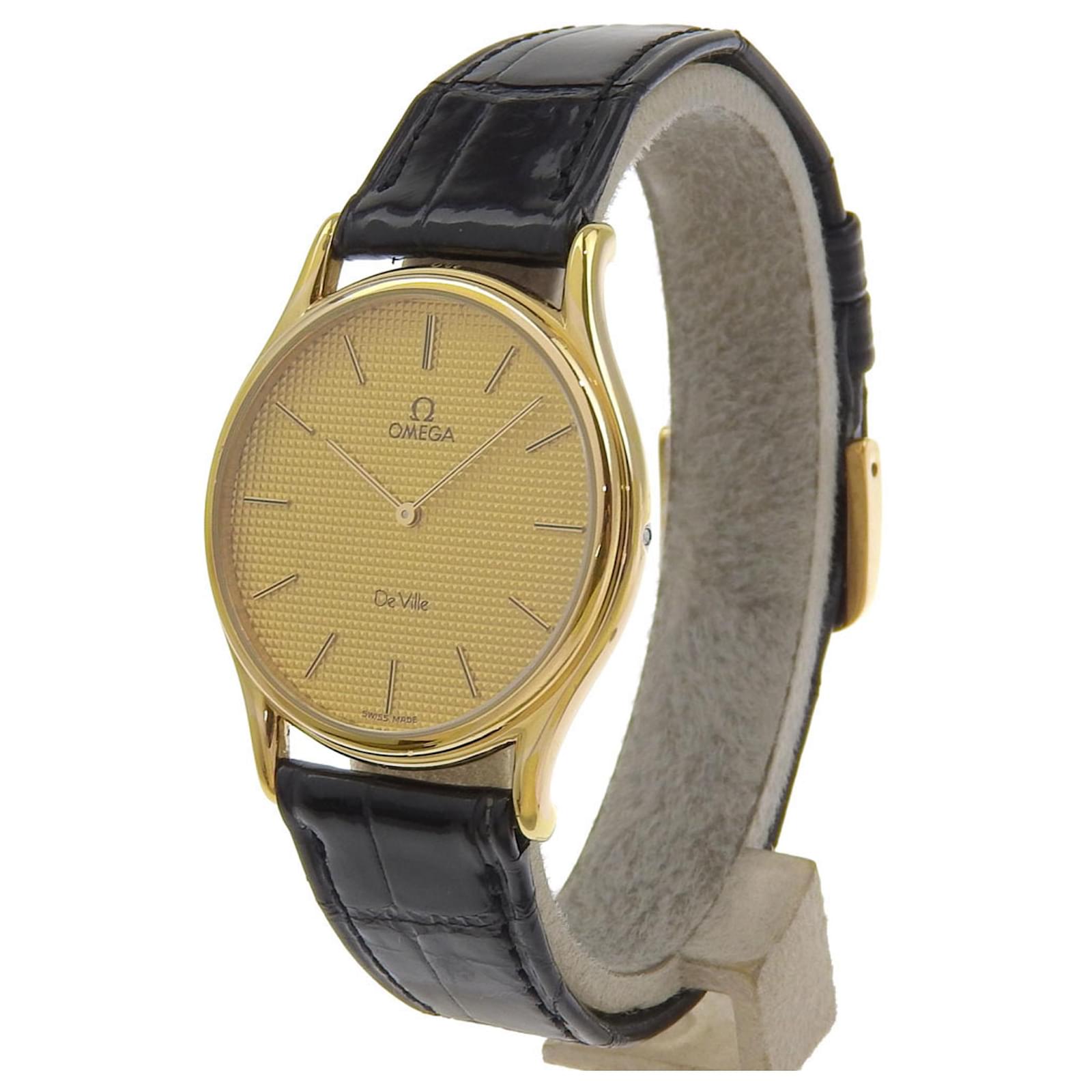 The OMEGA De Ville watch features a gold-plated case and an embossed leather band, designed for men. It is powered by a reliable quartz movement and showcases a gold dial. The watch has a case diameter of 33mm, suitable for wrist sizes ranging from 16cm to 19.5cm.