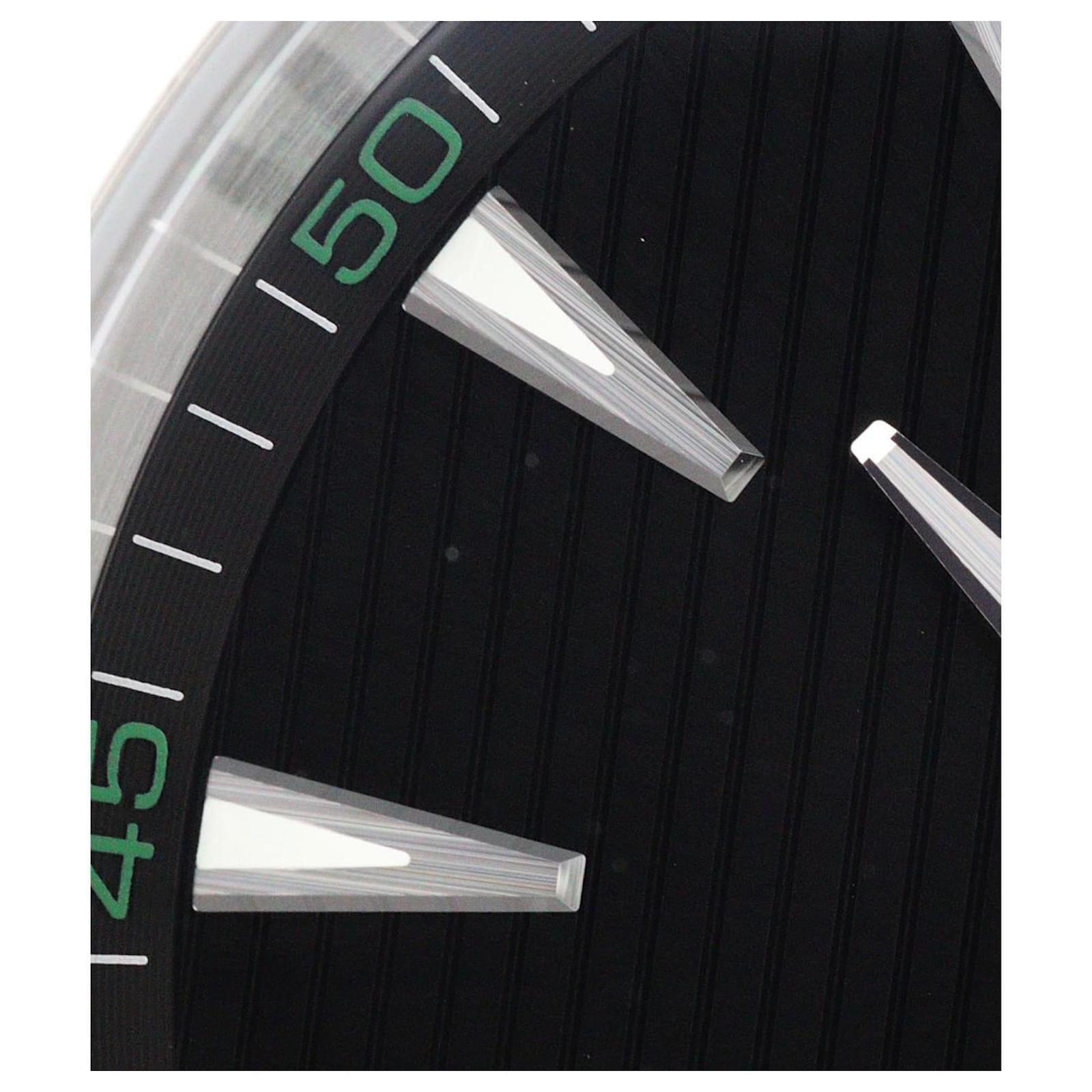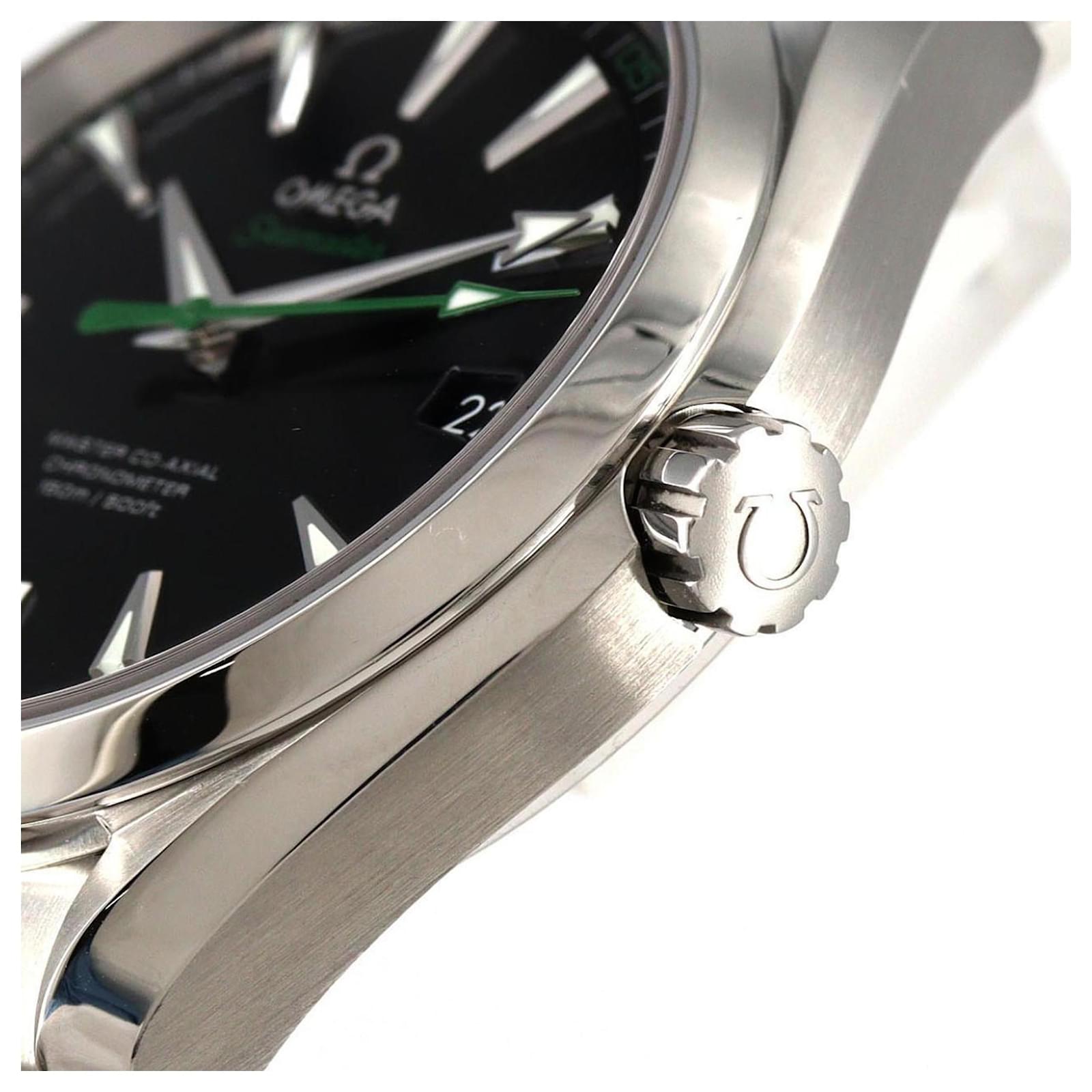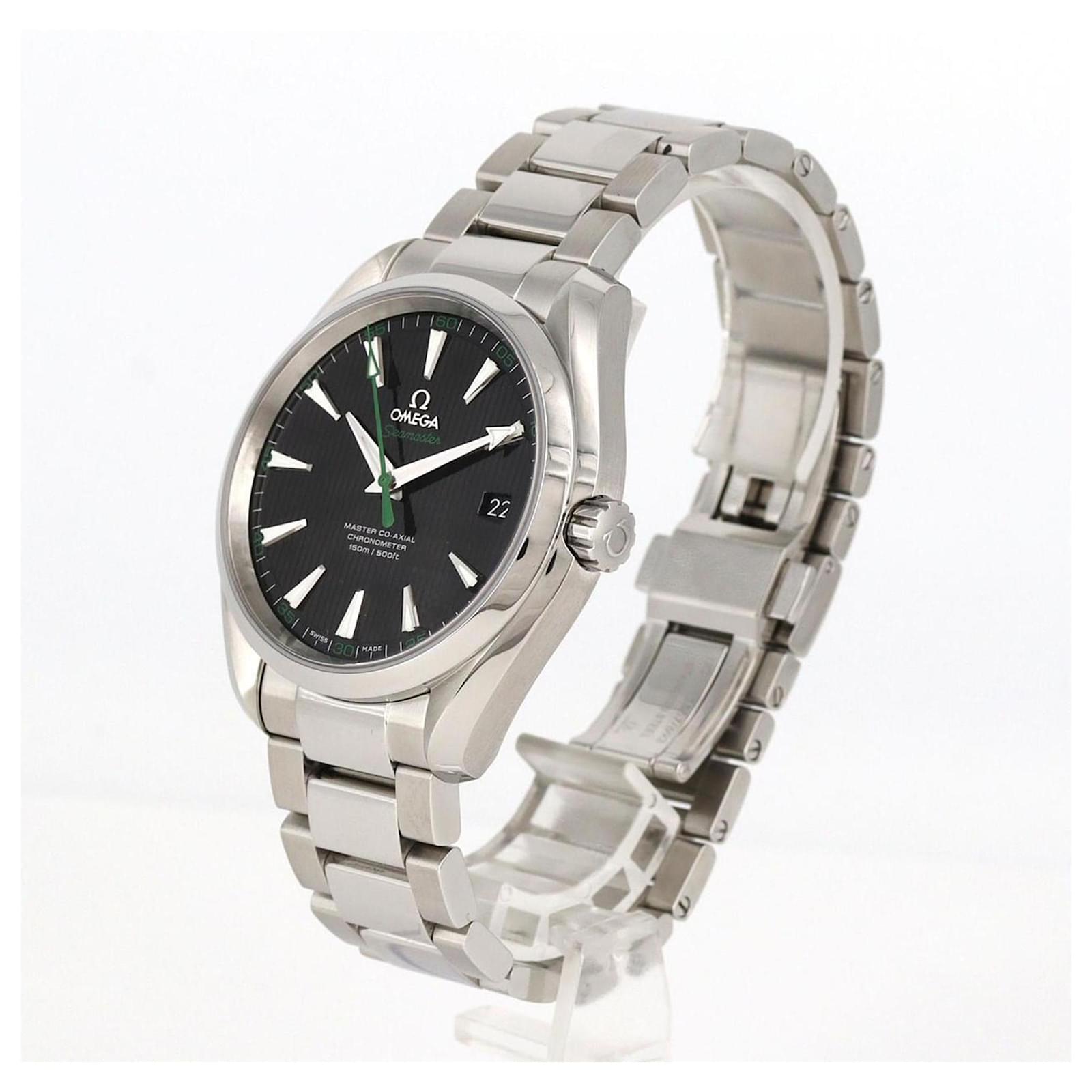 The Omega Seamaster Aqua Terra Golf 231.10.42.21.01.004 is a stainless steel wristwatch characterized by its black dial. It features a robust self-winding automatic movement and has a case diameter of 42mm, suitable for a wrist size of 20cm (7.87 inches). This watch is designed to be water-resistant and comes in a used but very good condition, with some minor traces of usage visible through scratches and dirt, listed as Rank A. It has been polished for maintenance and has insignificant scratches on the glass. Accompanying the watch are the inner box, outer box, and warranty, which should be confirmed through available images prior to purchase.