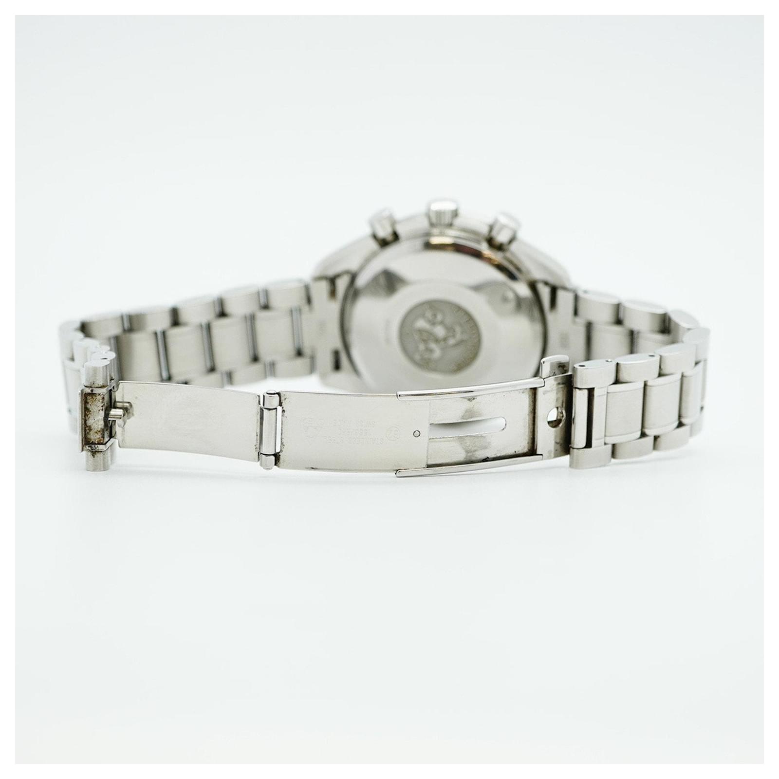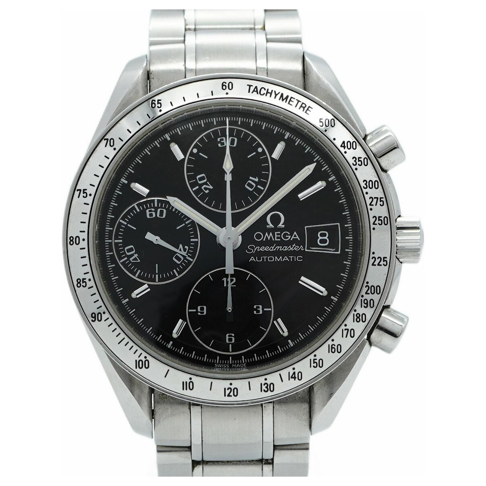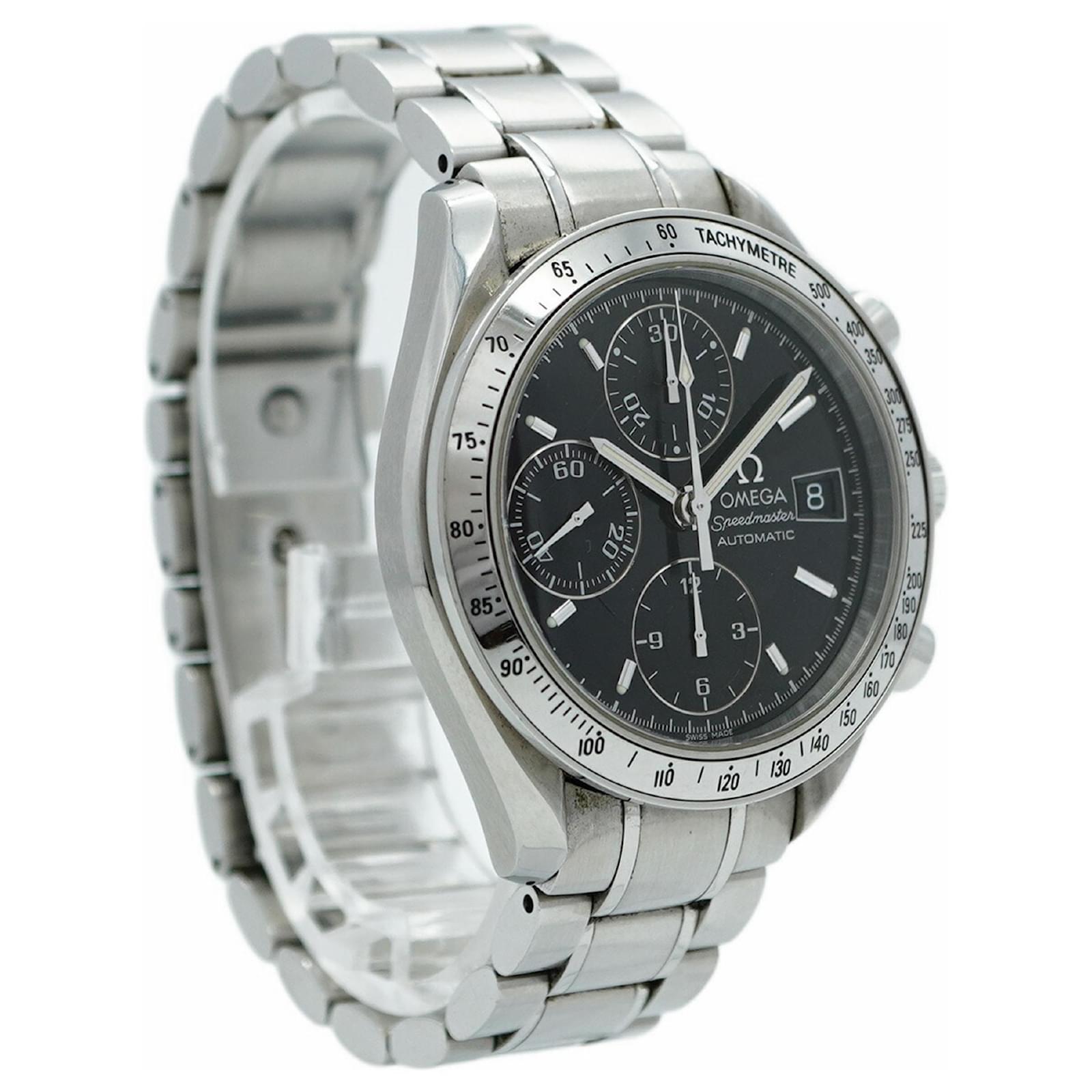 The Omega Speedmaster 3513.50 is a stylish wristwatch featuring a black dial and a stainless steel band, designed for men. This self-winding automatic timepiece has a 39mm case diameter and fits a wrist size of 15.5cm (6.1 inches). The watch is classified as used but is in good condition, with slight traces of wear, including minor scratches on the bezel, case back, dial, glass, crown, and bracelet. While no accessories are included, the watch maintains a ranking of AB, indicating it has visible signs of usage but overall presents well. Buyers are encouraged to review the images for a detailed view of the item's exact condition.