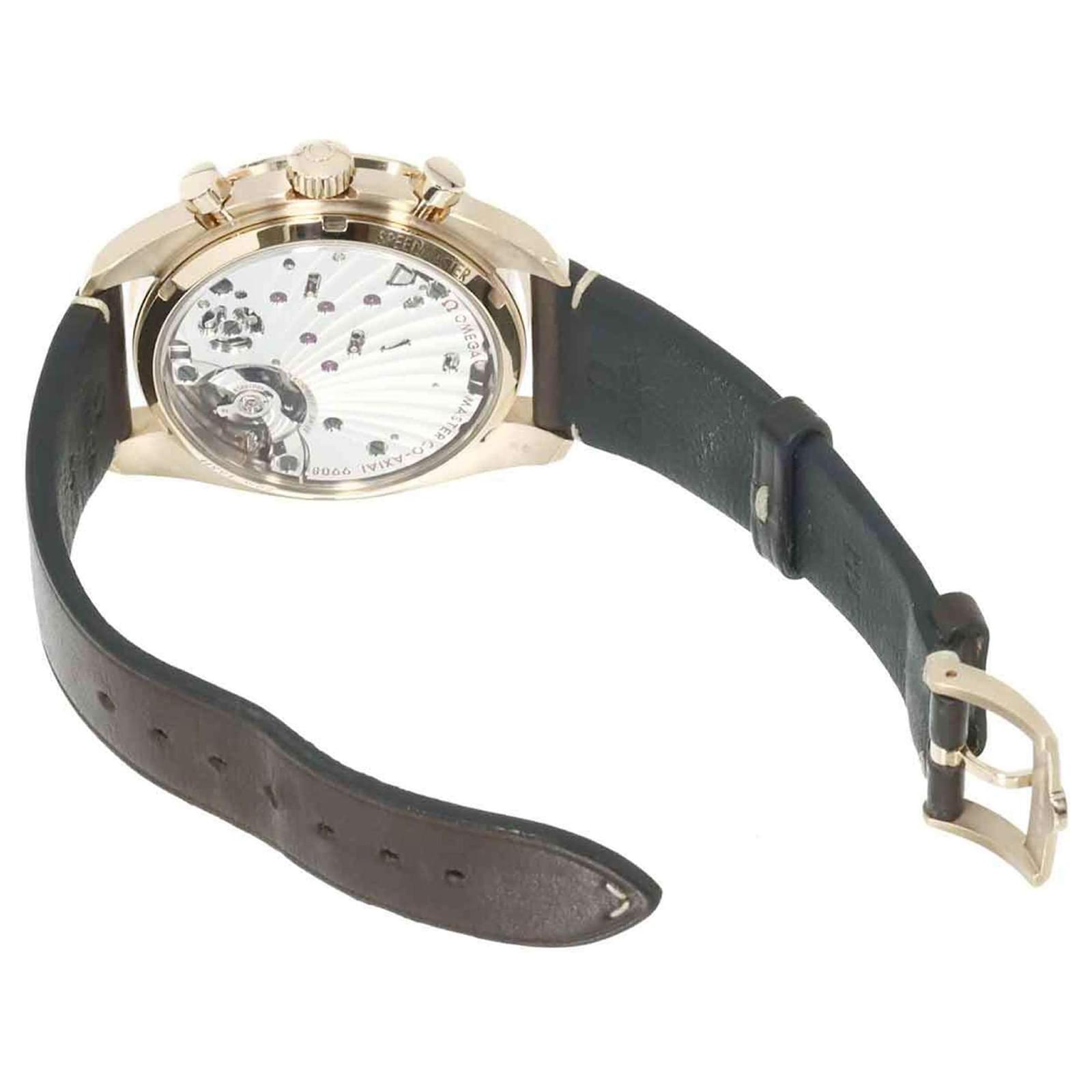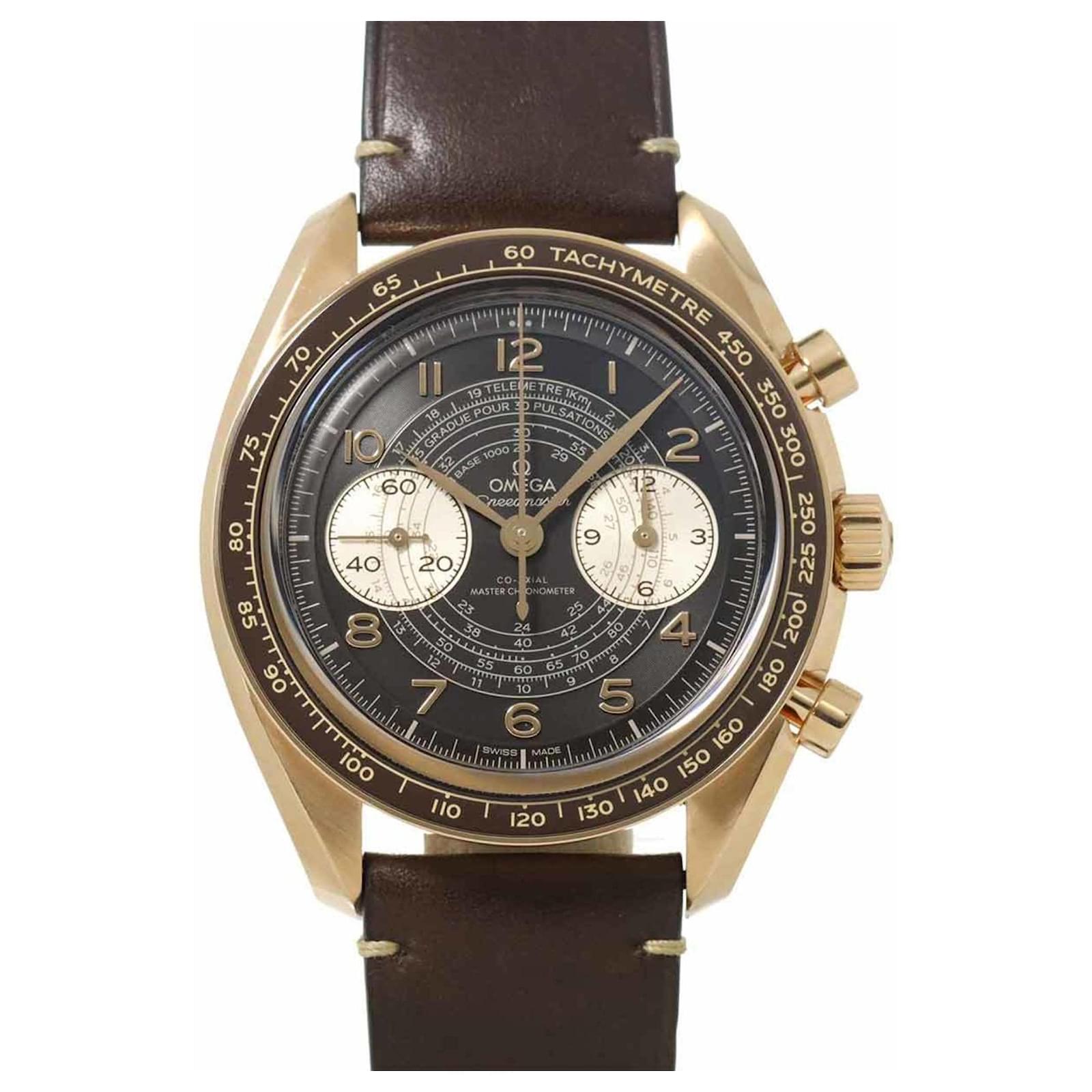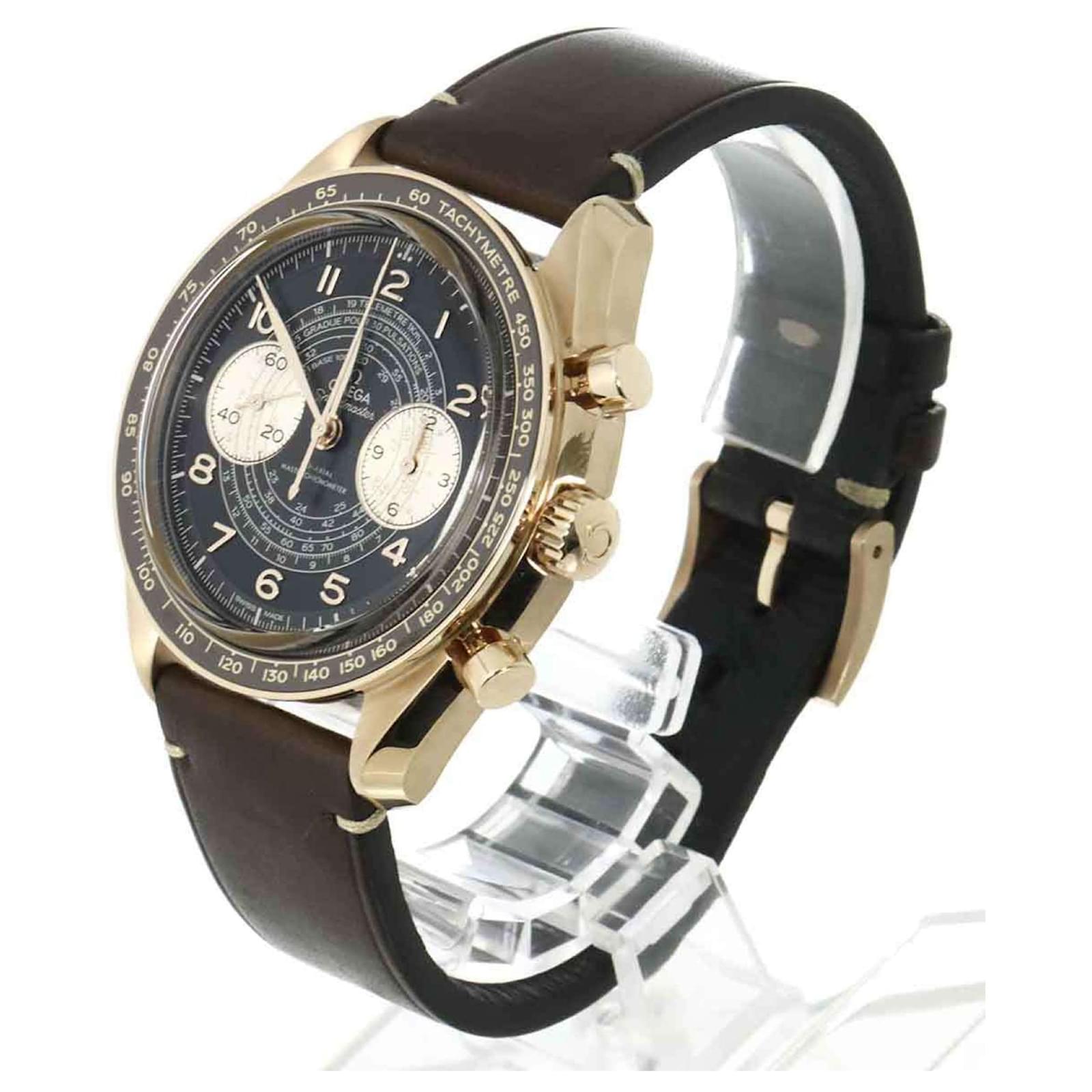 This Omega Speedmaster Chronoscope is a manual-winding mechanical wristwatch designed for men. The watch features a brown dial housed in a bronze case with a diameter of 43mm, suitable for wrist sizes between 15cm and 19.5cm. The band combines bronze and leather for a classic look.
