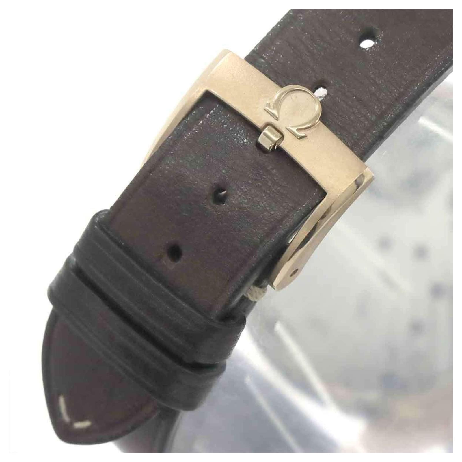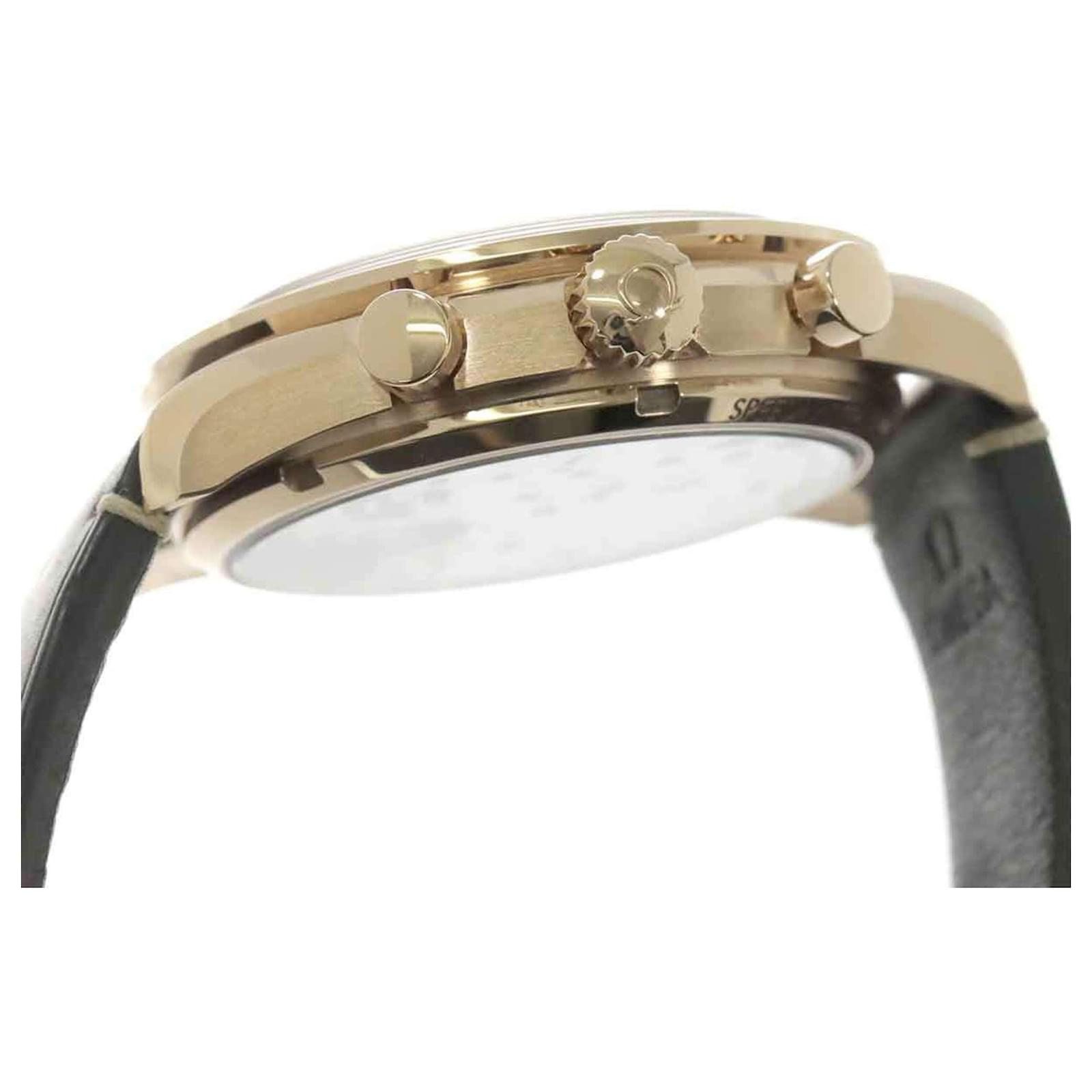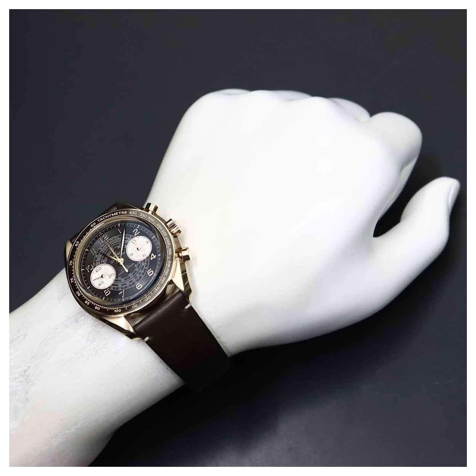 This Omega Speedmaster Chronoscope is a manual-winding mechanical wristwatch designed for men. The watch features a brown dial housed in a bronze case with a diameter of 43mm, suitable for wrist sizes between 15cm and 19.5cm. The band combines bronze and leather for a classic look.