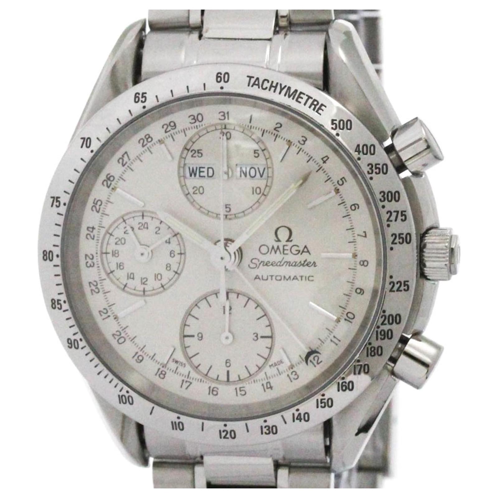 The OMEGA Speedmaster Triple Date Steel Automatic Watch, model code 3521.30, features a silver dial and a sporty design suitable for various occasions. It is constructed with a stainless steel case and band, providing durability and a polished finish. The watch has a case diameter of 39mm and is powered by a self-winding automatic movement.
