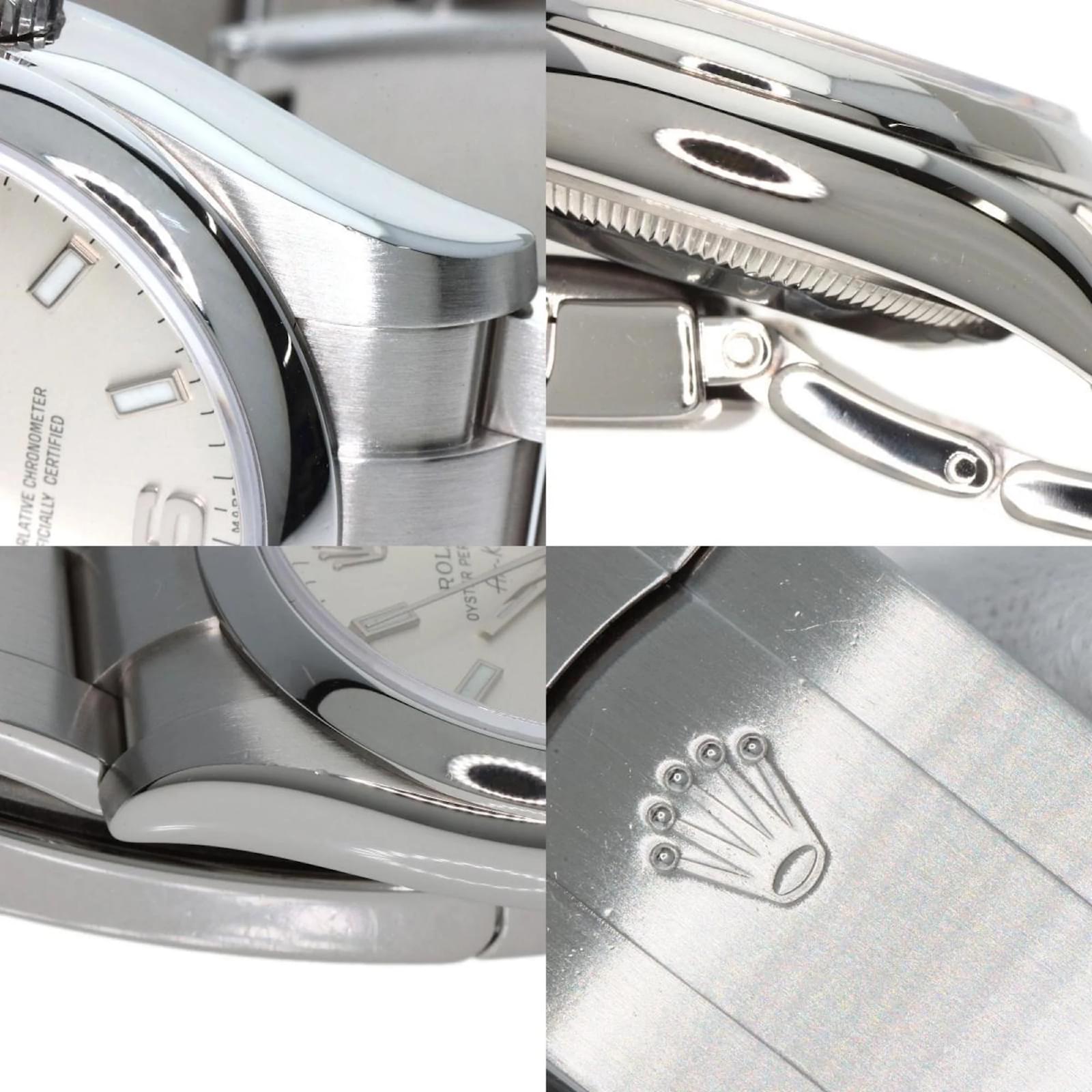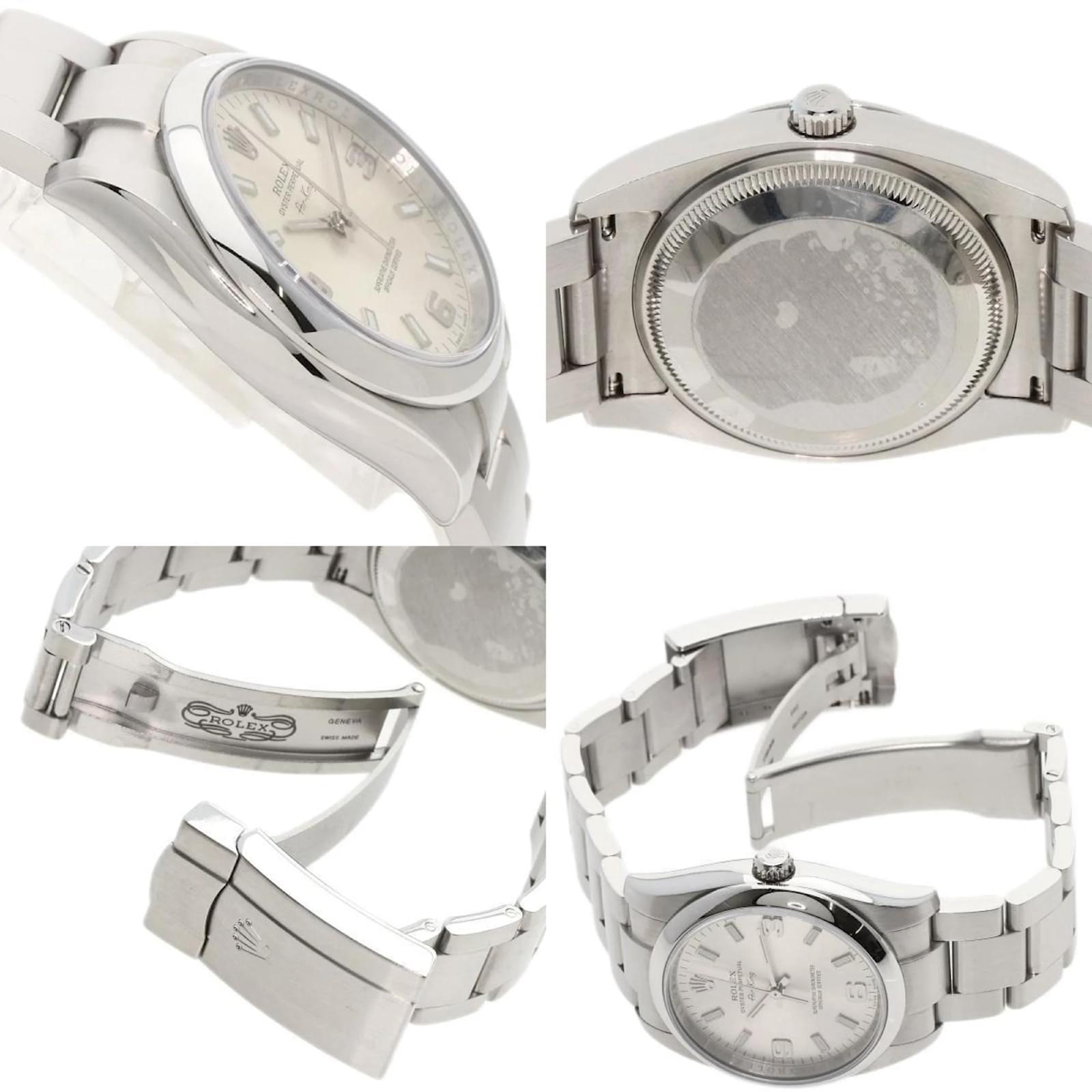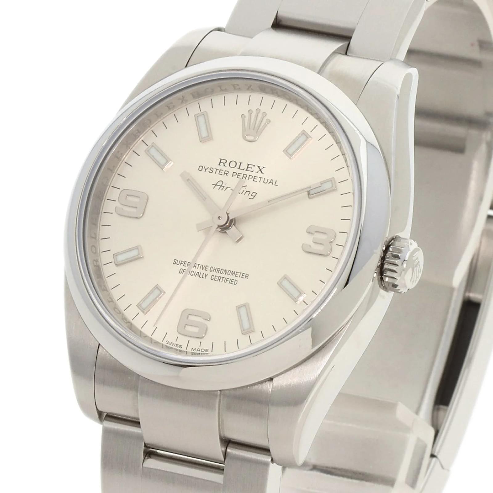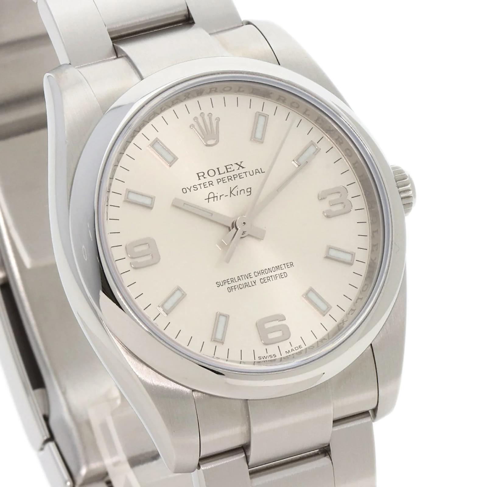 The Rolex 114200 Air King is a stainless steel wristwatch designed for men, featuring a silver dial and a self-winding automatic movement. The case and band are both crafted from durable stainless steel, ensuring longevity and style. This watch accommodates a wrist size of 17cm (6.69 inches).