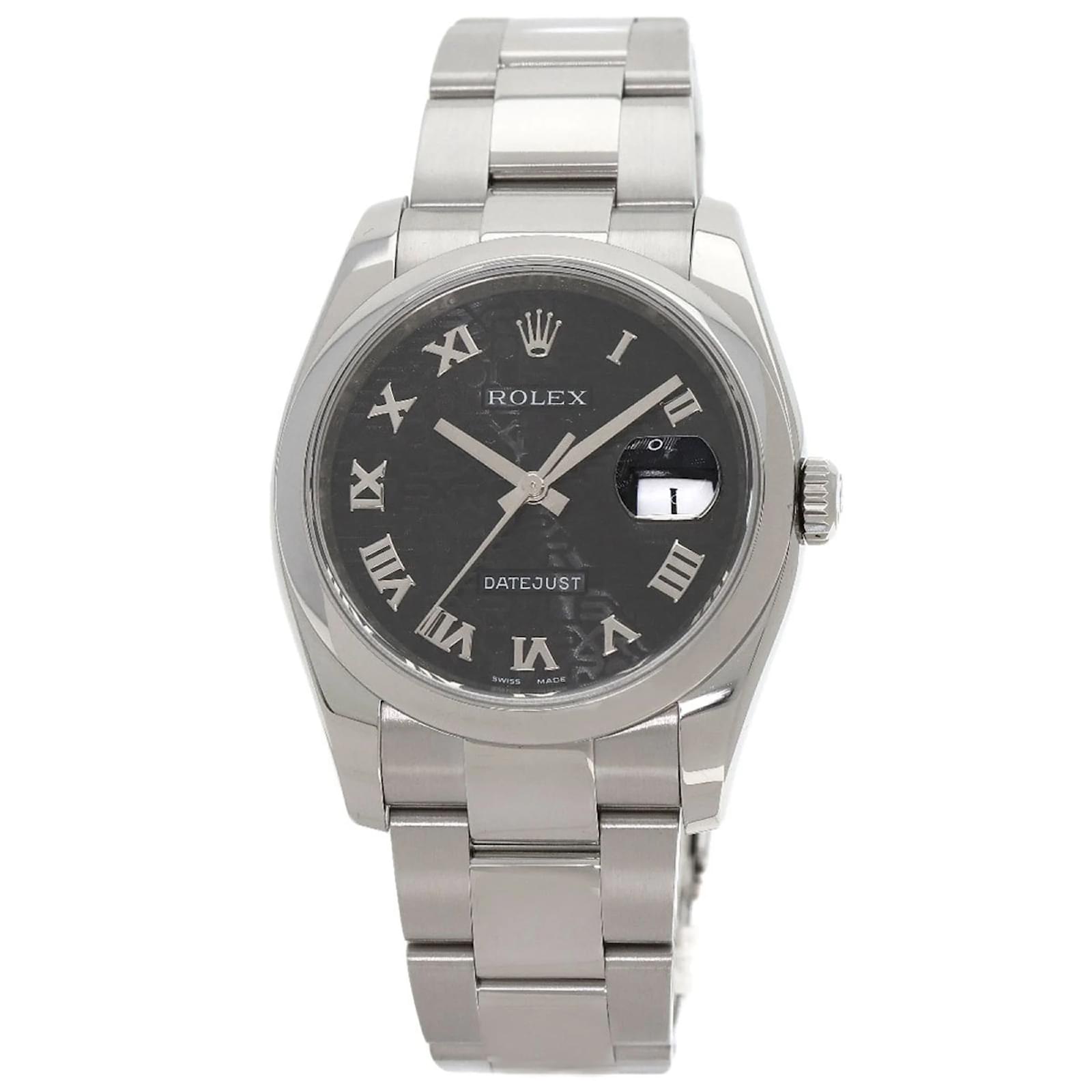 The Rolex 116200 Datejust Roman Horicon Watch is a sophisticated wristwatch designed for men, featuring a classic black dial and an analog display. The case is made of durable stainless steel, complemented by a stainless steel band, ensuring both style and longevity.