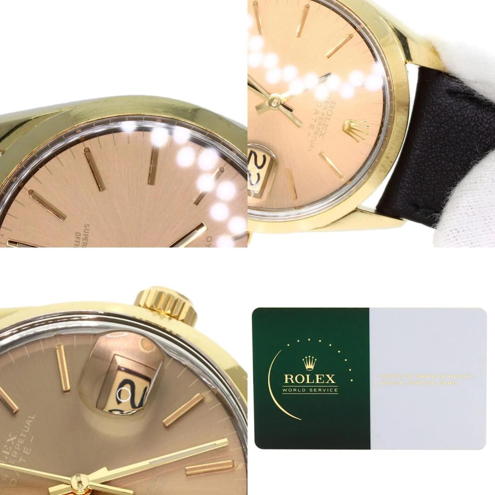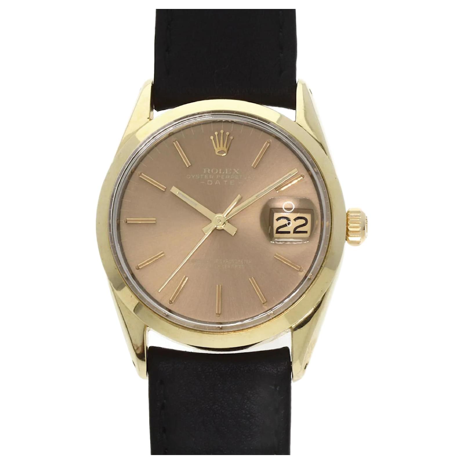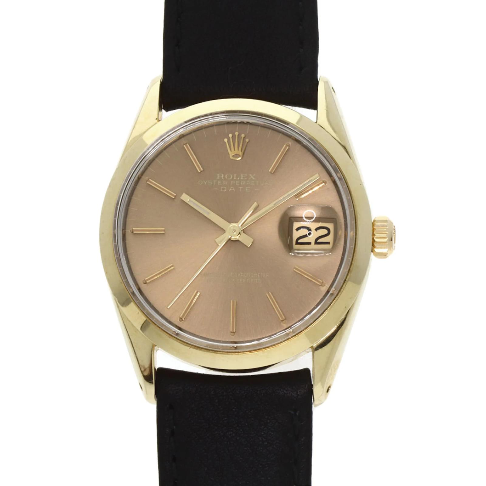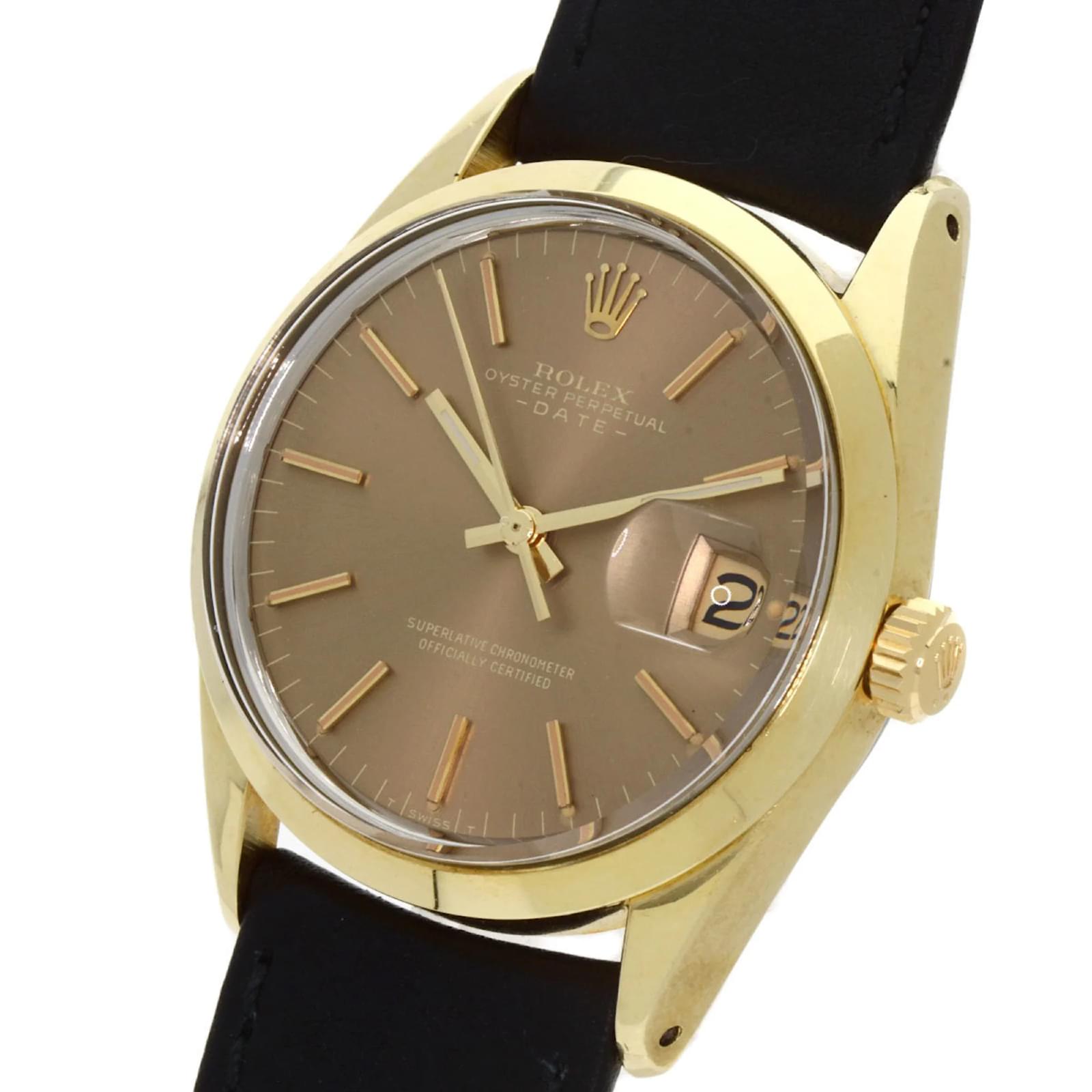 The Rolex 1550 Oyster Perpetual is a men's wristwatch from 1970, featuring a gold-plated case and a leather band. This self-winding automatic watch has a case diameter of 33mm, suitable for wrist sizes ranging from 14.5cm to 18cm. The watch is classified as used but remains in very good condition, with moderate scratches on the bezel, case, and bracelet, while the glass shows slight scratches. The dial is free from any scratches or deterioration. It is important to review the provided images for a detailed view of the watch's condition and included accessories.