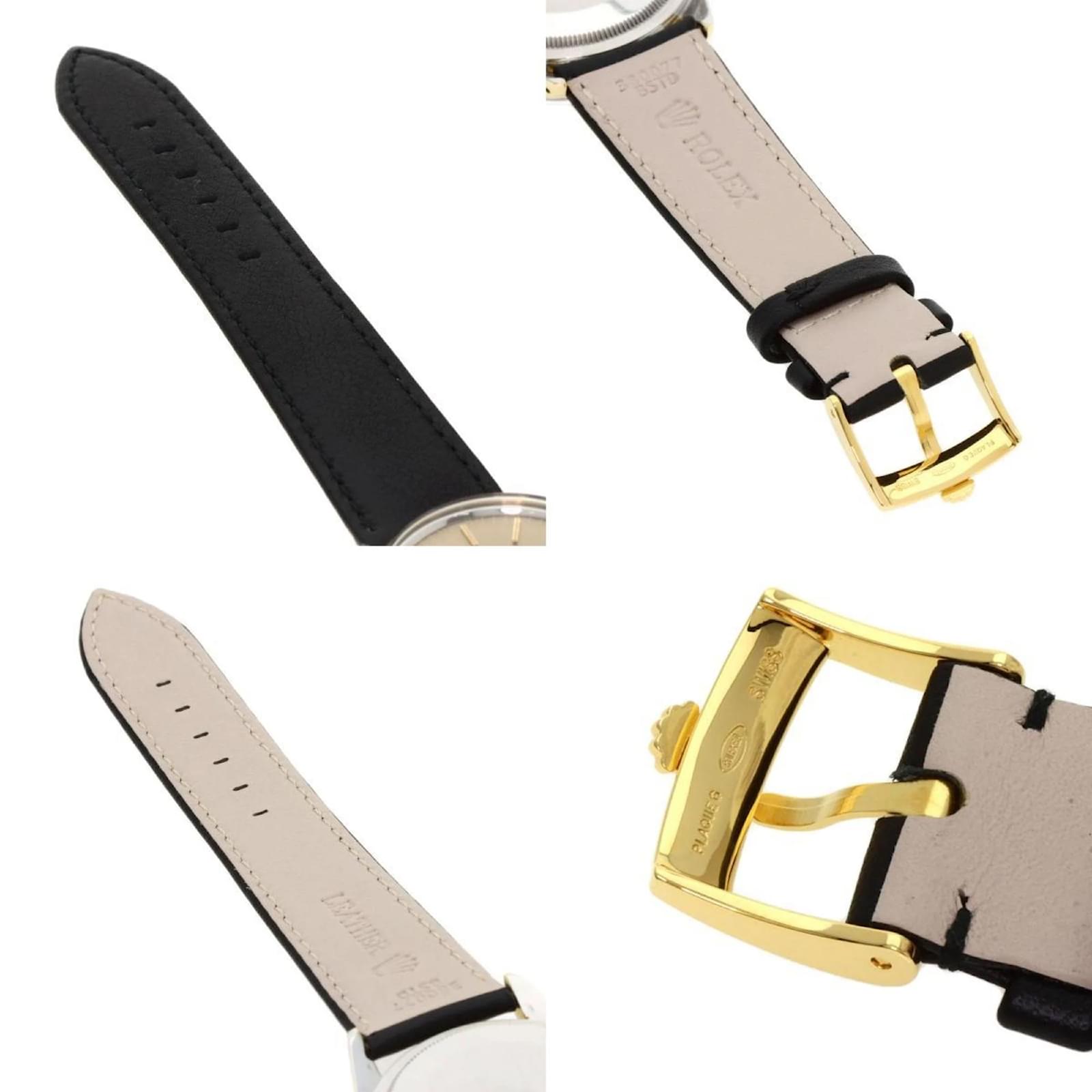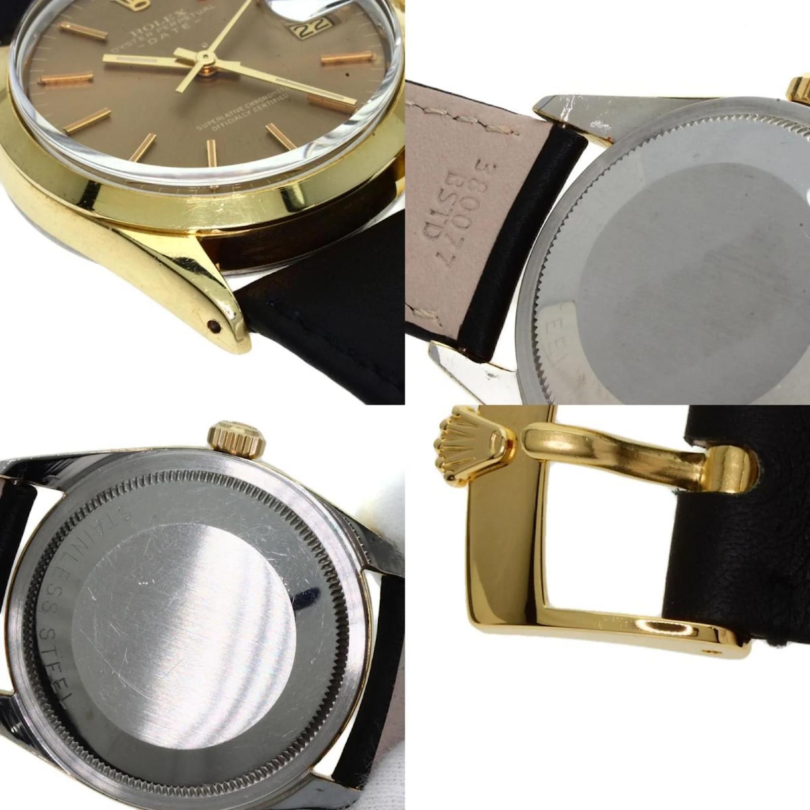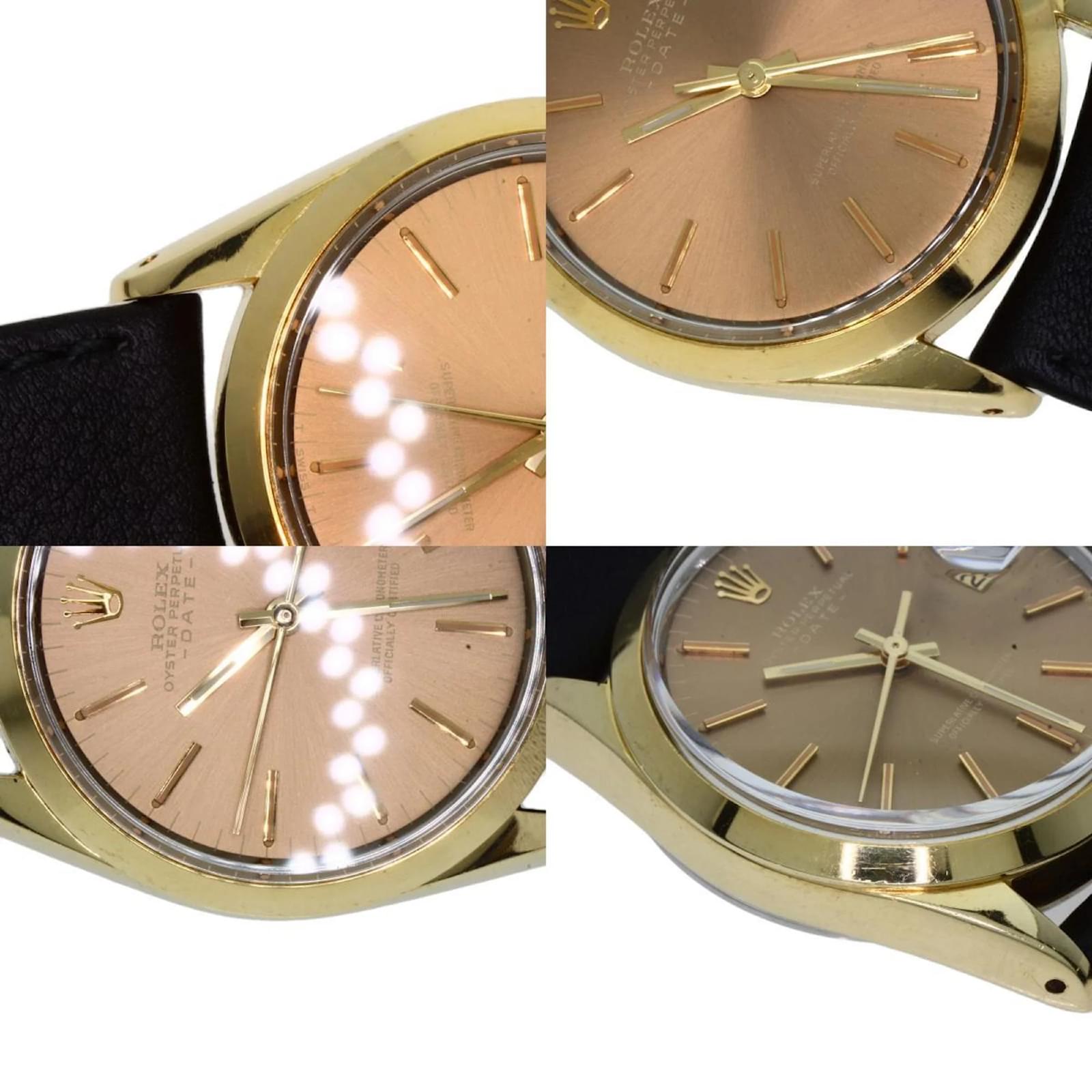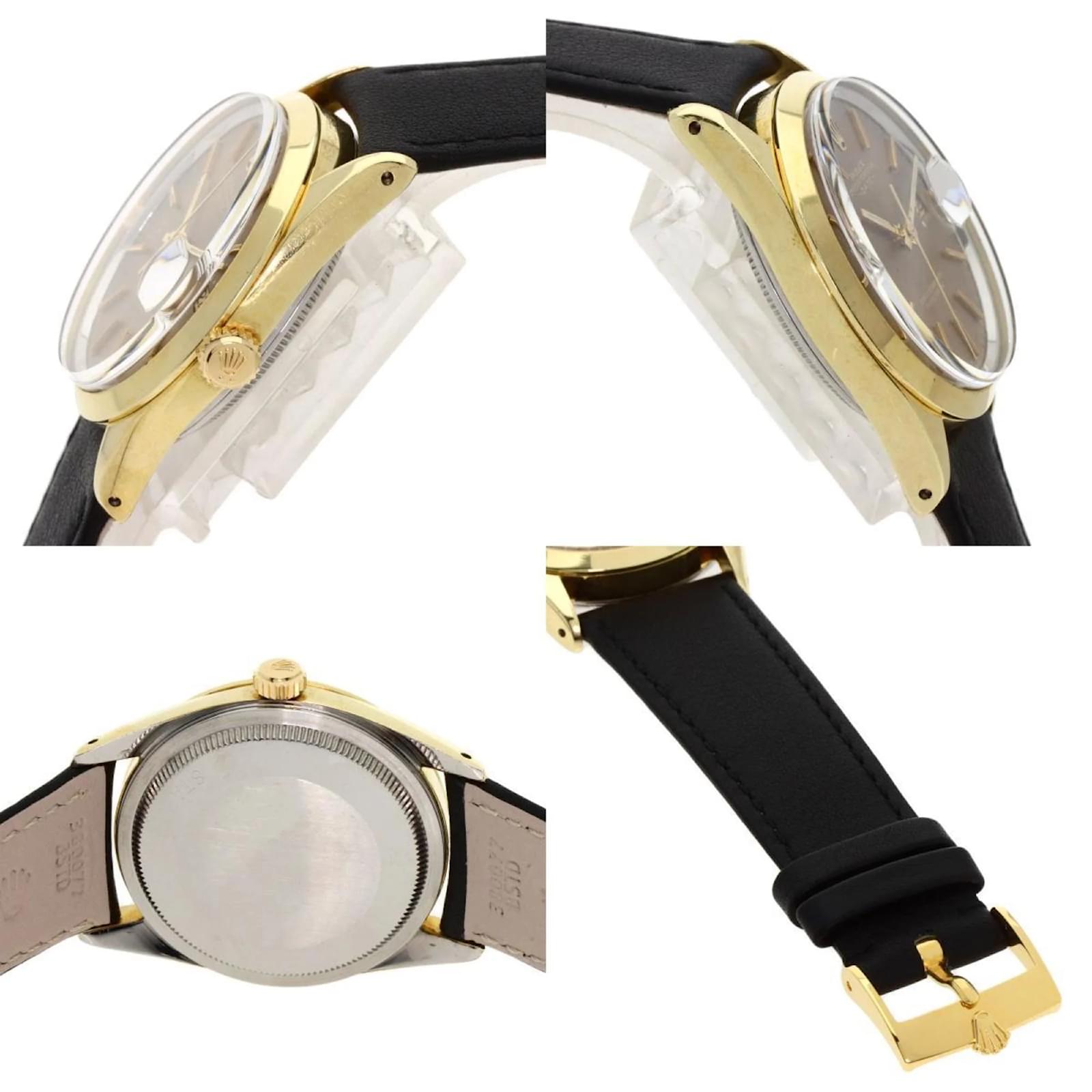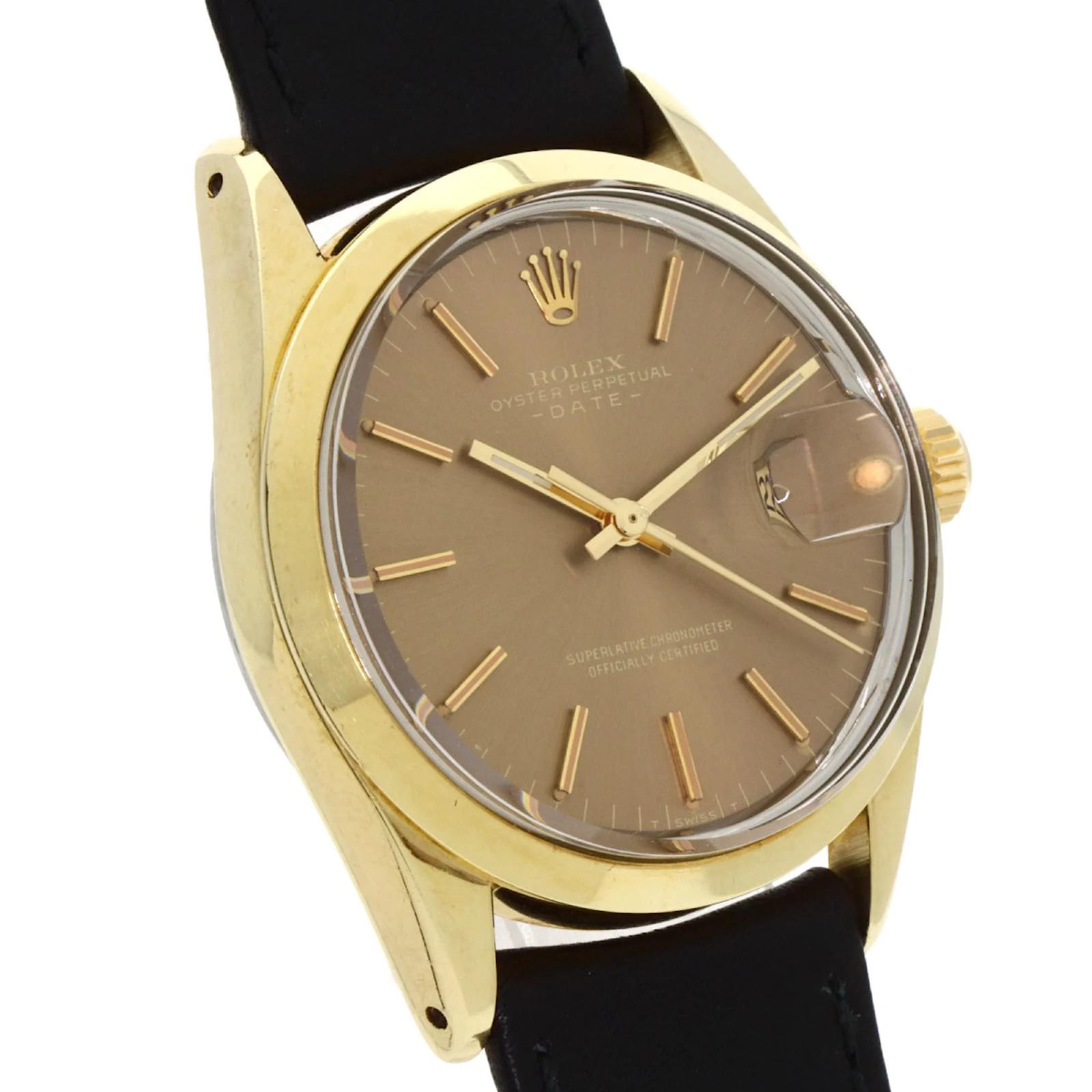 The Rolex 1550 Oyster Perpetual is a men's wristwatch from 1970, featuring a gold-plated case and a leather band. This self-winding automatic watch has a case diameter of 33mm, suitable for wrist sizes ranging from 14.5cm to 18cm. The watch is classified as used but remains in very good condition, with moderate scratches on the bezel, case, and bracelet, while the glass shows slight scratches. The dial is free from any scratches or deterioration. It is important to review the provided images for a detailed view of the watch's condition and included accessories.