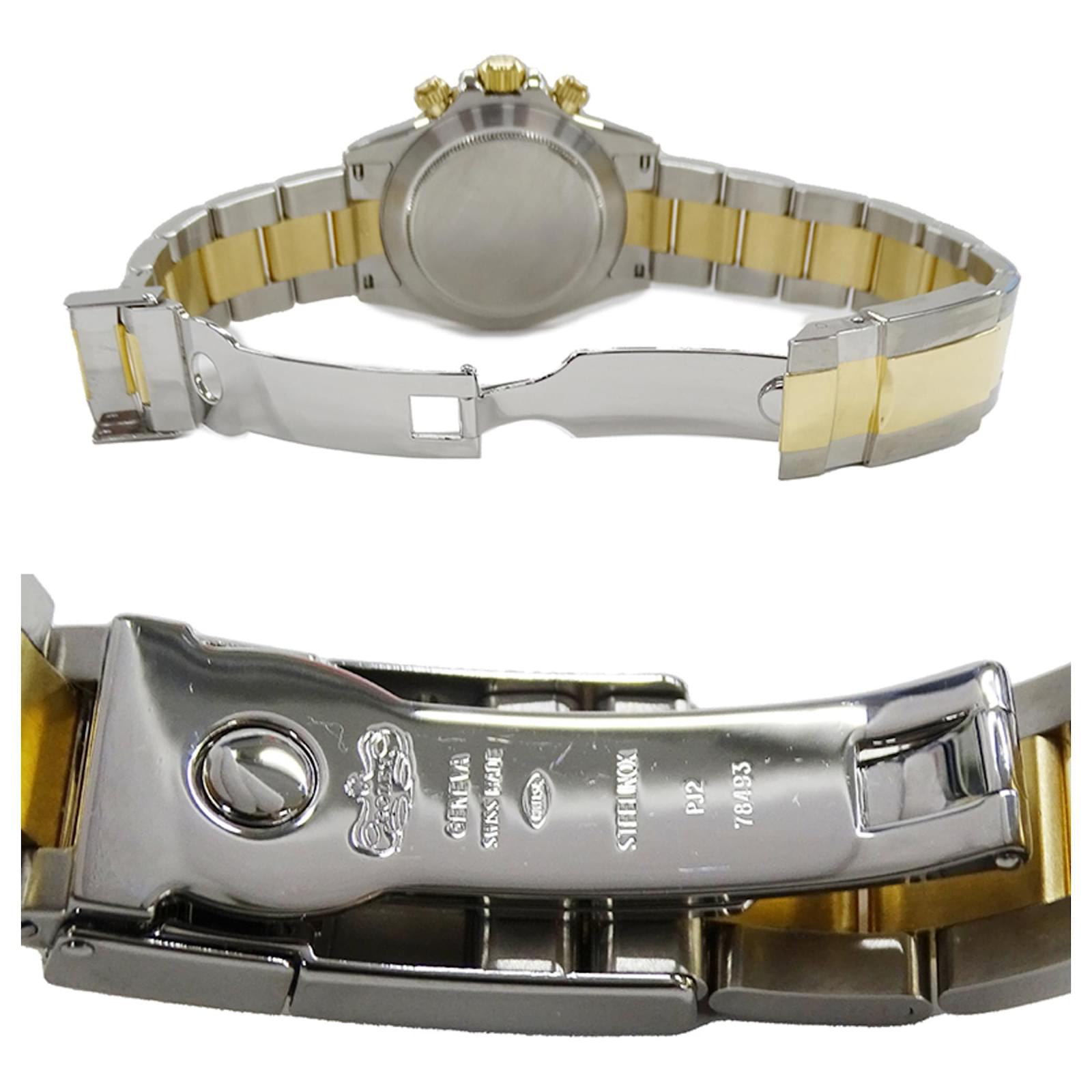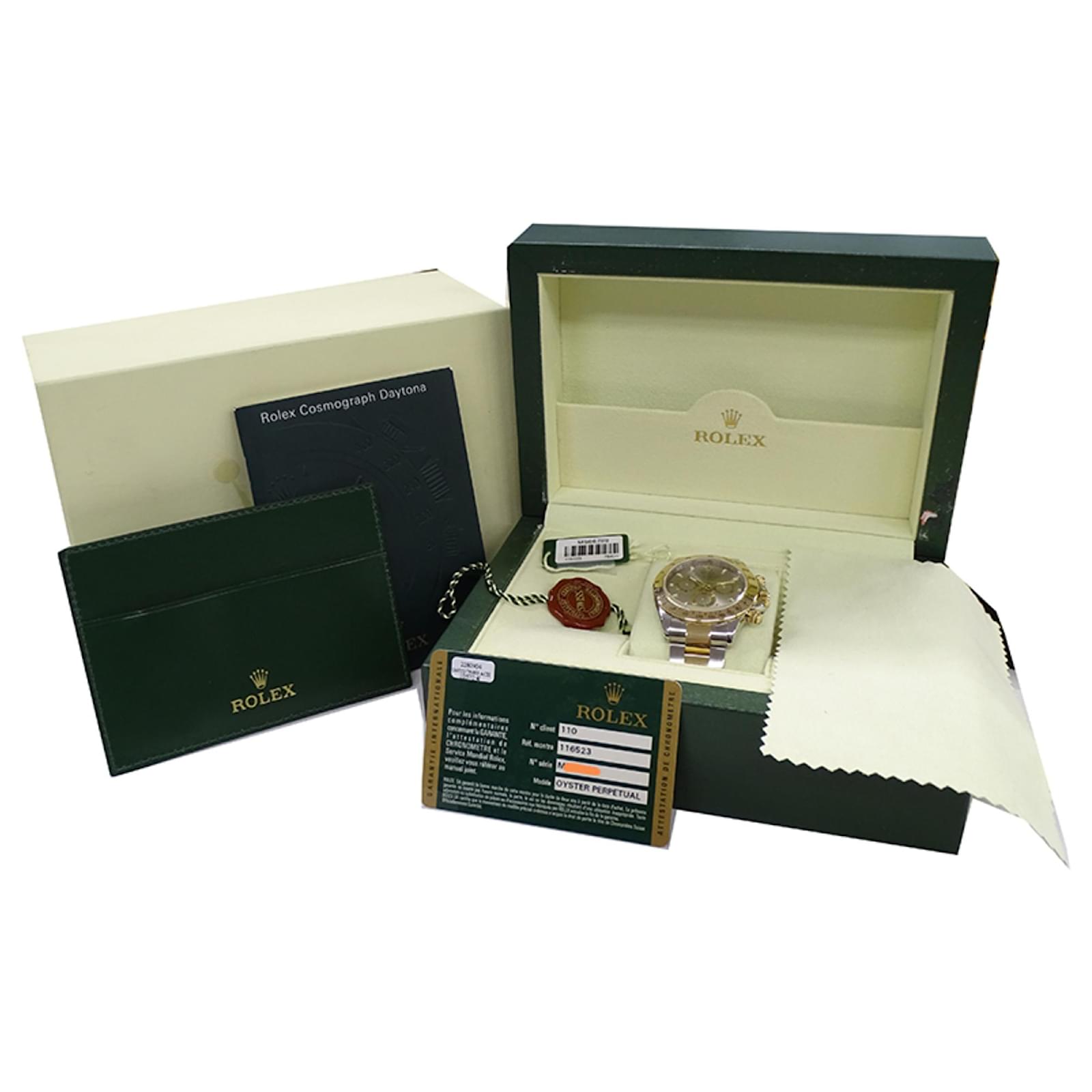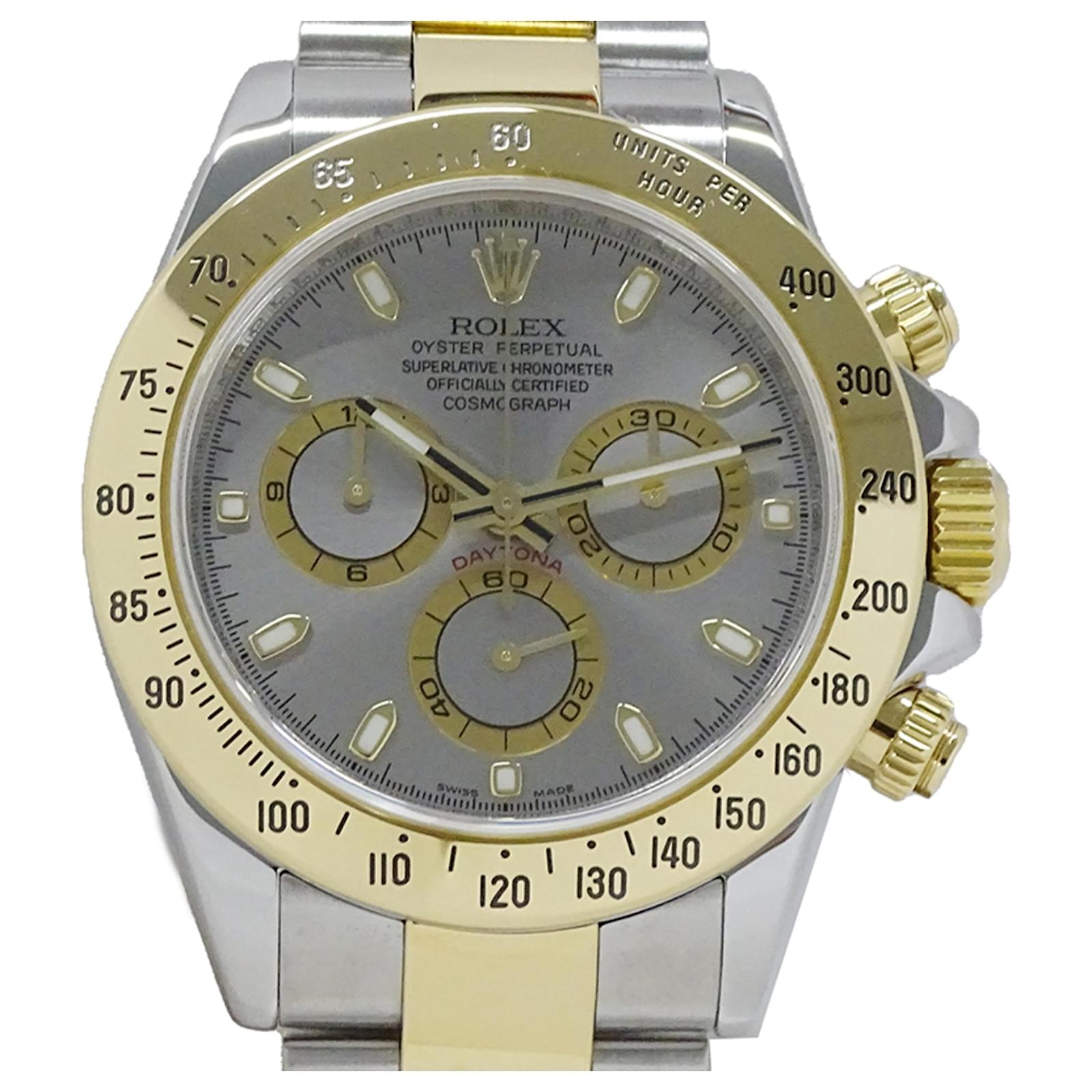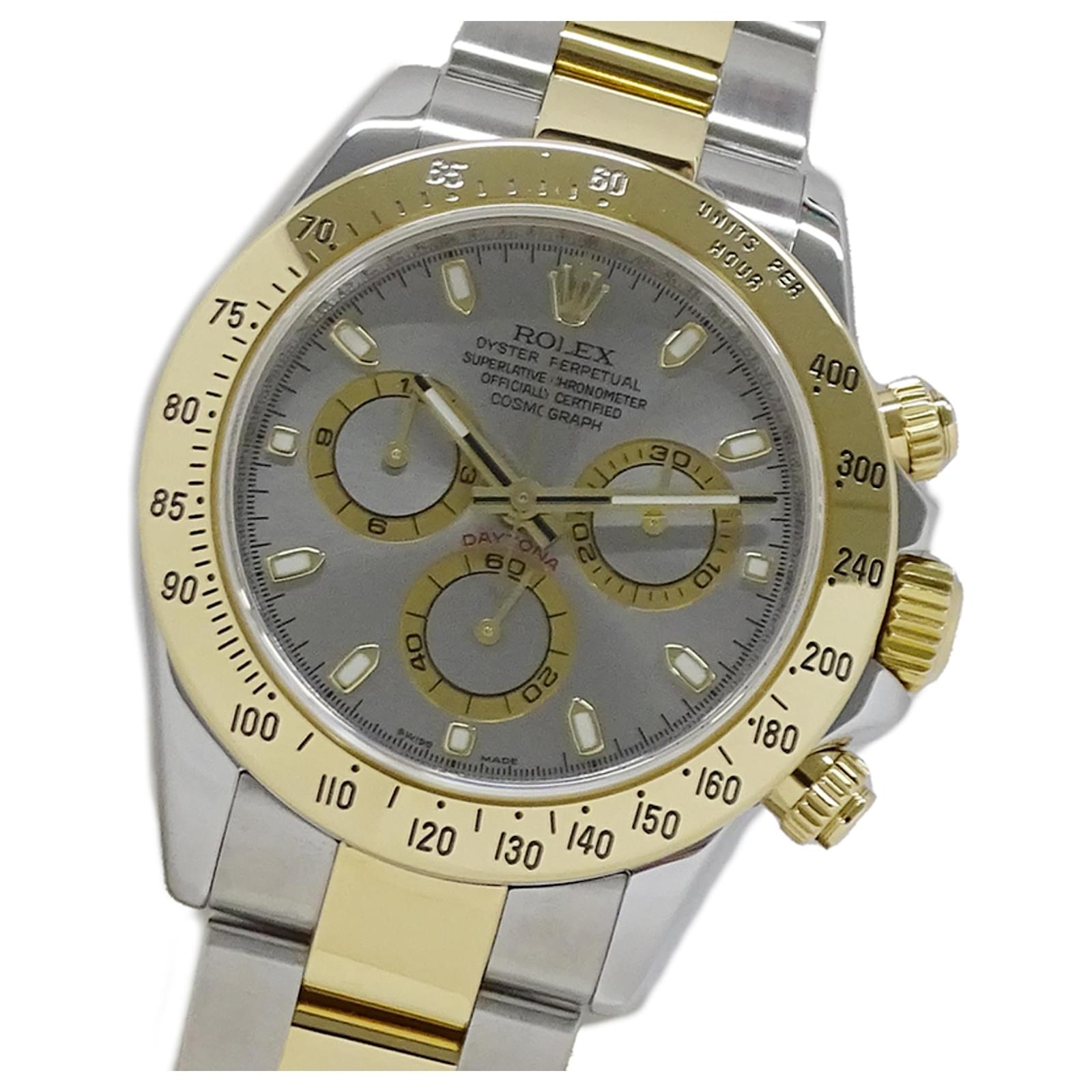 The Rolex Cosmograph Daytona 116523 is a men's automatic wristwatch featuring a gray dial and a case made of stainless steel and yellow gold. With a case diameter of 40mm and a wrist size accommodating up to 19cm (7.48 inches), this timepiece combines elegance with functionality. The watch has been overhauled and polished, ensuring it remains in acceptable condition despite some moderate scratches on the bezel and bracelet. The case back and crown show insignificant wear, while the glass is free from scratches. Included with the watch are a booklet, guarantee card, and both inner and outer boxes. This item originates from Switzerland and is classified as used, with visible traces of usage but still suitable for continued wear. Potential buyers are encouraged to review the provided images for a detailed view of the watch's condition and included accessories.
