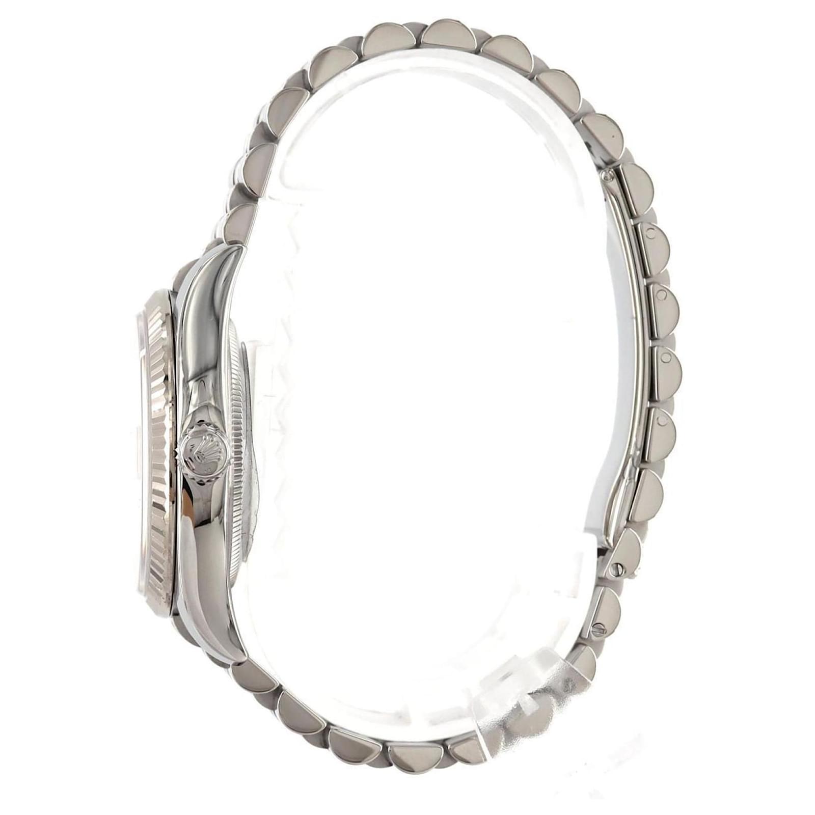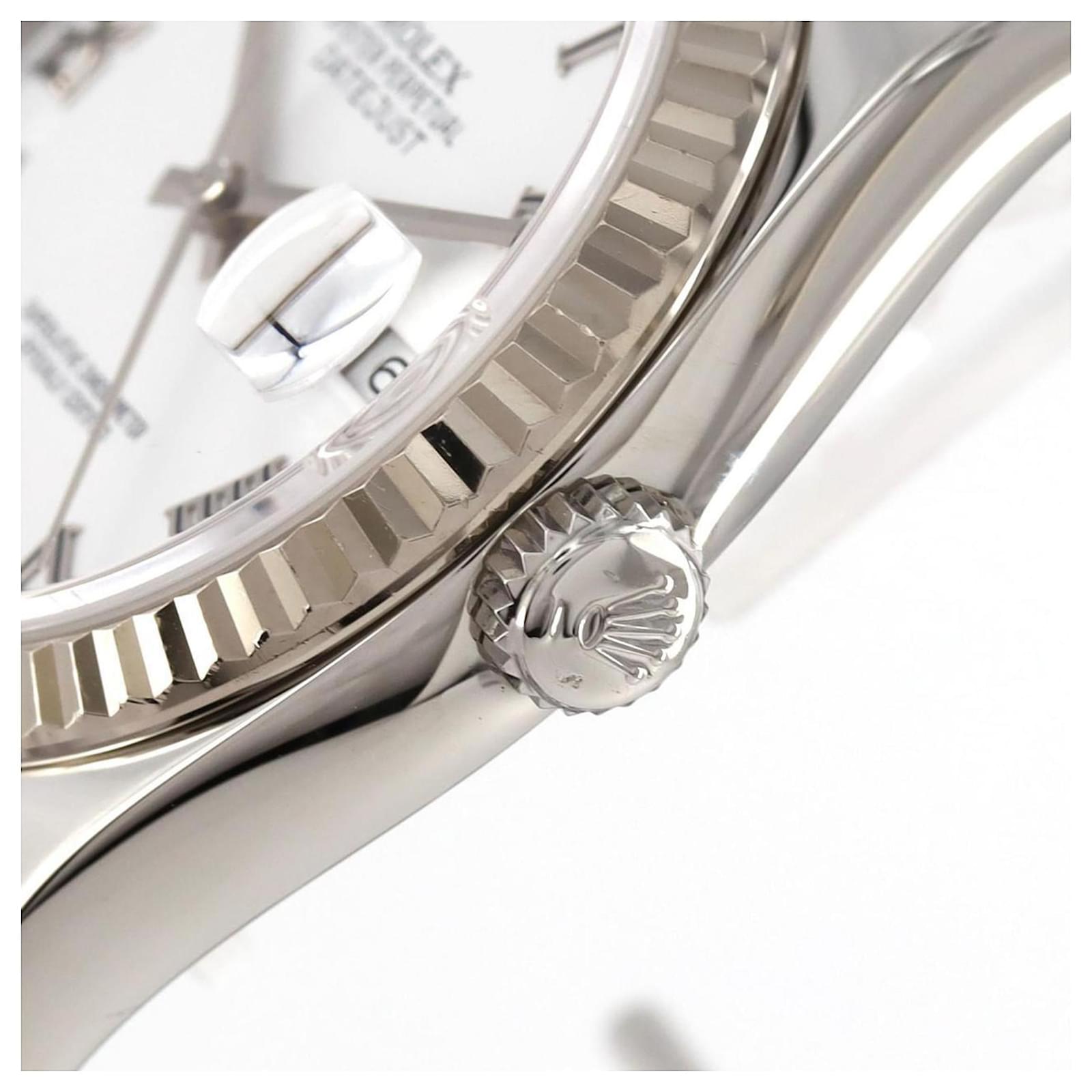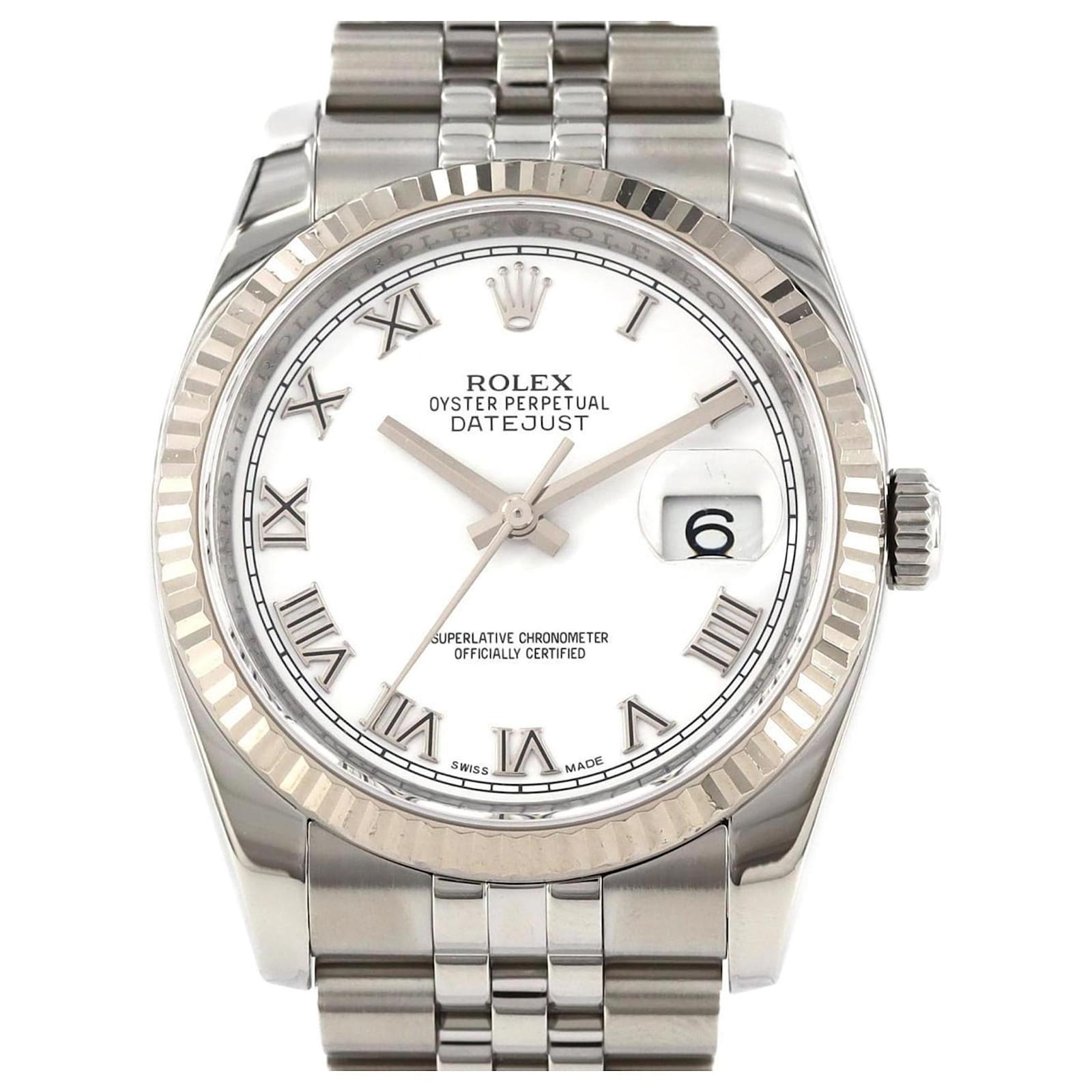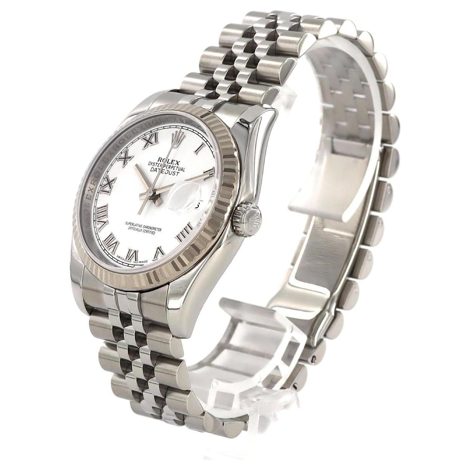 The Rolex Datejust 116234 is a sophisticated wristwatch featuring a white dial and crafted from stainless steel and white gold. This self-winding automatic watch has a case diameter of 36mm and is suitable for a wrist size of 18.5cm (7.28 inches).