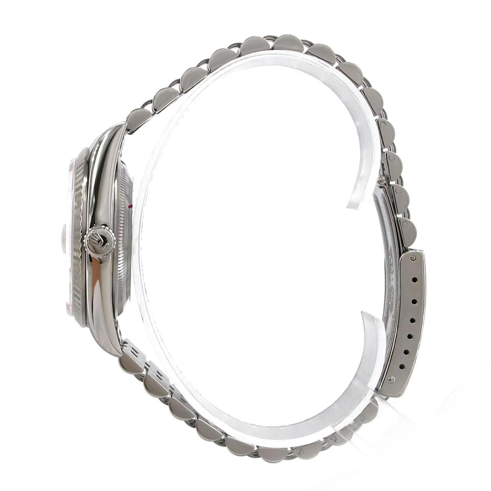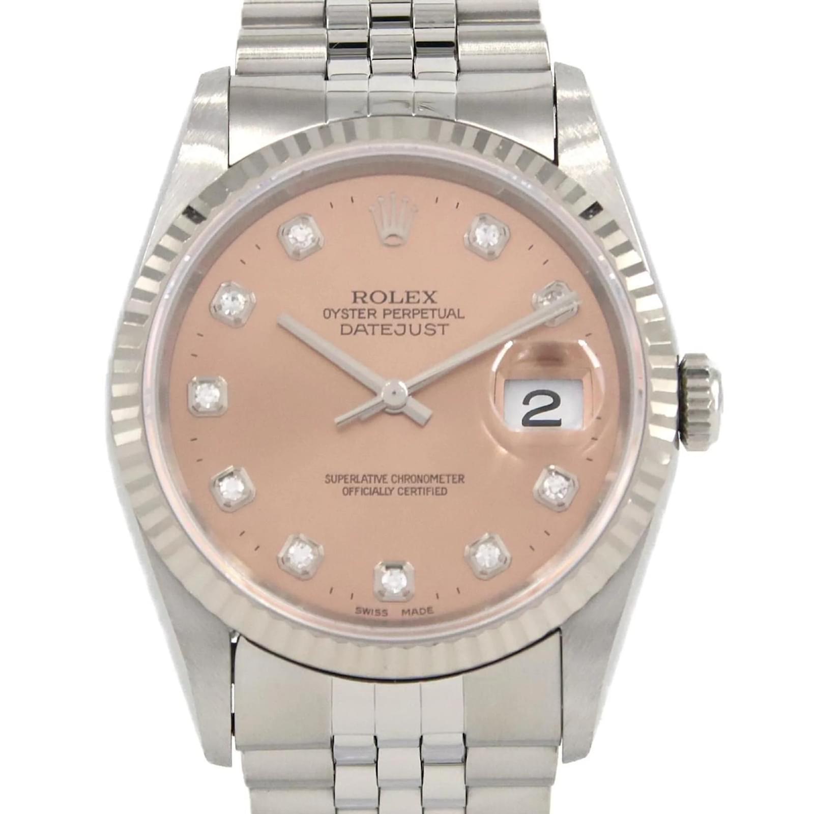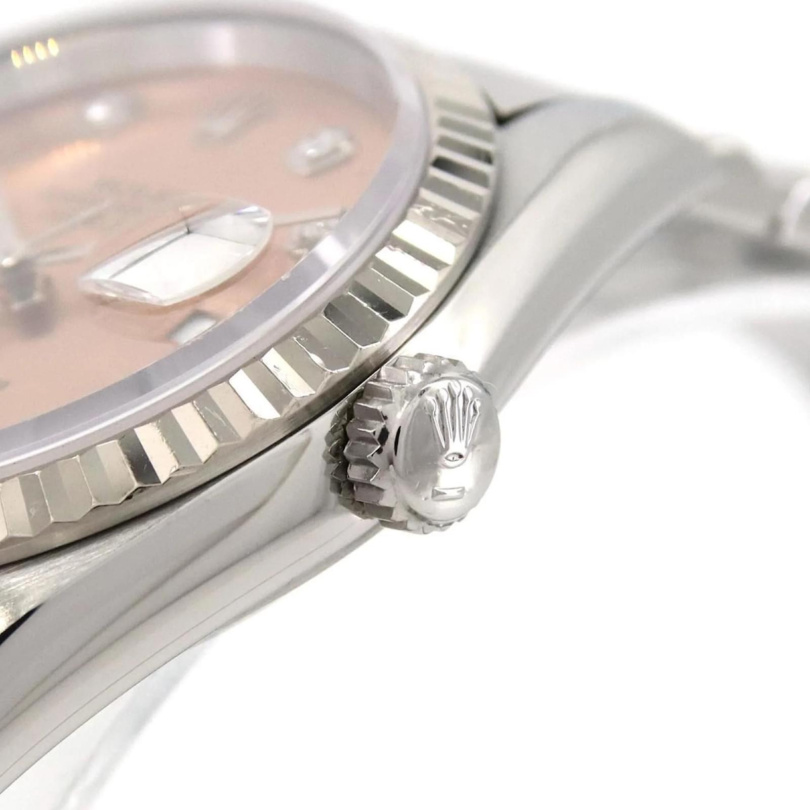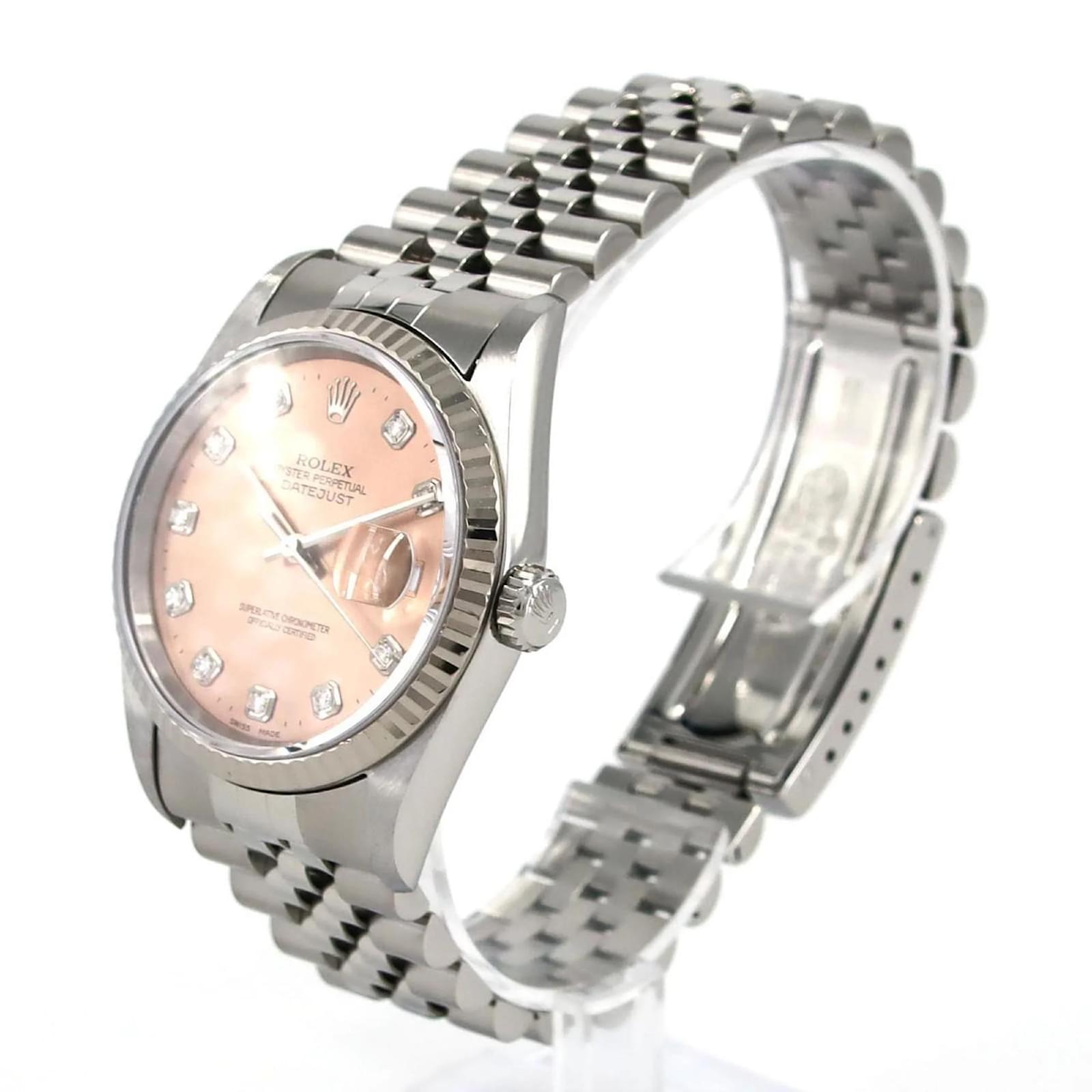 The Rolex Datejust 16234G is a sophisticated wristwatch featuring a pink dial and crafted from stainless steel and white gold. This model is equipped with a self-winding automatic movement and displays the date function prominently. The case diameter measures 36mm, suitable for a wrist size of 19.5cm (7.67 inches).