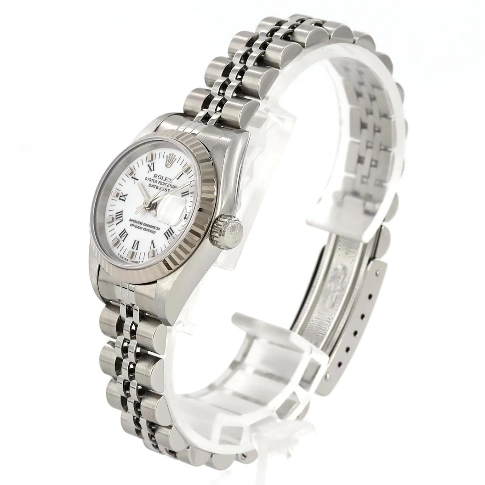The Rolex Datejust 69174 is a sophisticated wristwatch featuring a white dial and a combination case made of stainless steel and 18K white gold. This automatic timepiece has a case diameter of 26mm and is designed to fit a wrist size of 17.5cm (6.88 inches). The watch showcases an analog display and is complemented by a printed stainless steel band.