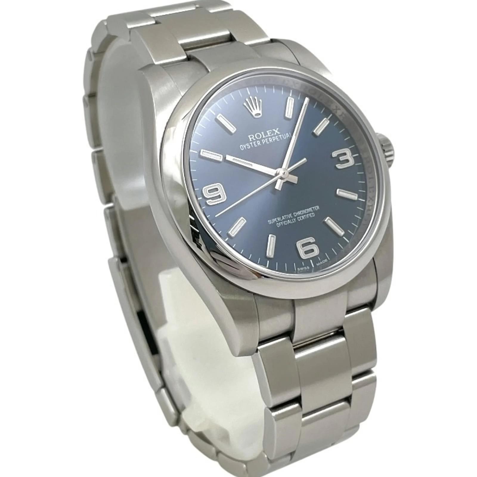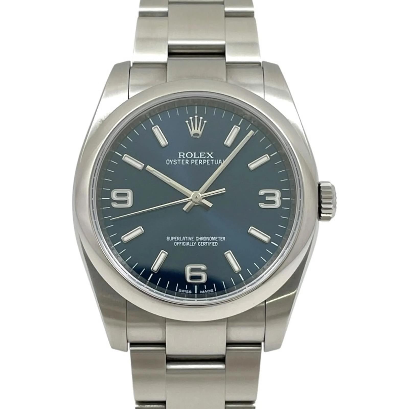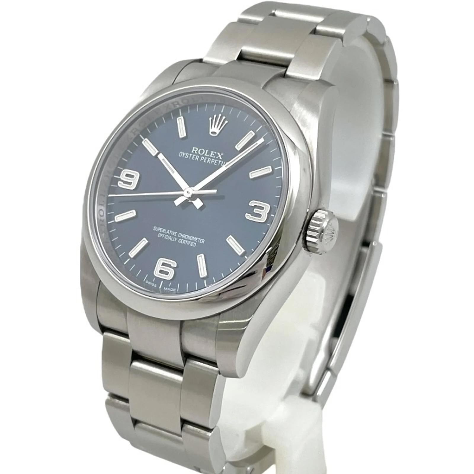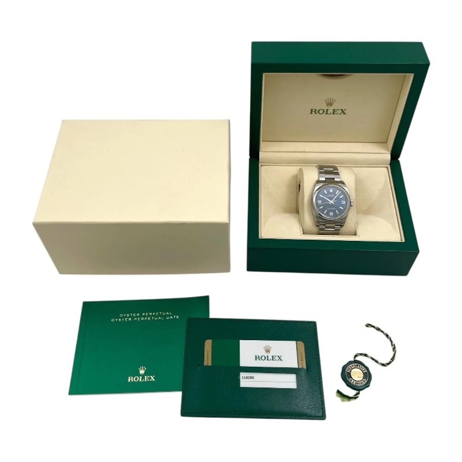 The Rolex Oyster Perpetual 116000 is a stainless steel wristwatch designed for men, featuring a blue dial with a unique 369 layout. This model, part of the 2019 collection, operates on a self-winding automatic movement. The watch has a case diameter of 36mm and is suitable for a wrist size of 17.5cm (6.88 inches).
